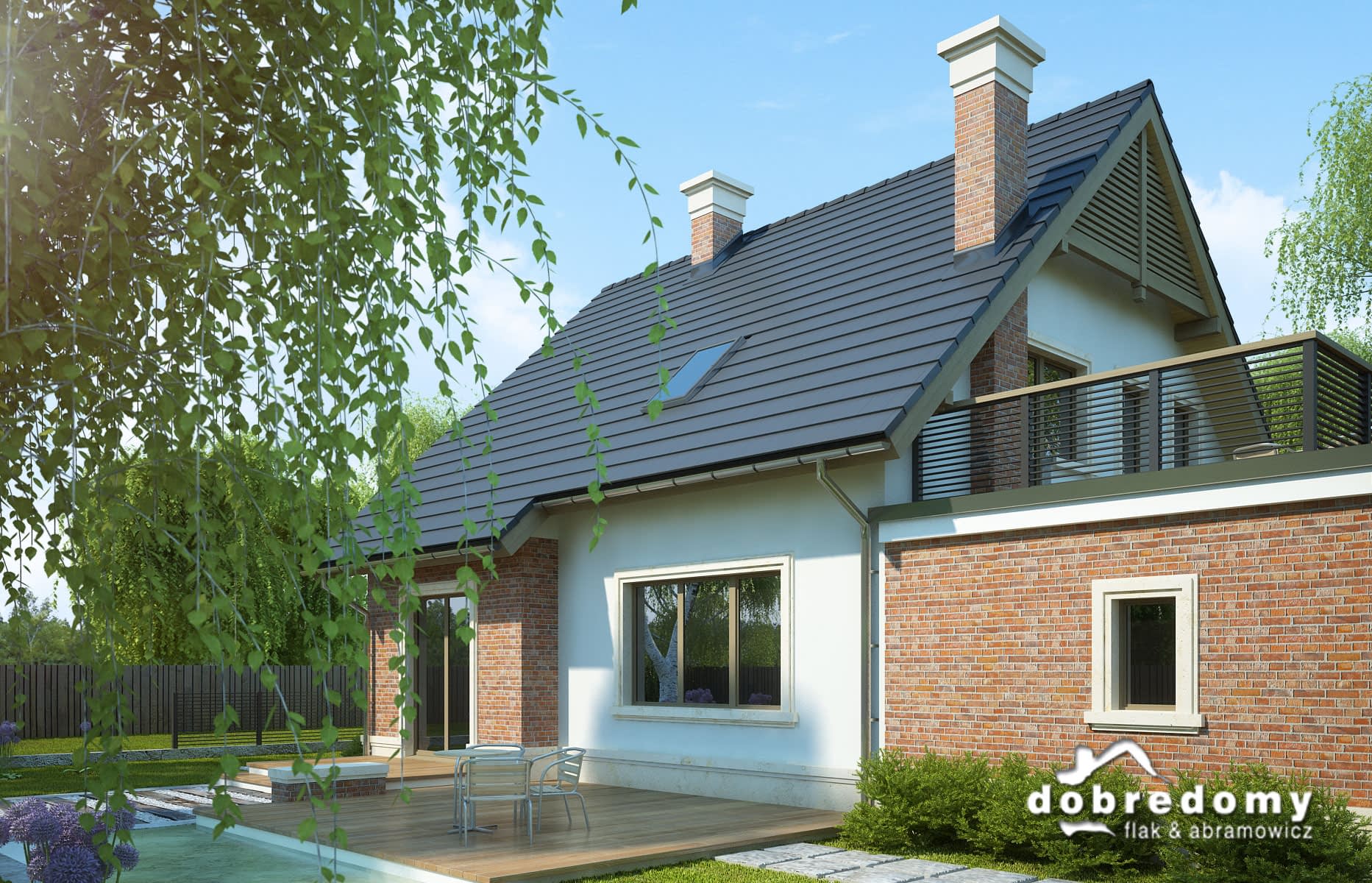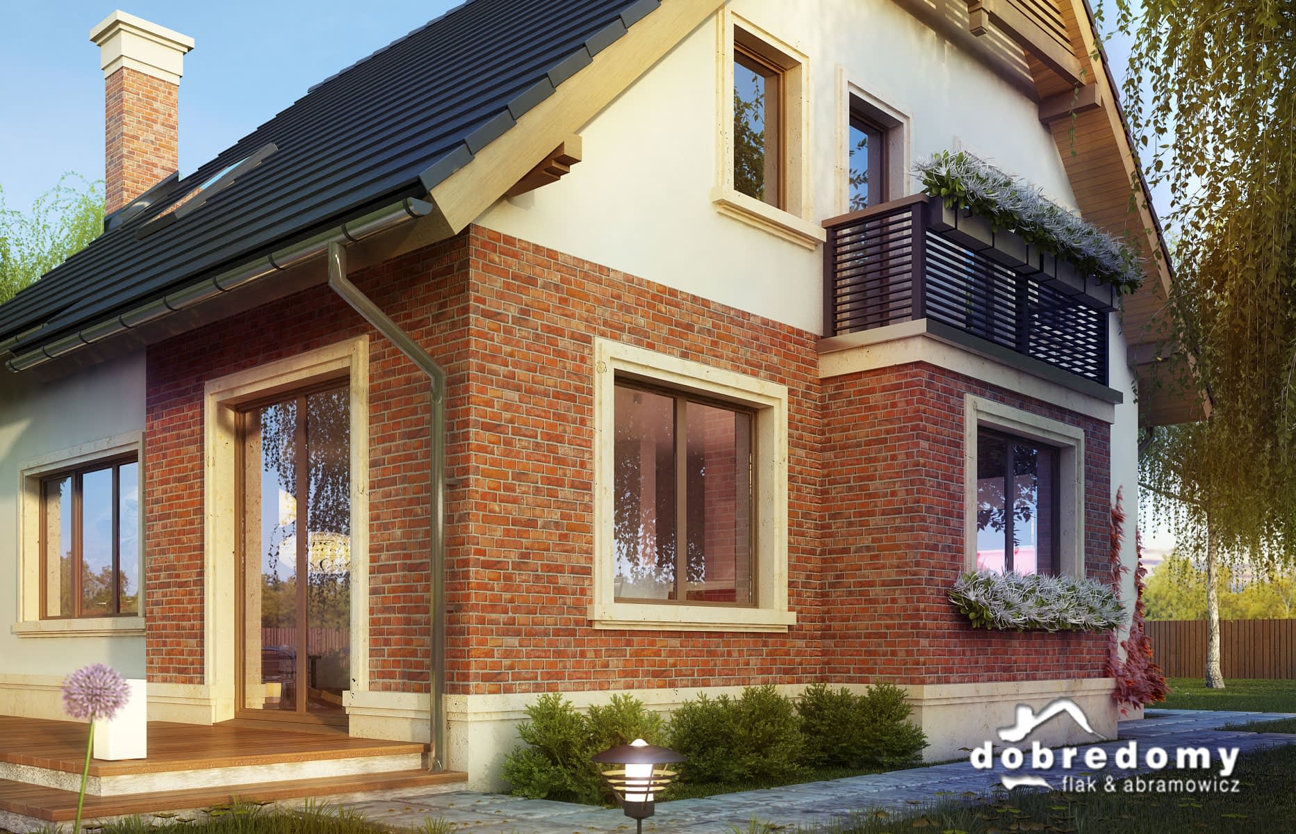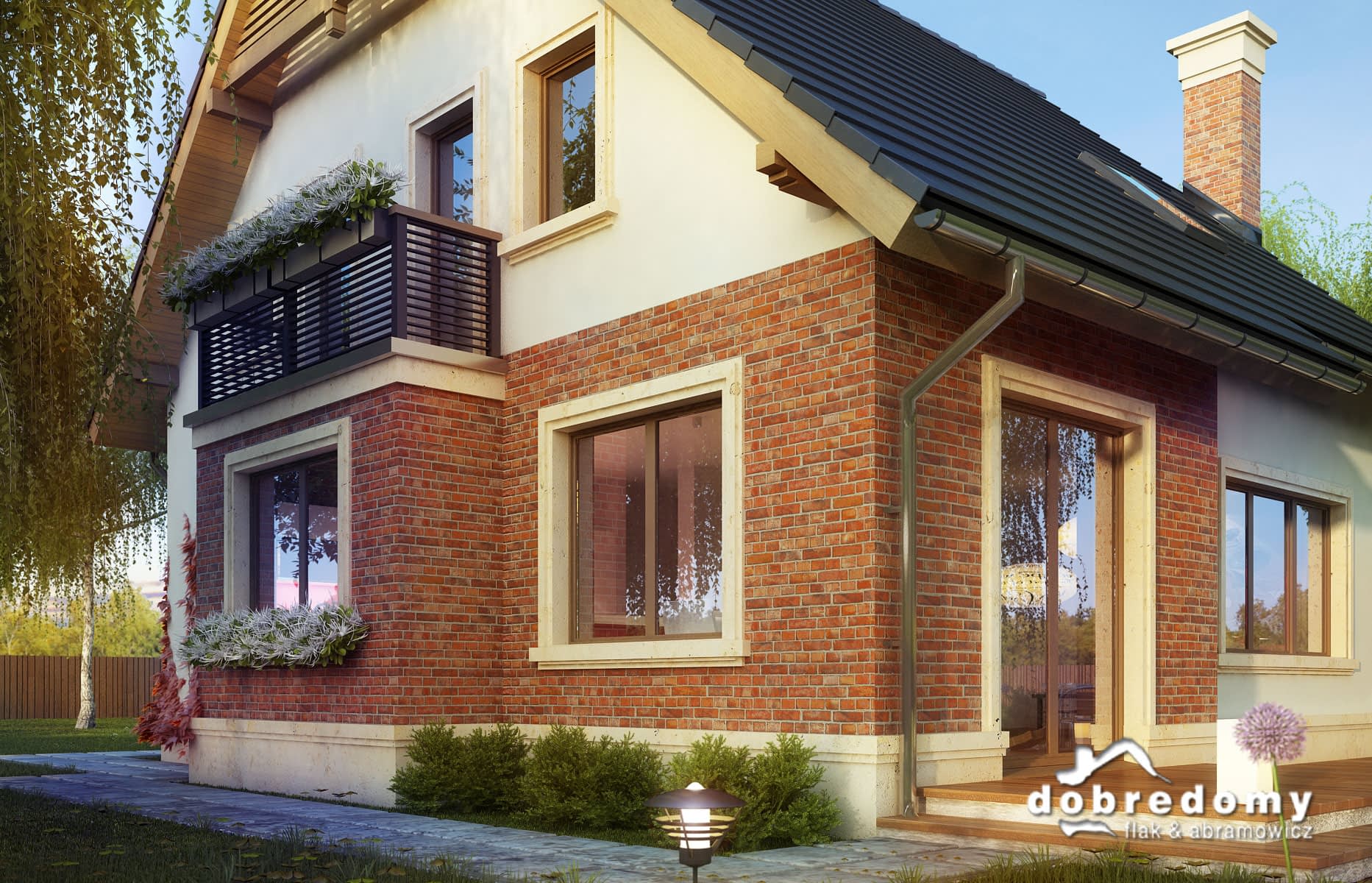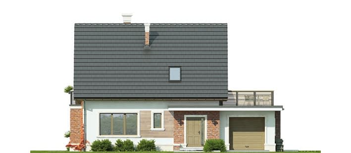 Elewacje pokryte tynkiem strukturalnym w systemie ociepleń Termo Organika i płytkami klinkierowymi. W projekcie zastosowano okna dachowe marki FAKRO. Pokrycie dachu - dachówka ceramiczna lub cementowa CREATON.
