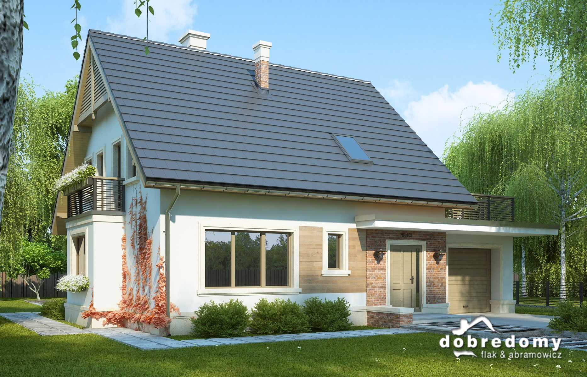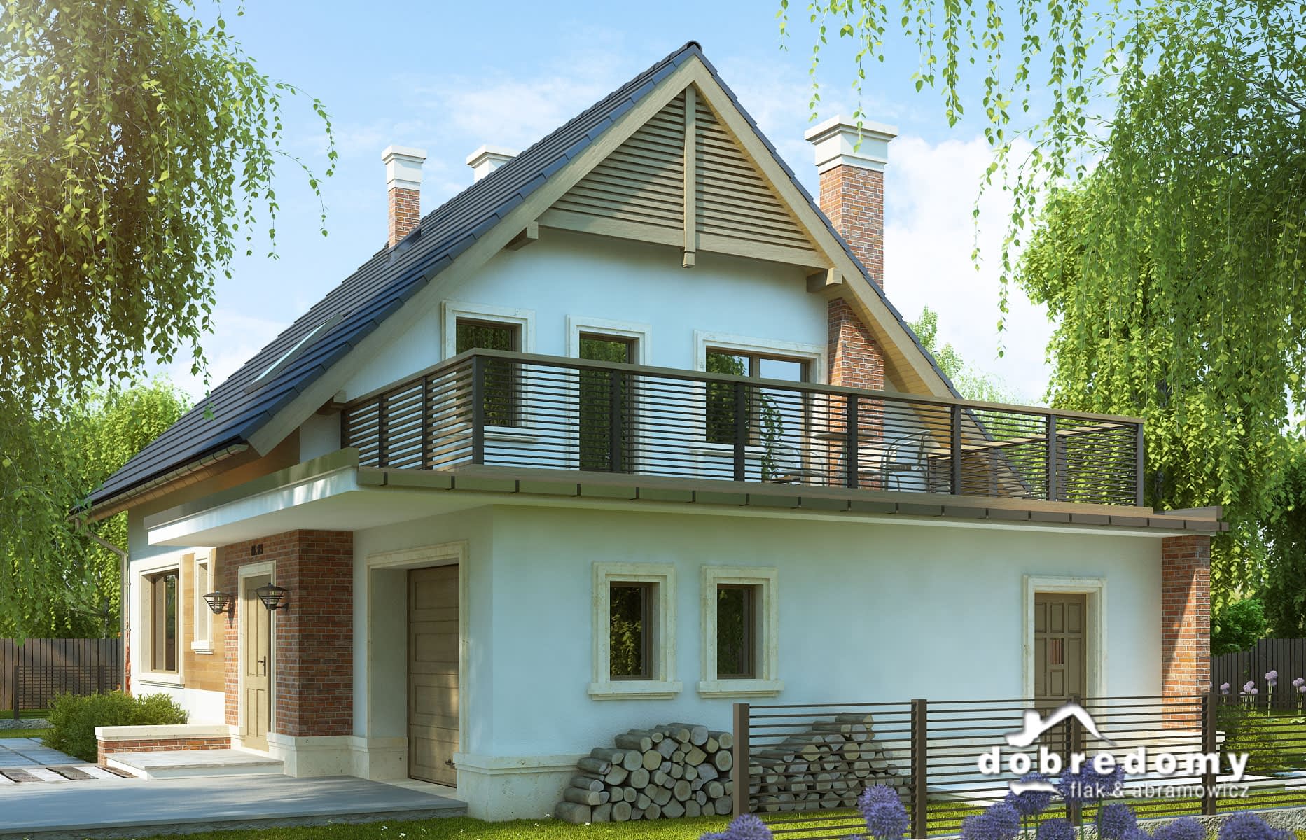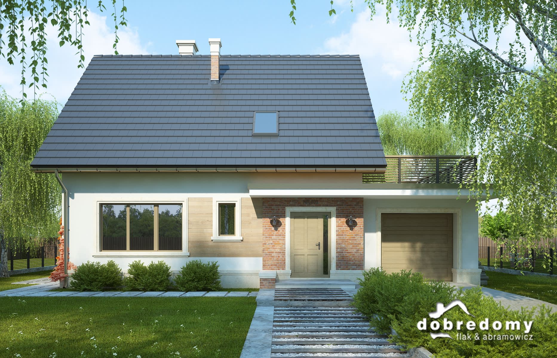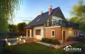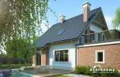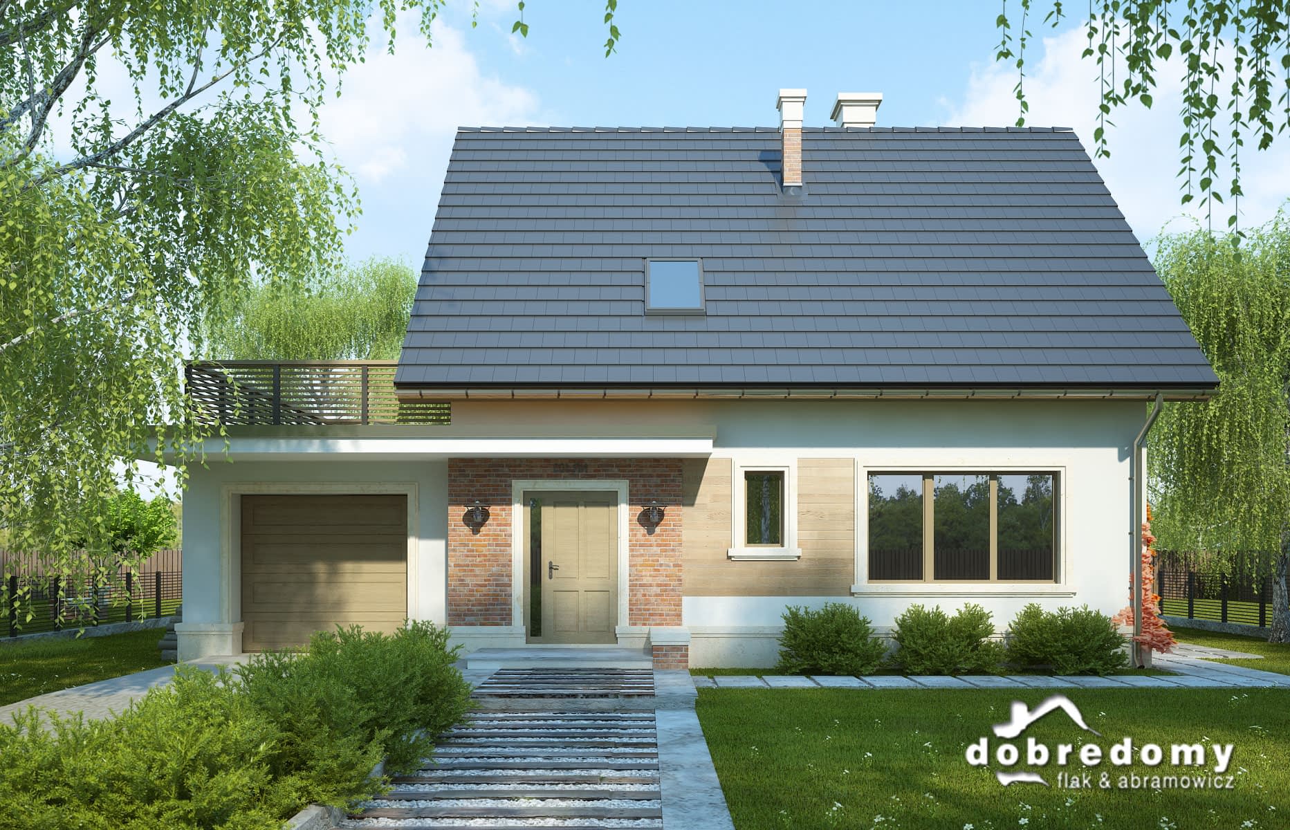Dom z użytkowym poddaszem, przeznaczony dla 4-6-osobowej rodziny. Na parterze znajduje się pokój dzienny przestrzennie połączony z jadalnią posiadającą wyjście na ogród. Wygodna kuchnia może być połączona z jadalnią lub całkowicie zamknięta. Z hallu dostępne są również: gabinet, łazienka oraz schody prowadzące na poddasze. Jednostanowiskowy garaż posiada bezpośrednie przejście do pomieszczenia gospodarczego. Na poddaszu znajdują się trzy pokoje, łazienka z pralką oraz przestronny taras nad garażem. Projekt można wykorzystać do zabudowy bliźniaczej.