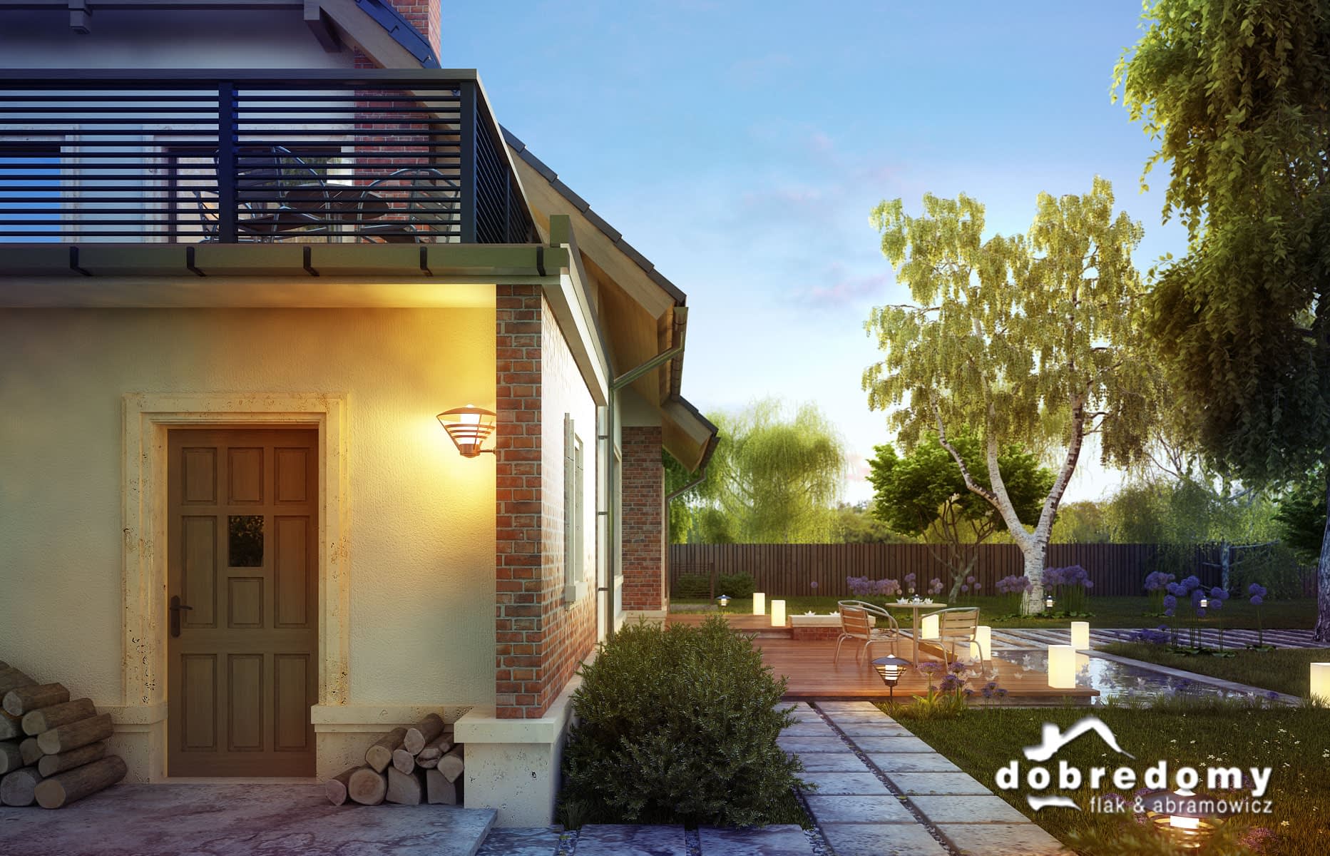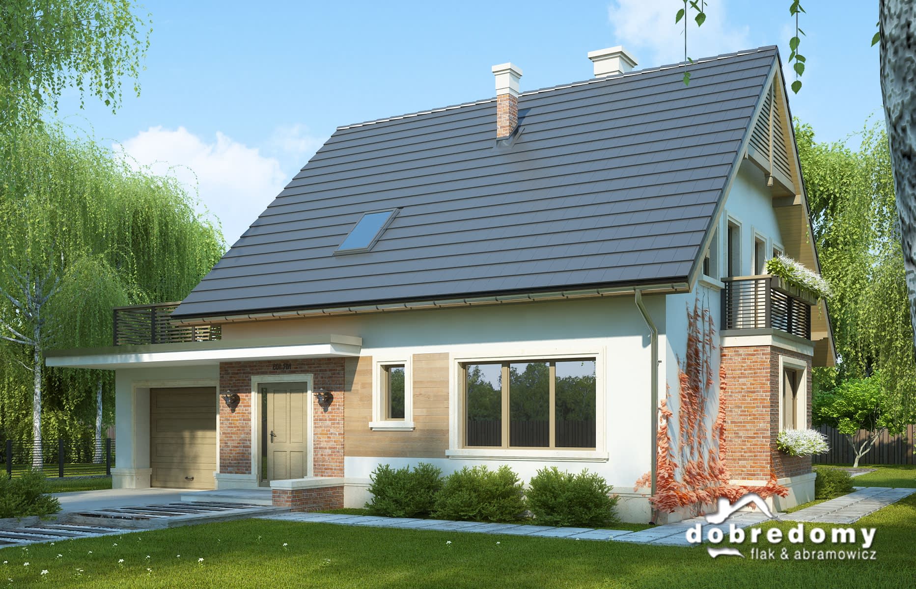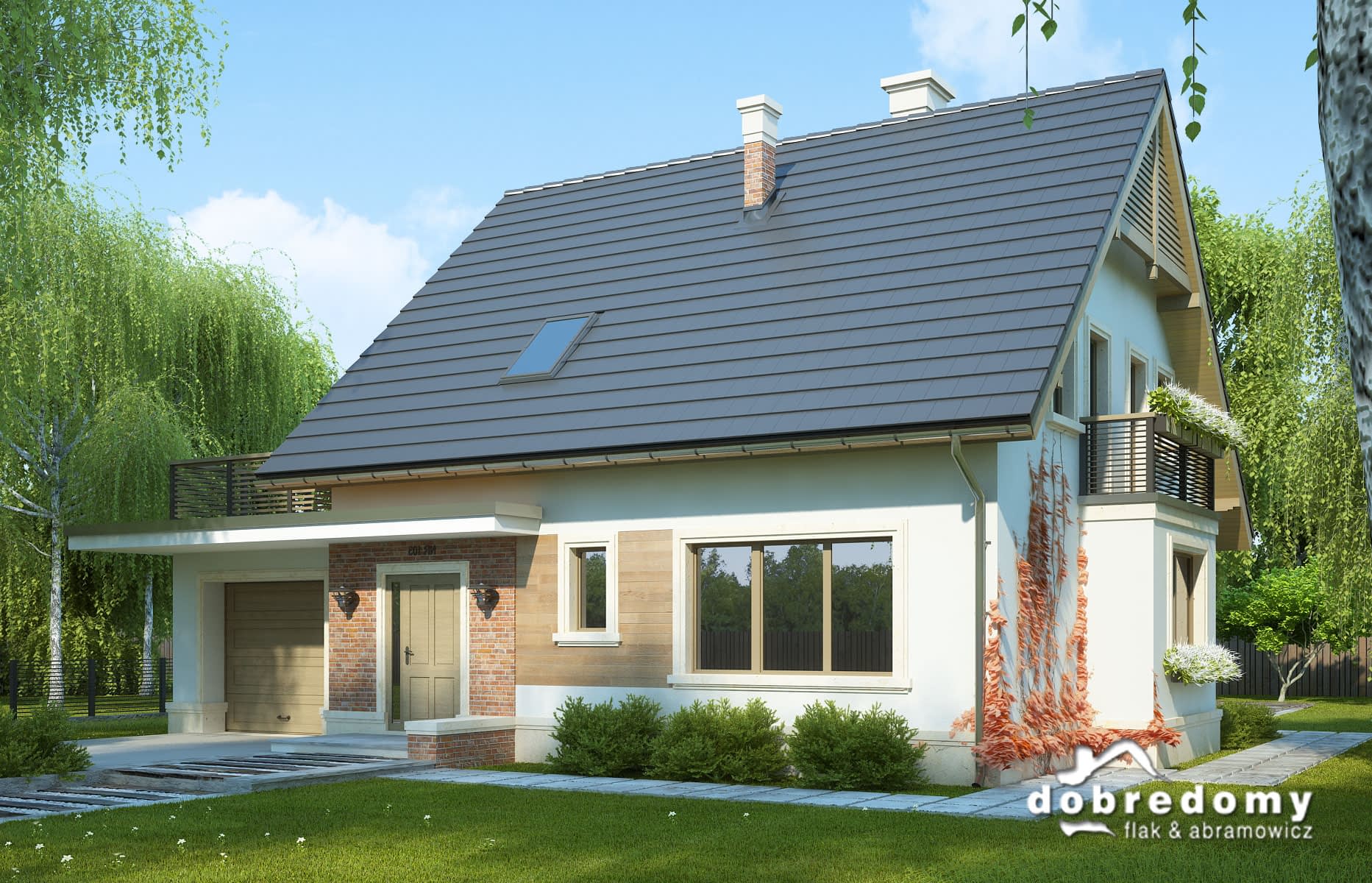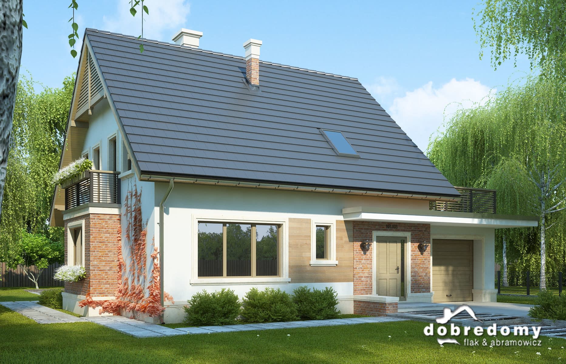 Dom z użytkowym poddaszem, przeznaczony dla 4-6-osobowej rodziny. Na parterze znajduje się pokój dzienny przestrzennie połączony z jadalnią posiadającą wyjście na ogród. Wygodna kuchnia może być połączona z jadalnią lub całkowicie zamknięta. Z hallu dostępne są również: gabinet, łazienka oraz schody prowadzące na poddasze. Jednostanowiskowy garaż posiada bezpośrednie przejście do pomieszczenia gospodarczego. Na poddaszu znajdują się trzy pokoje, łazienka z pralką oraz przestronny taras nad garażem. Projekt można wykorzystać do zabudowy bliźniaczej.