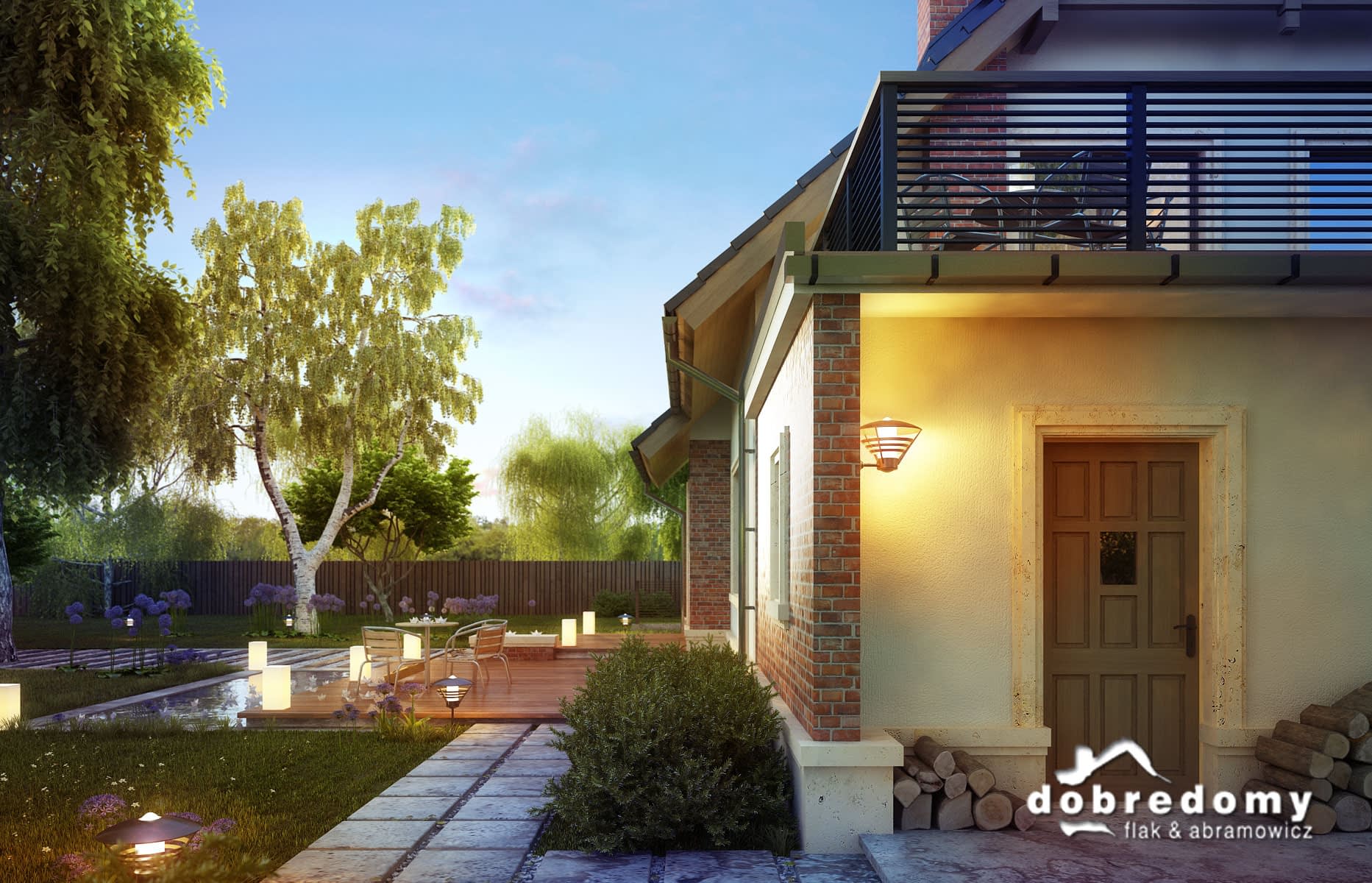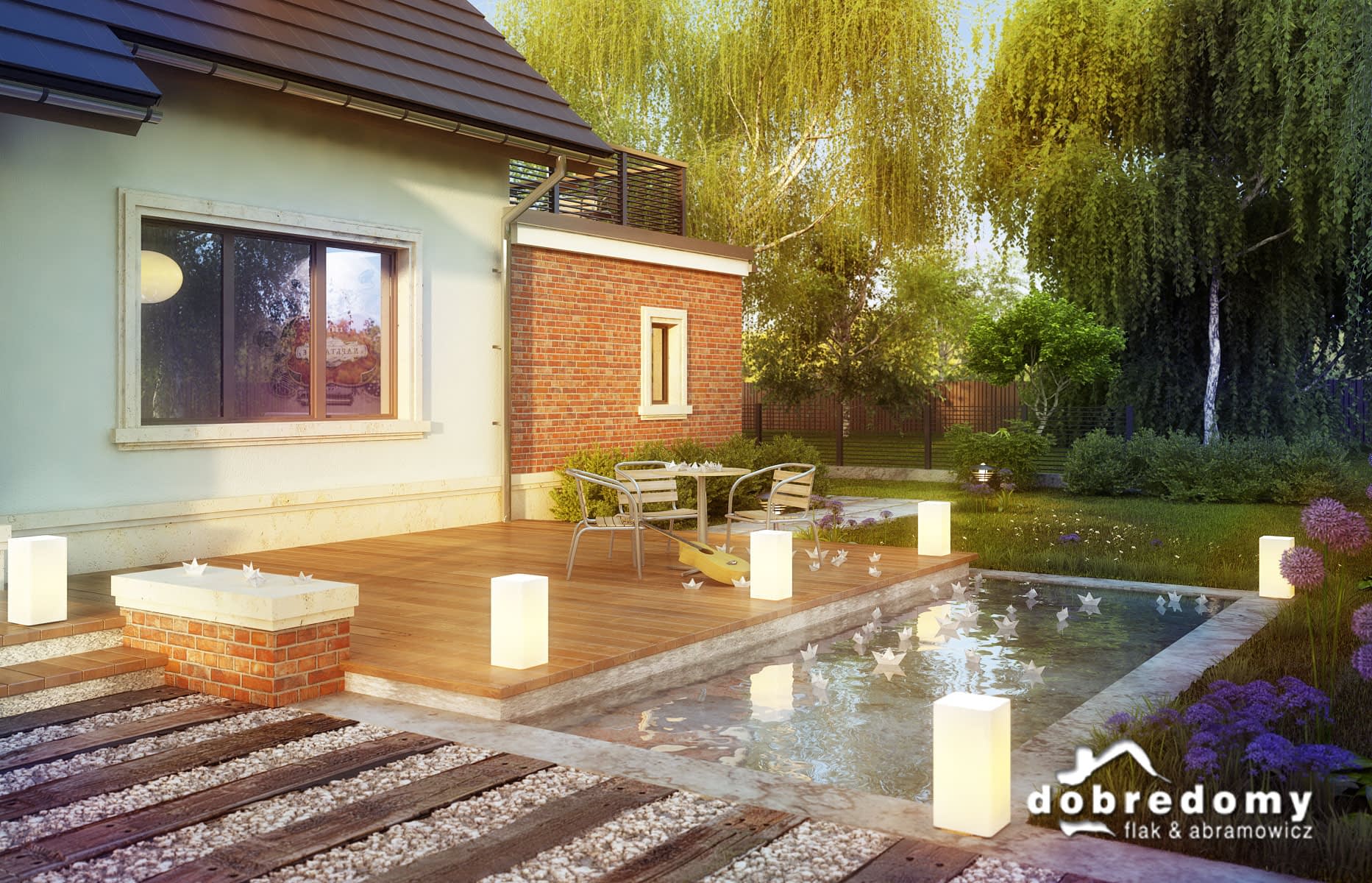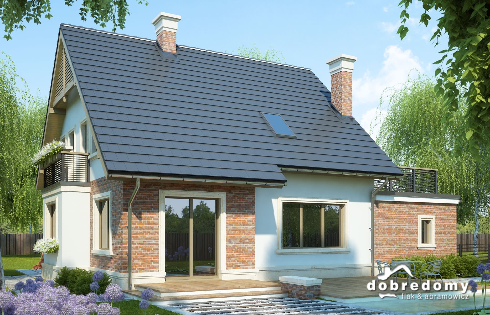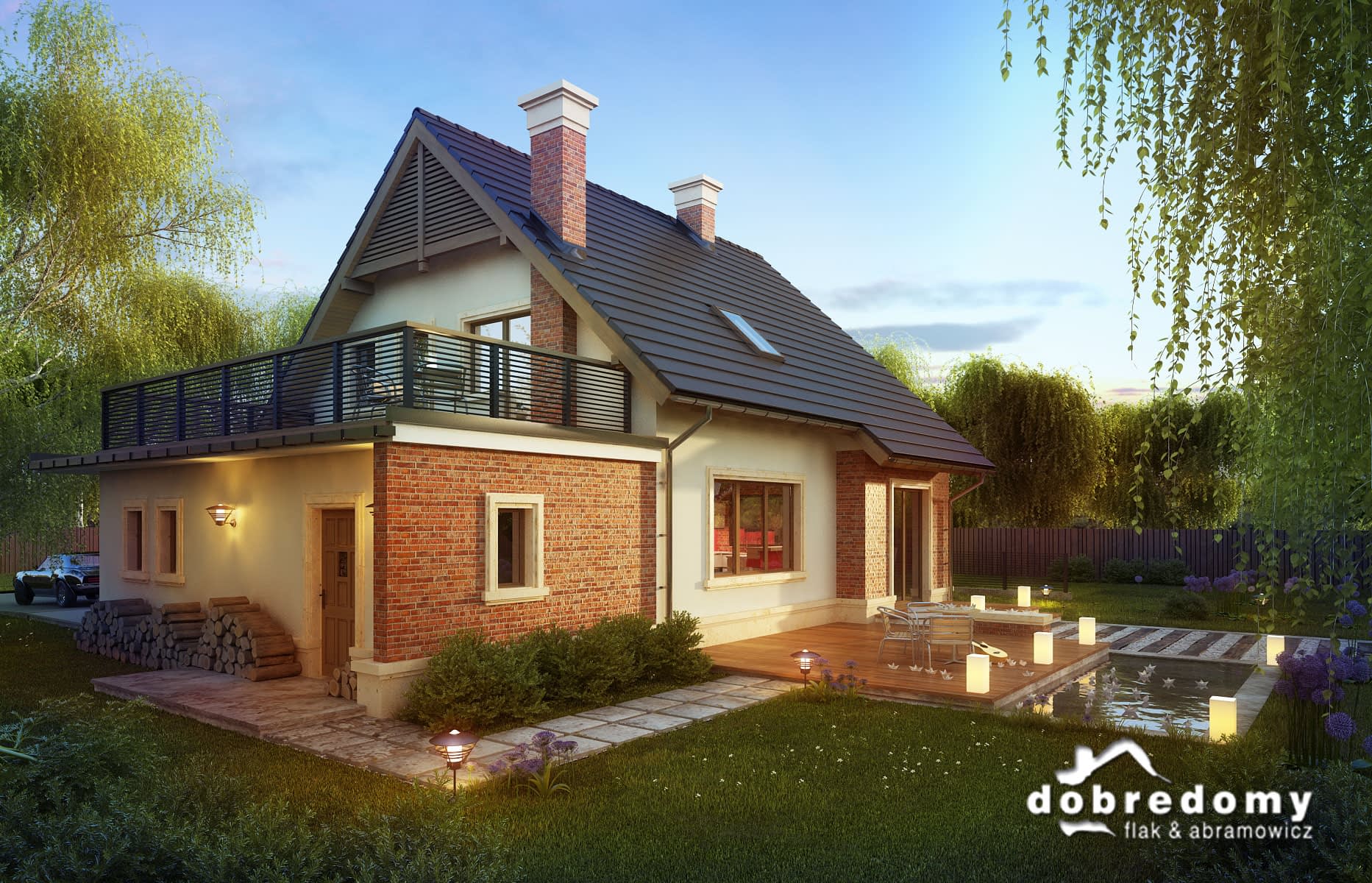 Dom z użytkowym poddaszem, przeznaczony dla 4-6-osobowej rodziny. Na parterze znajduje się pokój dzienny przestrzennie połączony z jadalnią posiadającą wyjście na ogród. Wygodna kuchnia może być połączona z jadalnią lub całkowicie zamknięta. Z hallu dostępne są również: gabinet, łazienka oraz schody prowadzące na poddasze. Jednostanowiskowy garaż posiada bezpośrednie przejście do pomieszczenia gospodarczego. Na poddaszu znajdują się trzy pokoje, łazienka z pralką oraz przestronny taras nad garażem. Projekt można wykorzystać do zabudowy bliźniaczej.