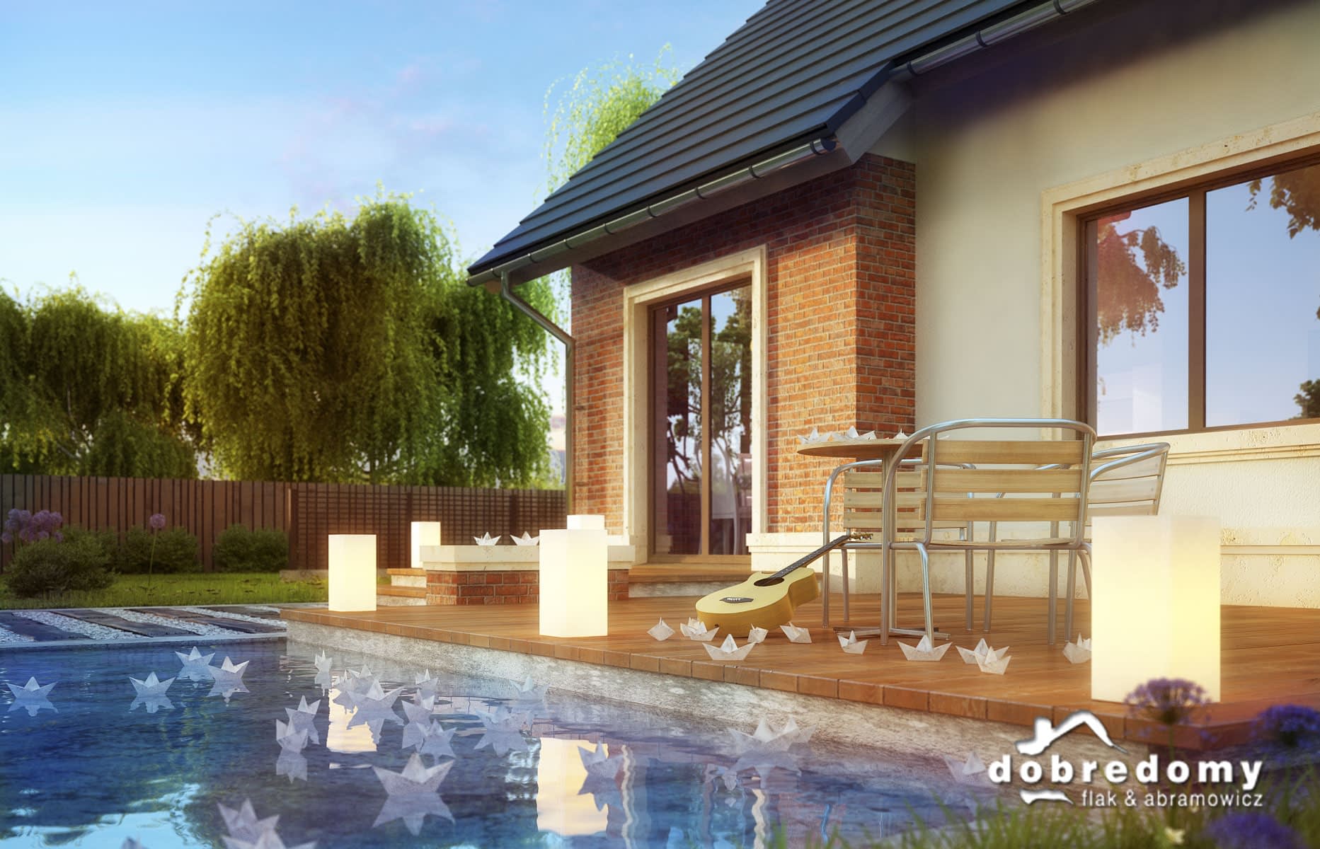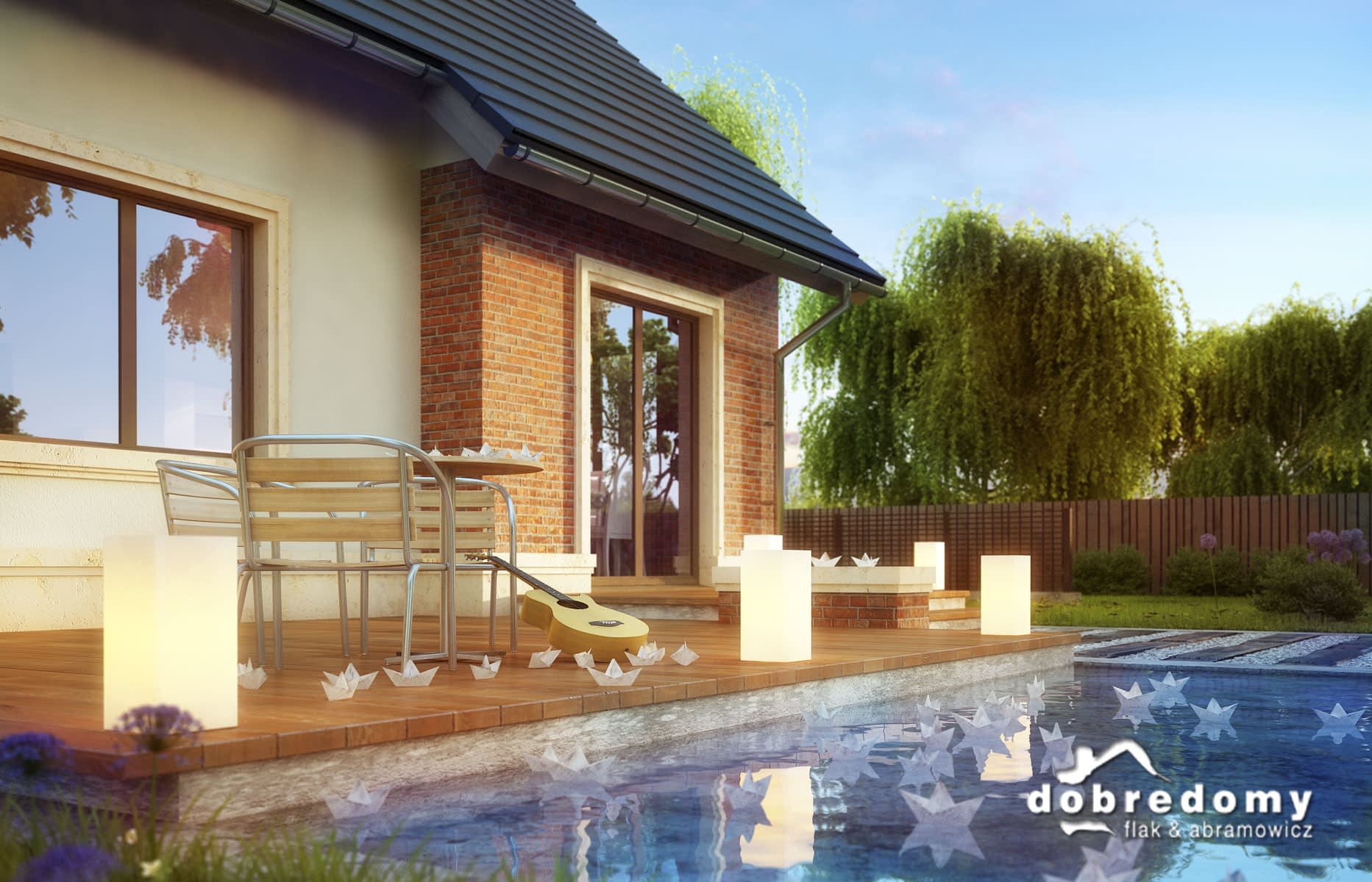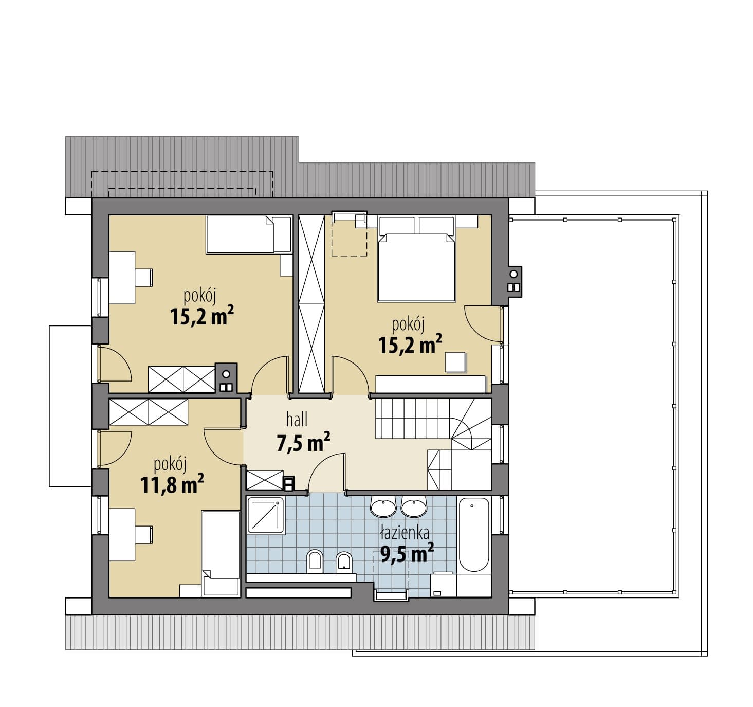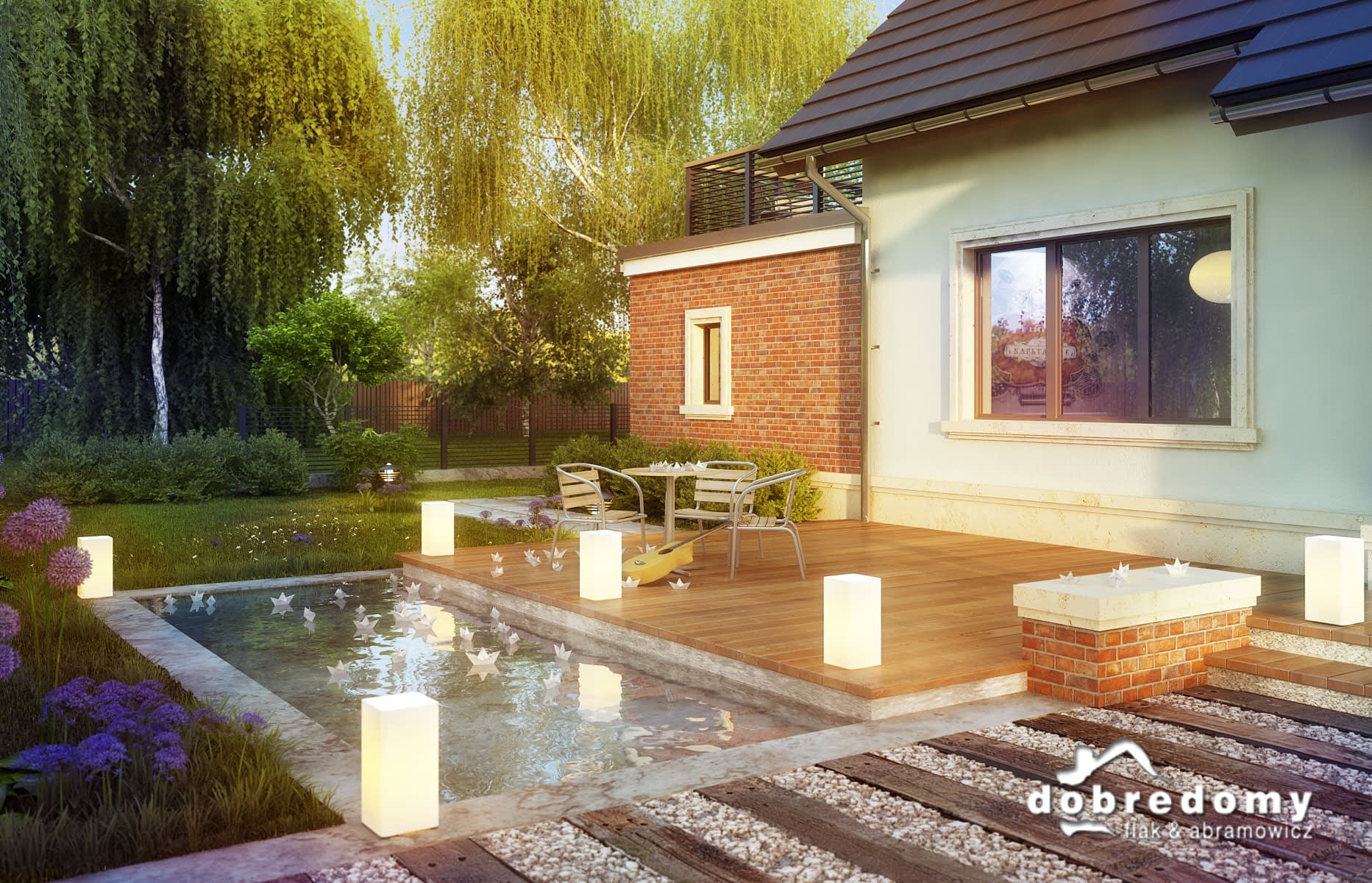 Dom z użytkowym poddaszem, przeznaczony dla 4-6-osobowej rodziny. Na parterze znajduje się pokój dzienny przestrzennie połączony z jadalnią posiadającą wyjście na ogród. Wygodna kuchnia może być połączona z jadalnią lub całkowicie zamknięta. Z hallu dostępne są również: gabinet, łazienka oraz schody prowadzące na poddasze. Jednostanowiskowy garaż posiada bezpośrednie przejście do pomieszczenia gospodarczego. Na poddaszu znajdują się trzy pokoje, łazienka z pralką oraz przestronny taras nad garażem. Projekt można wykorzystać do zabudowy bliźniaczej.