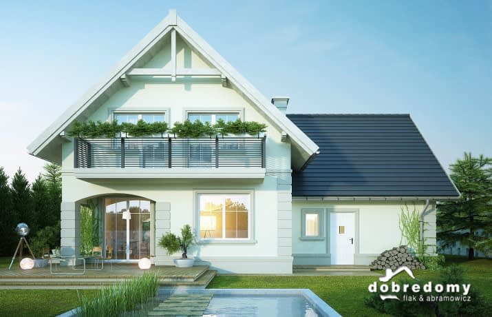 Dom z użytkowym poddaszem, dla 4-5-osobowej rodziny. Na parterze znajdują się: pokój dzienny połączony z jadalnią, kuchnia, łazienka, pokój gościnny/gabinet oraz duże pomieszczenie gospodarcze dostępne z garażu dwustanowiskowego. Na poddaszu zaprojektowano trzy pokoje, przestronną łazienkę oraz obszerny strych, który można zaadaptować na dodatkowy pokój. Projekt dostępny w wersji z garażem jednostanowiskowym - Milena. Projekt może być wykorzystany do zabudowy bliźniaczej.