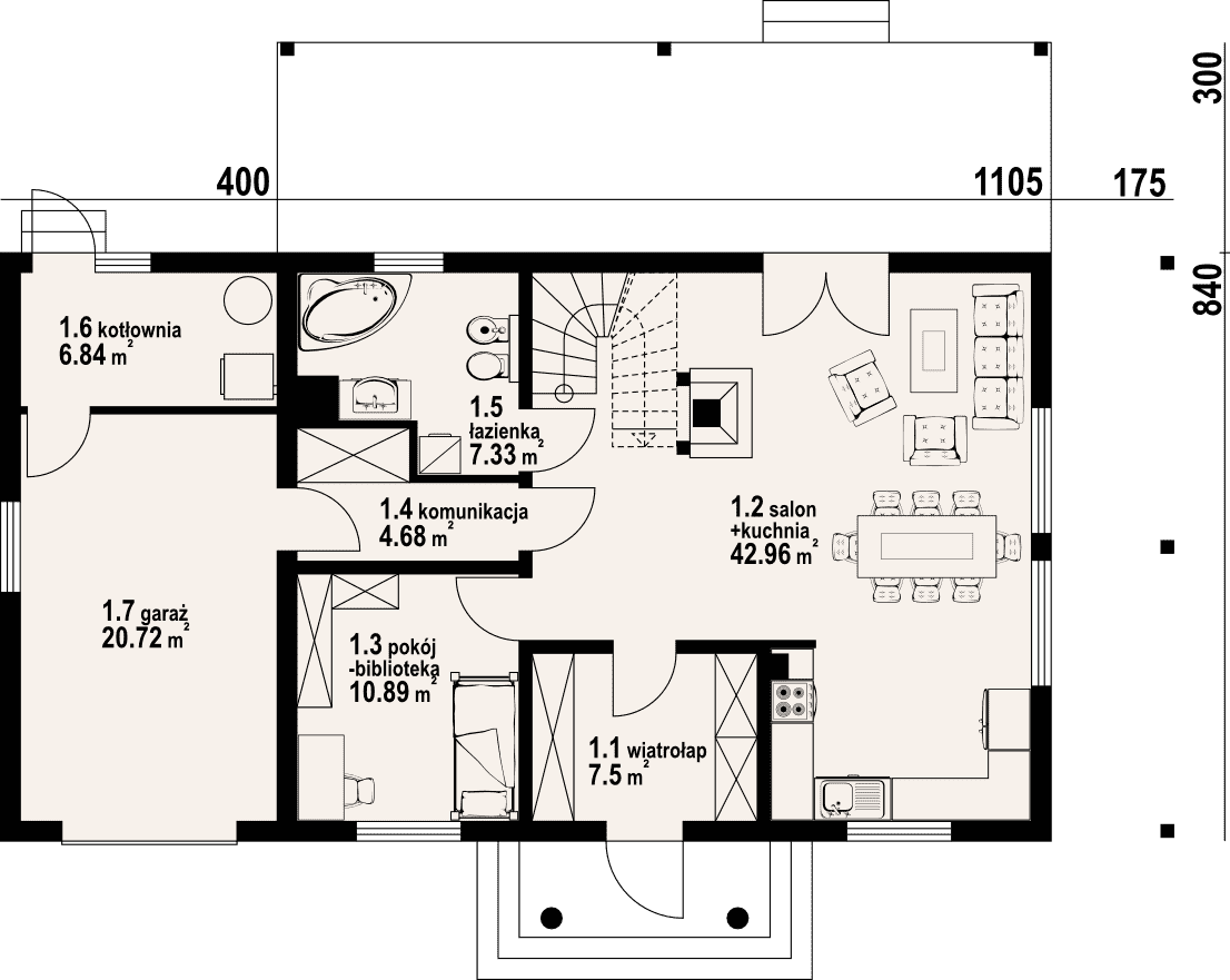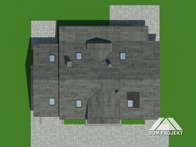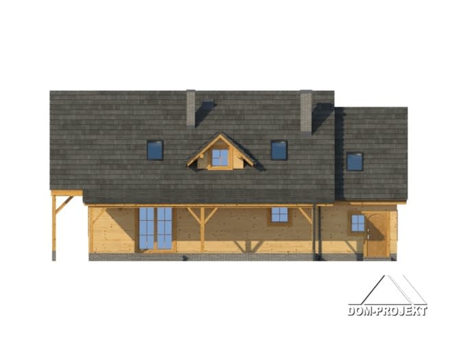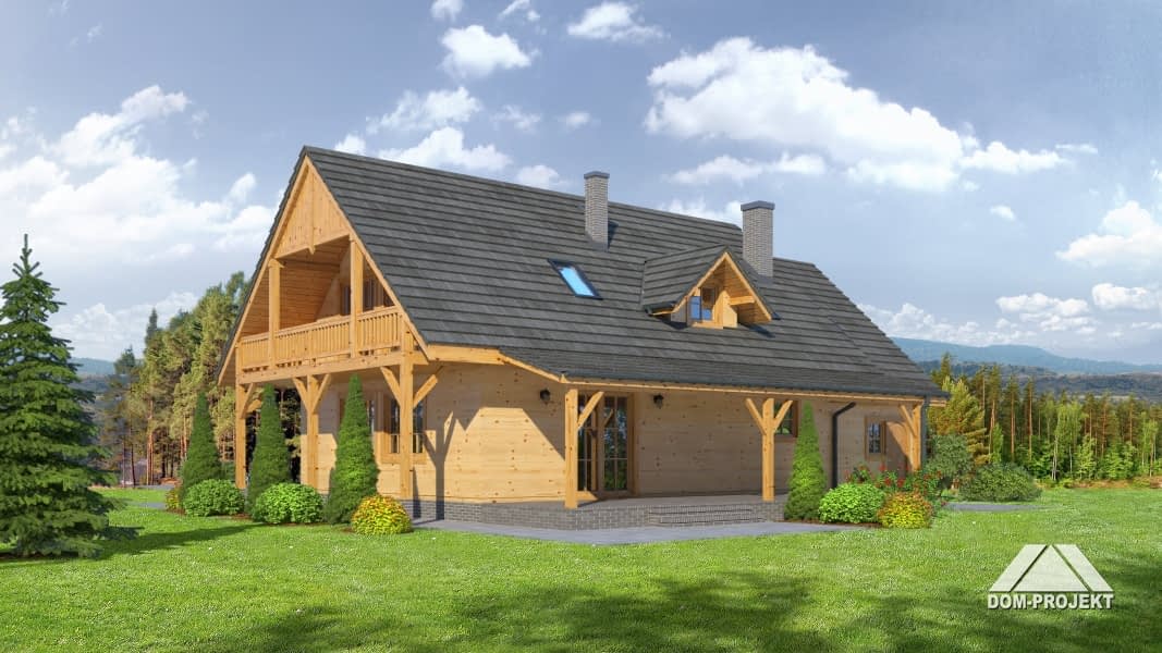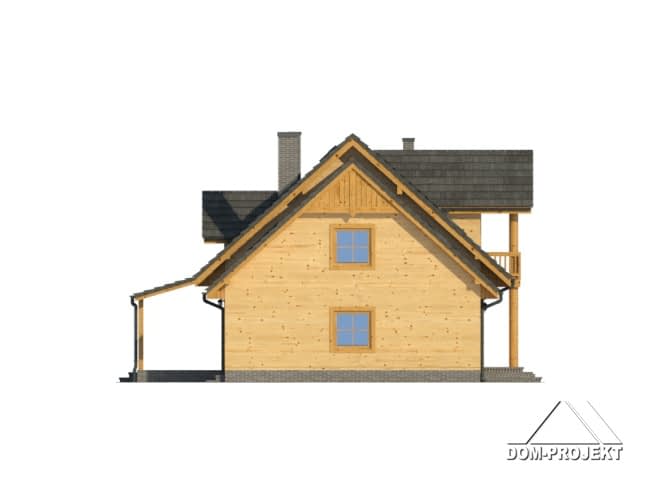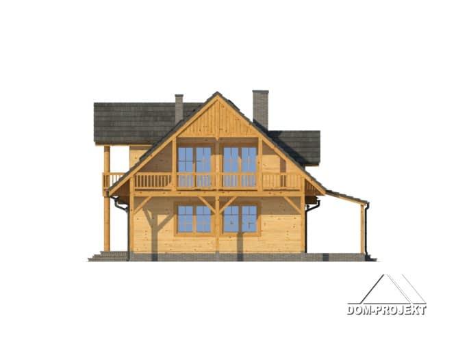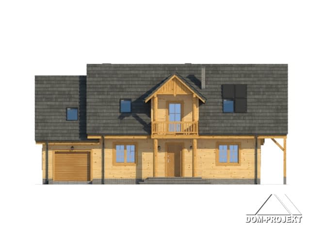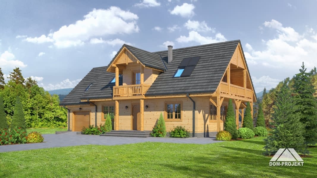 Dom w konstrukcji szkieletu drewnianego. Duży salon z aneksem kuchennym, kominkiem, schodami na poddasze i wyjściem na zadaszony taras. Łazienka, pokój,wiatrołap, przejście do garażu, garaż, kotłownia. Na poddaszu cztery pokoje, łazienka i komunikacja. Dwa balkony.Rzuty