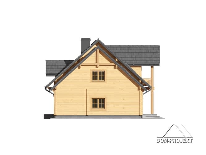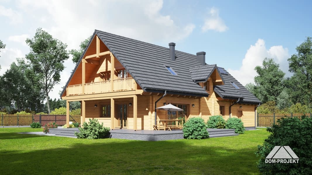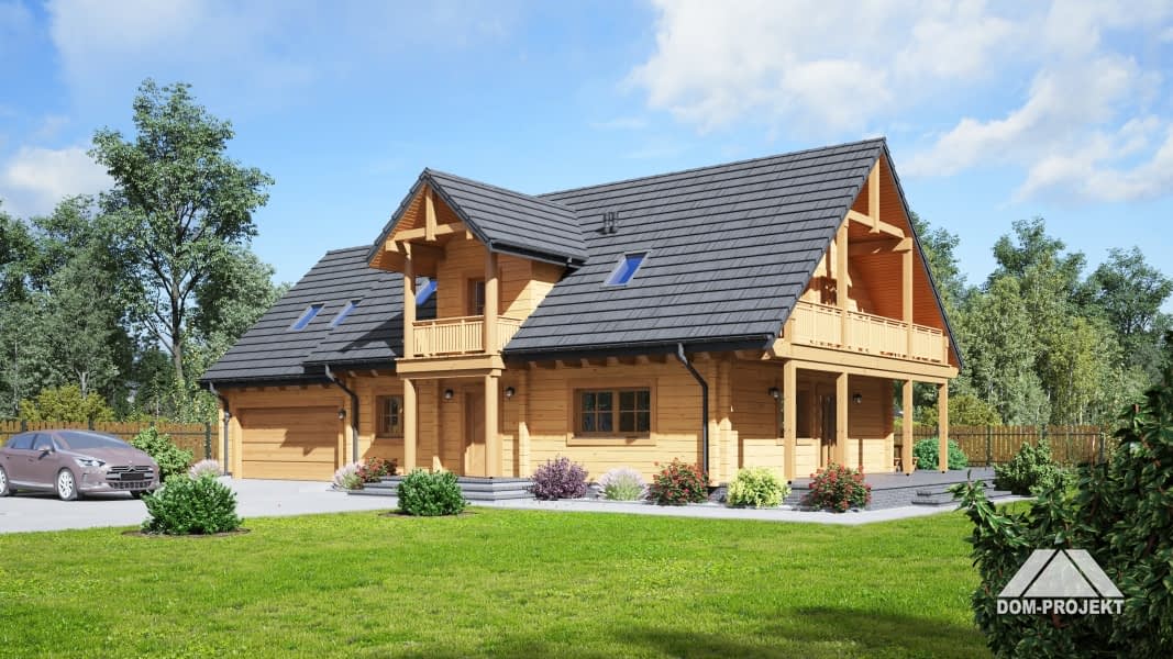 Dom z bali drewnianych. Duży salon z aneksem kuchennym, kominkiem , wyjściem na zadaszony taras i schodami na poddasze. Pokój, łazienka, komunikacja, wiatrołap, kotłownia i garaż na dwa samochody. Na poddaszu trzy pokoje, łazienka, komunikacja i dwa balkony. Zwarta bryła budynku sprzyja szybkiej i taniej budowie i niskim kosztom eksploatacji.Rzuty