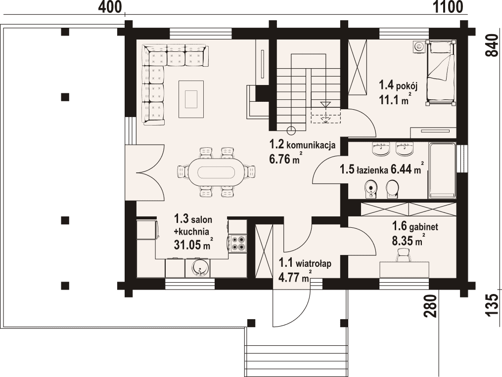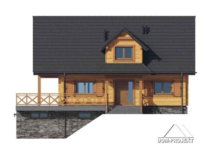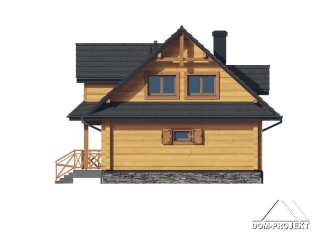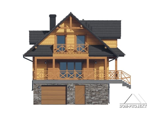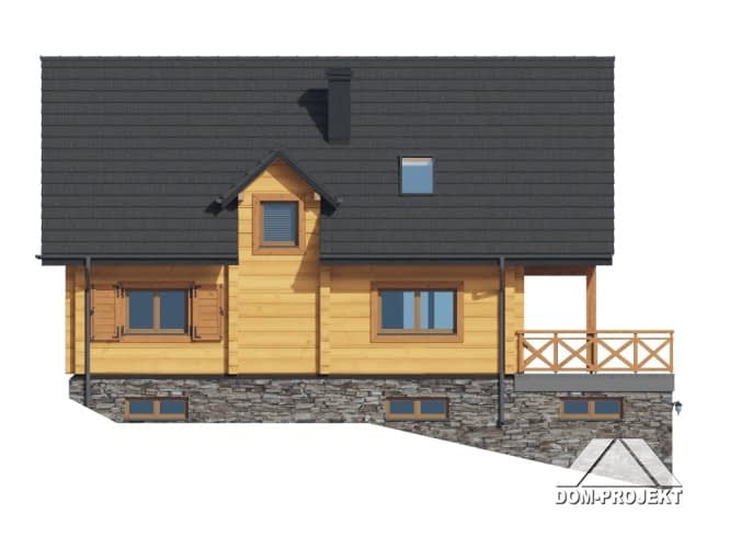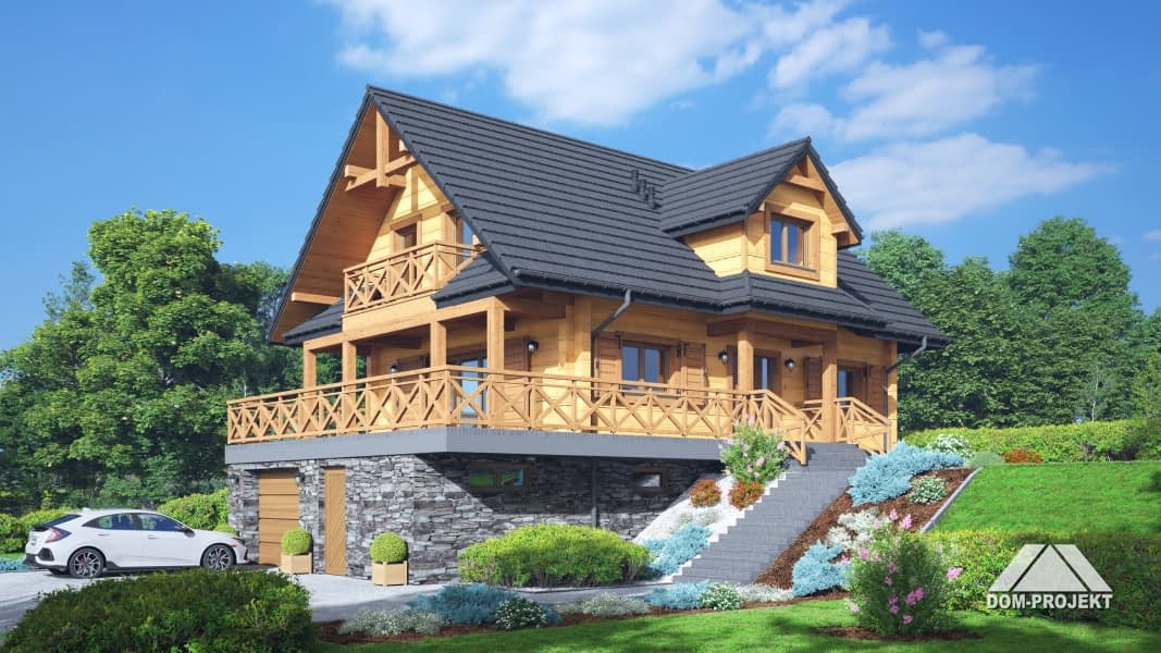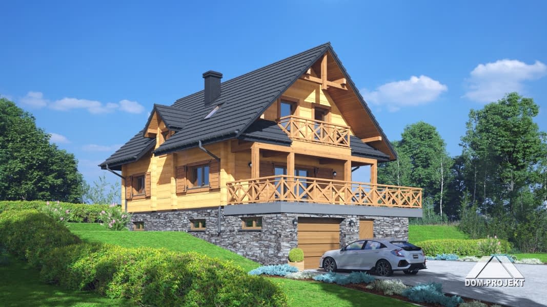 Dom z bali. Podpiwniczony. Na parterze salon z kuchnią, kominkiem oraz wyjściem na duży, częściowo zadaszony taras. Pokój, łazienka, gabinet, wiatrołap, komunikacja. Na poddaszu cztery pokoje, łazienka, komunikacja oraz balkon dostępny z dwóch pokoi. W podpiwniczeniu garaż, pomieszczenie rekreacyjne, piwnica, łazienka z sauną, pomieszczenie gospodarcze oraz komunikacja.Rzuty
