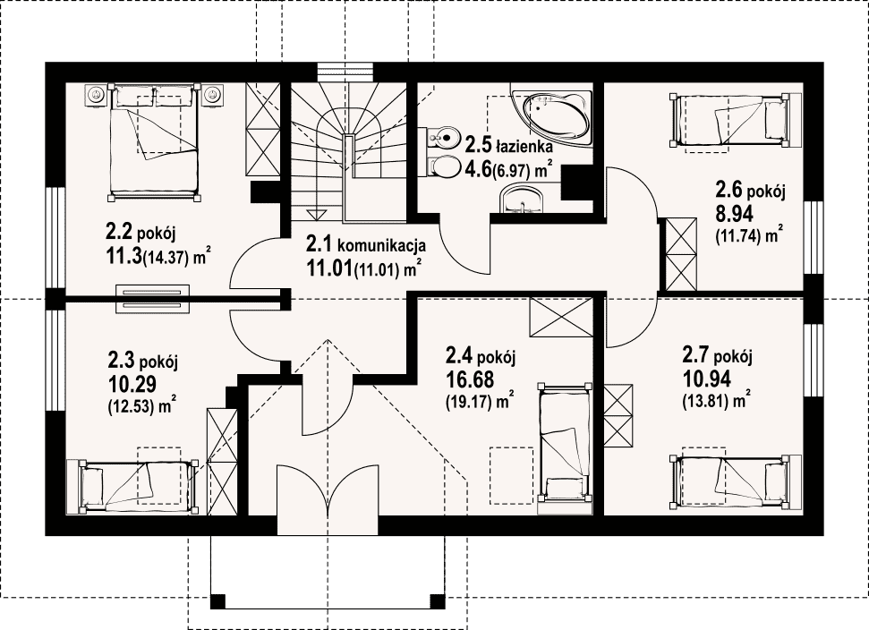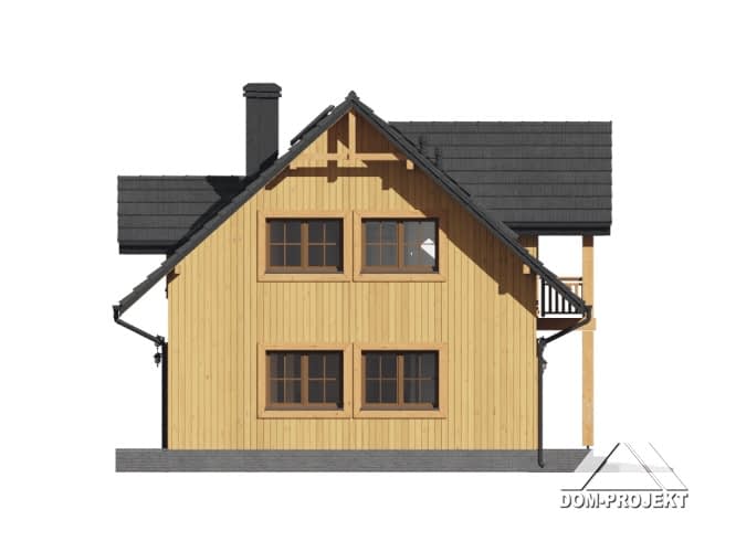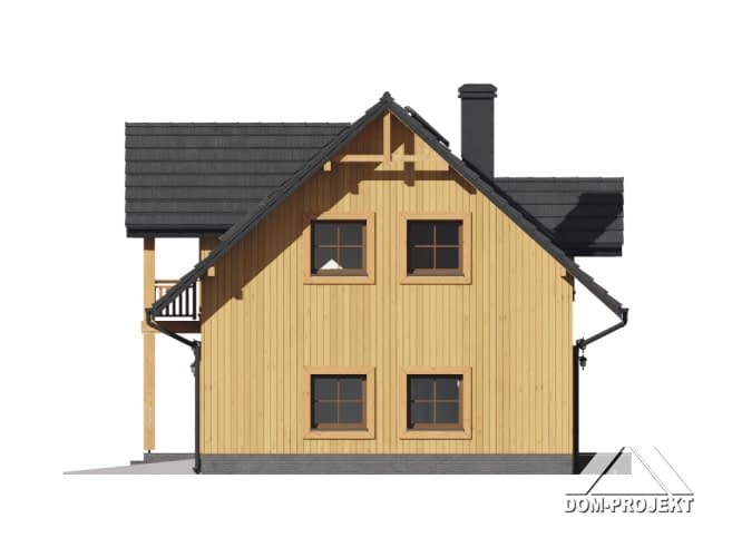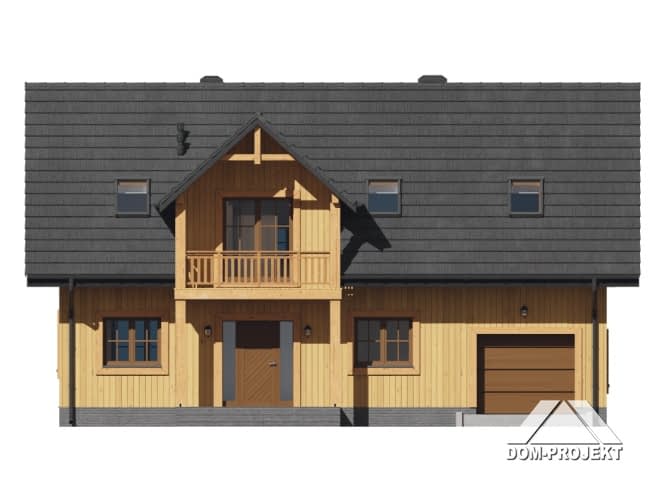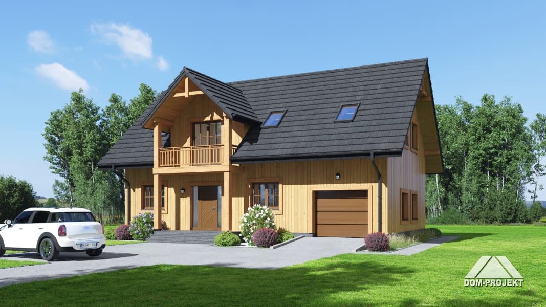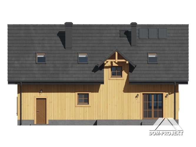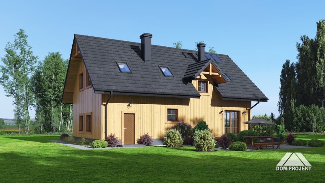 Dom w konstrukcji szkieletu drewnianego. Na parterze duży salon z aneksem kuchennym, kominkiem oraz wyjściem na taras. Pokój-biblioteka, wiatrołap, komunikacja, łazienka, garaż i kotłownia. Na poddaszu pięć pokoi, łazienka i komunikacja. Zwarta bryła budynku i dach dwuspadowy sprzyjają szybkiej i taniej budowie oraz niskim kosztom eksploatacji.Rzuty
