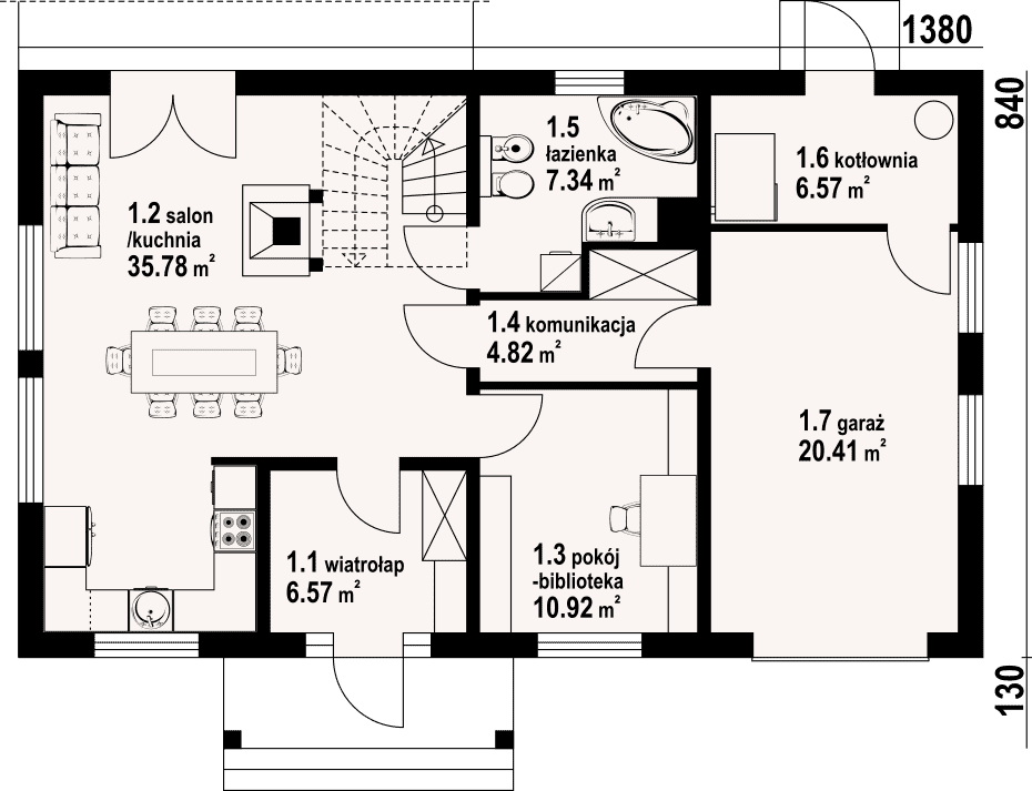 - 1.2 - kuchnia, salon35.78 m²