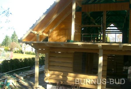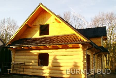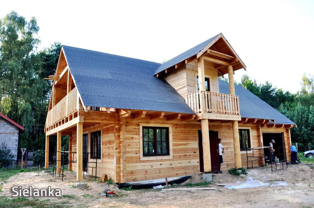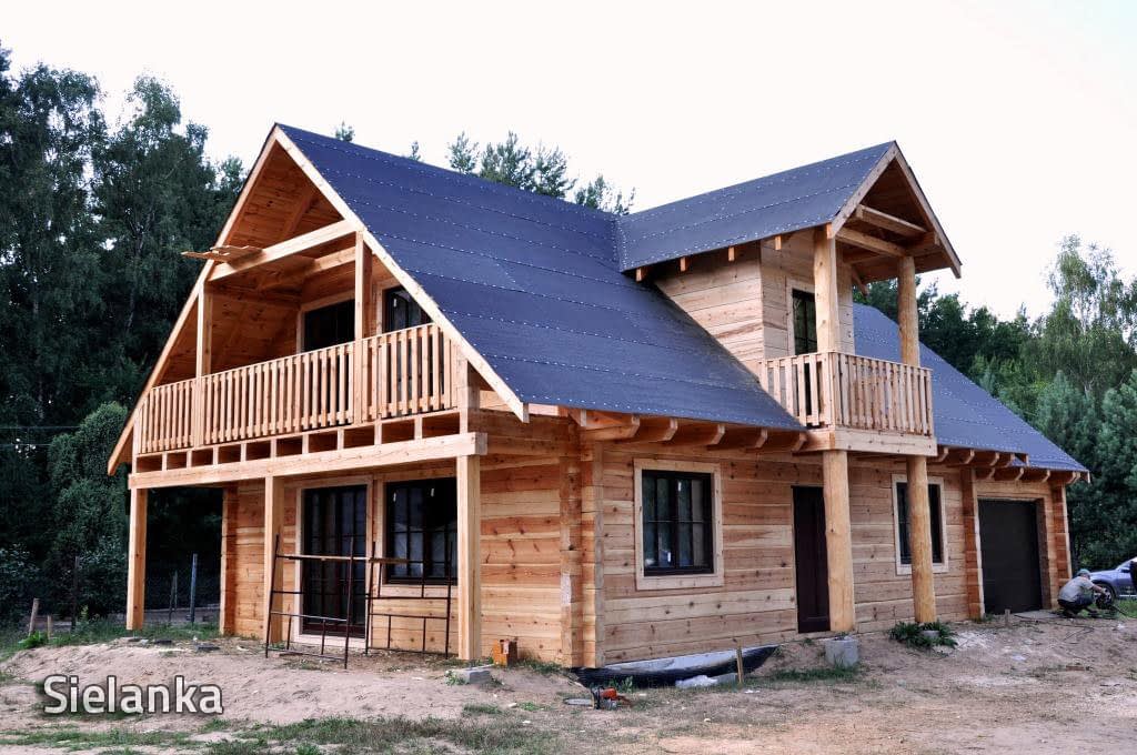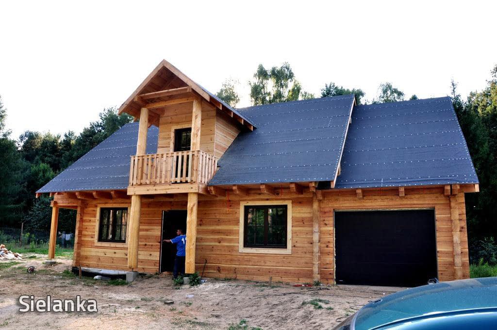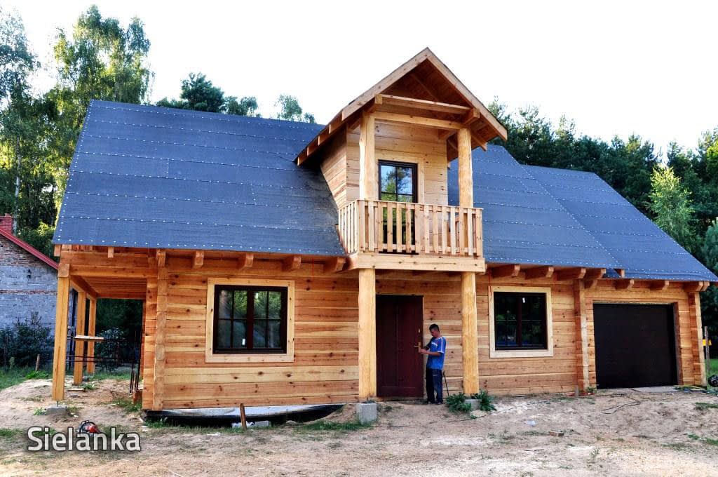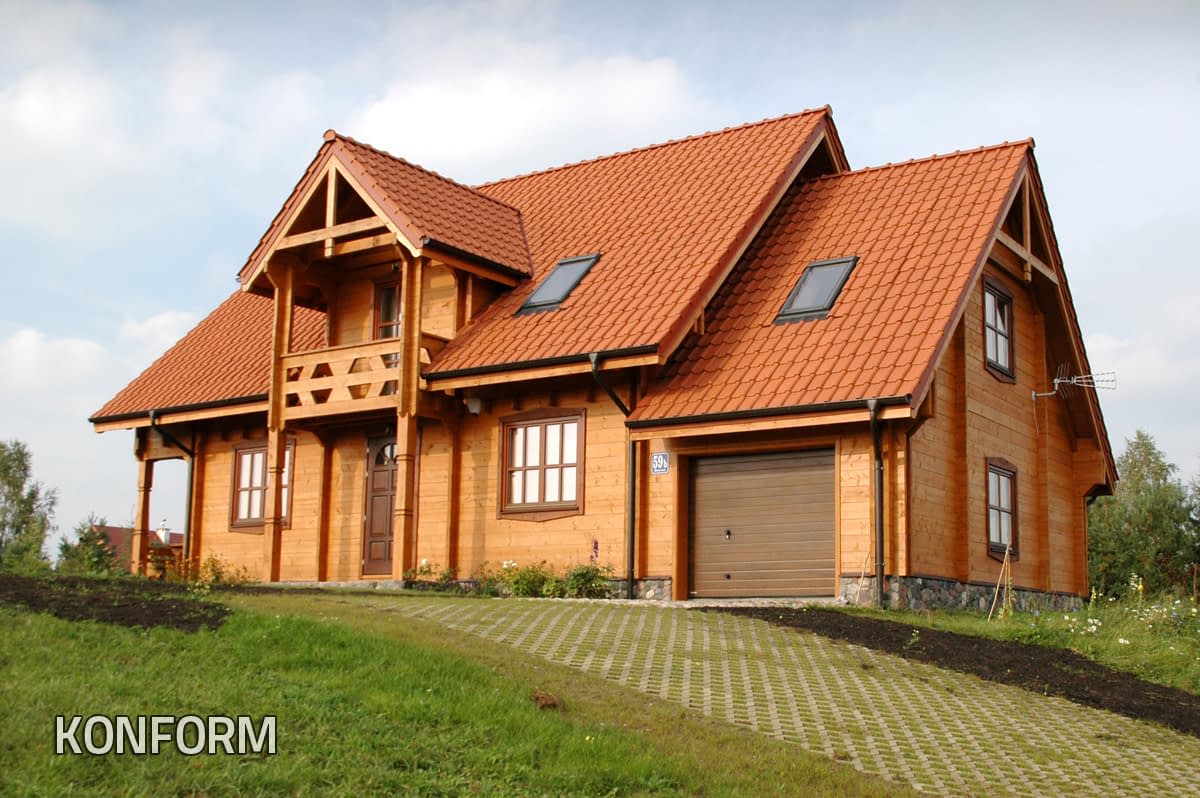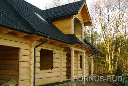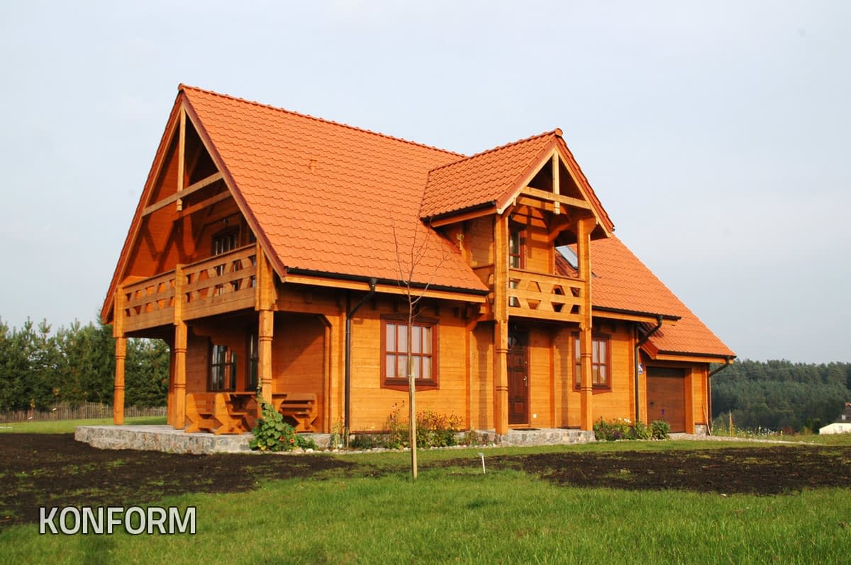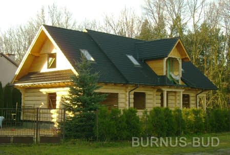 Dom z bali drewnianych. Sześć pokoi, dwie łazienki, aneks kuchenny, wiatrołap, kotłownia, garaż. Duży salon z aneksem kuchennym, kominkiem, schodami na poddasze i wyjściem na taras. Pięć pokoi na poddaszu (w tym trzy z balkonem). Instalacja solarna. Liczne warianty projektu.Rzuty