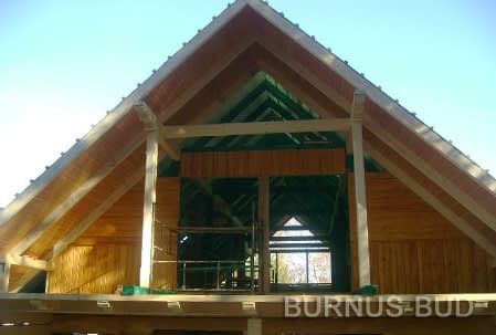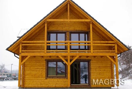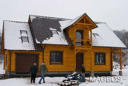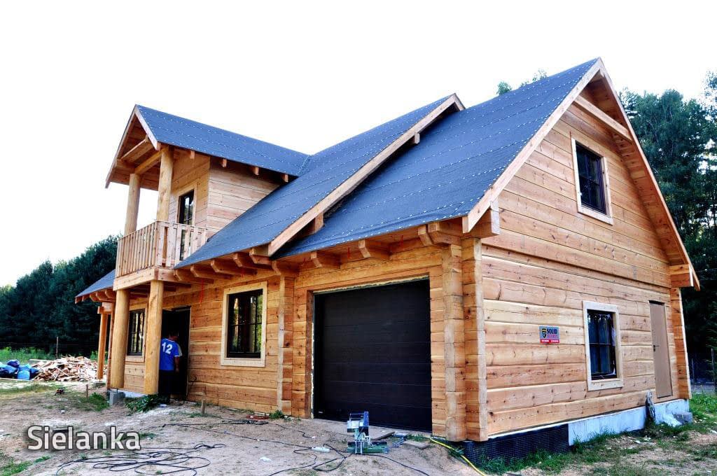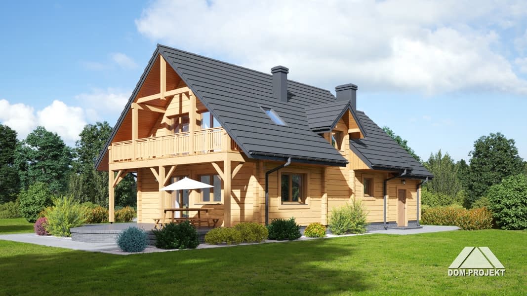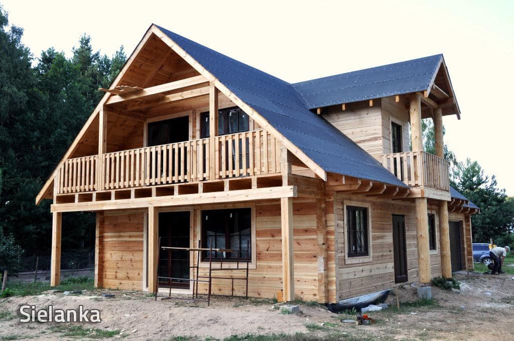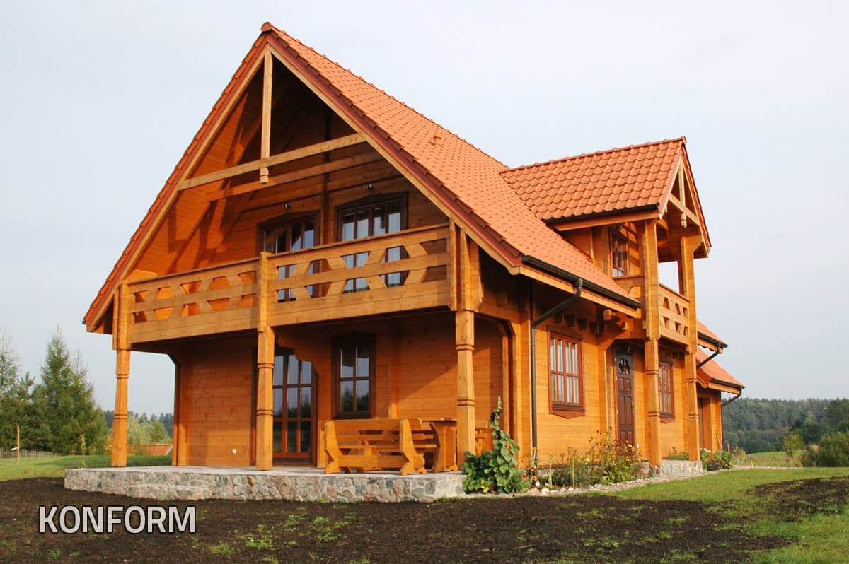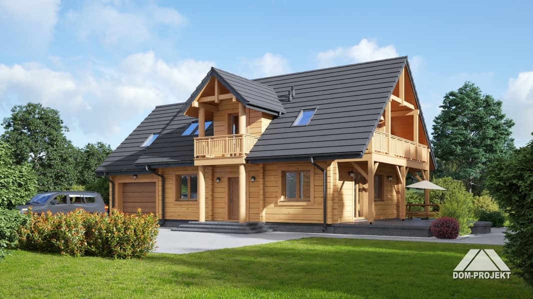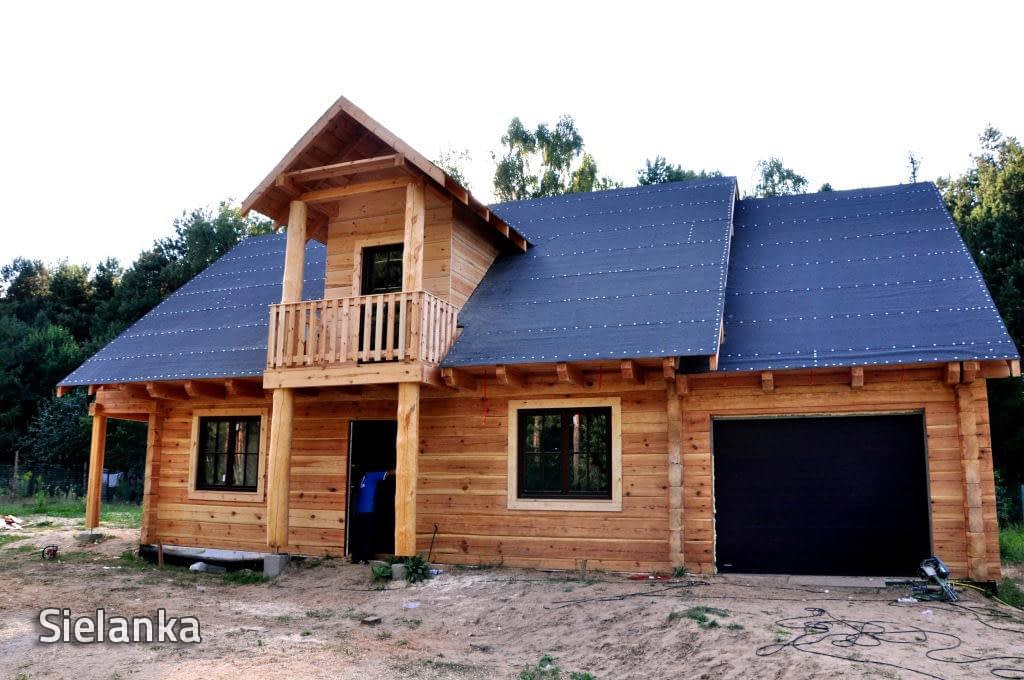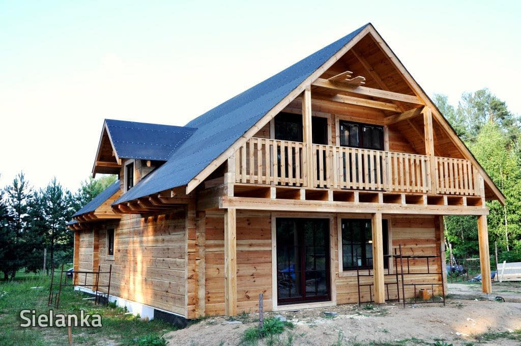 Dom z bali drewnianych. Sześć pokoi, dwie łazienki, aneks kuchenny, wiatrołap, kotłownia, garaż. Duży salon z aneksem kuchennym, kominkiem, schodami na poddasze i wyjściem na taras. Pięć pokoi na poddaszu (w tym trzy z balkonem). Instalacja solarna. Liczne warianty projektu.Rzuty