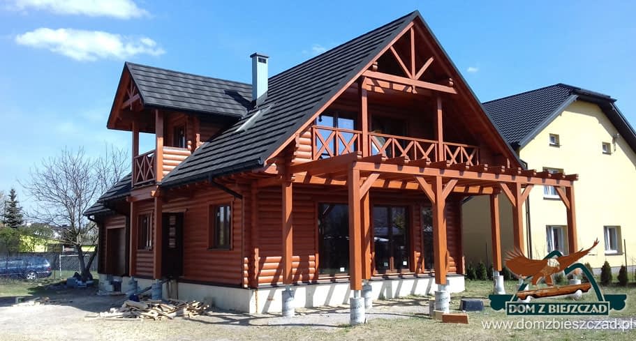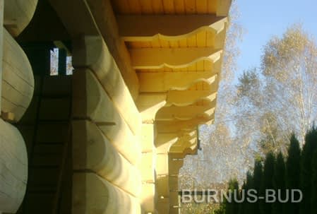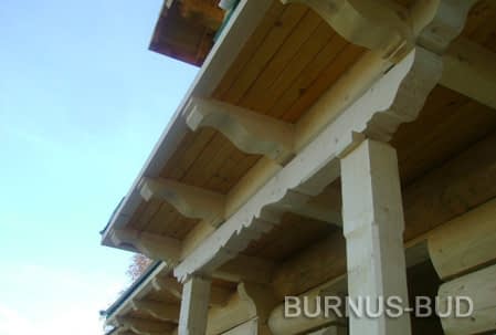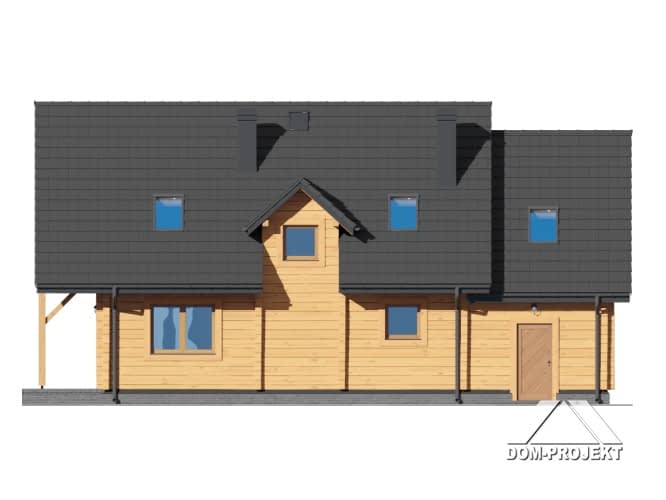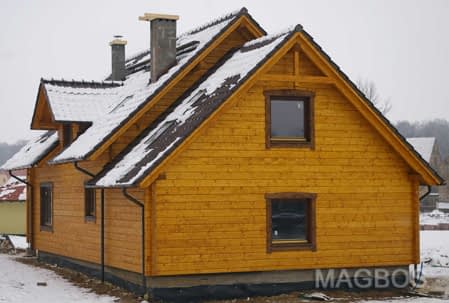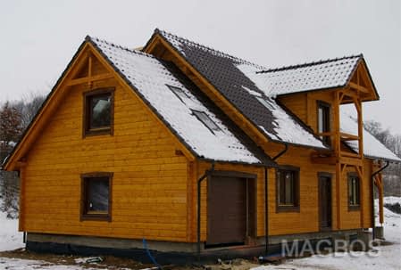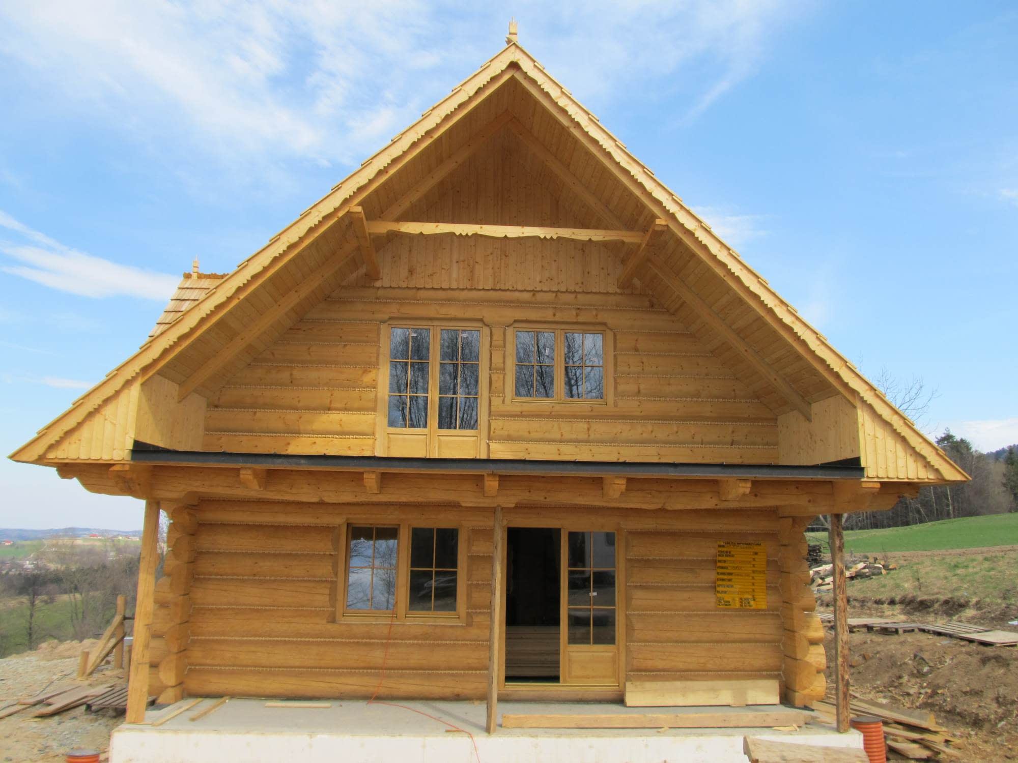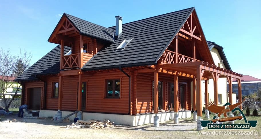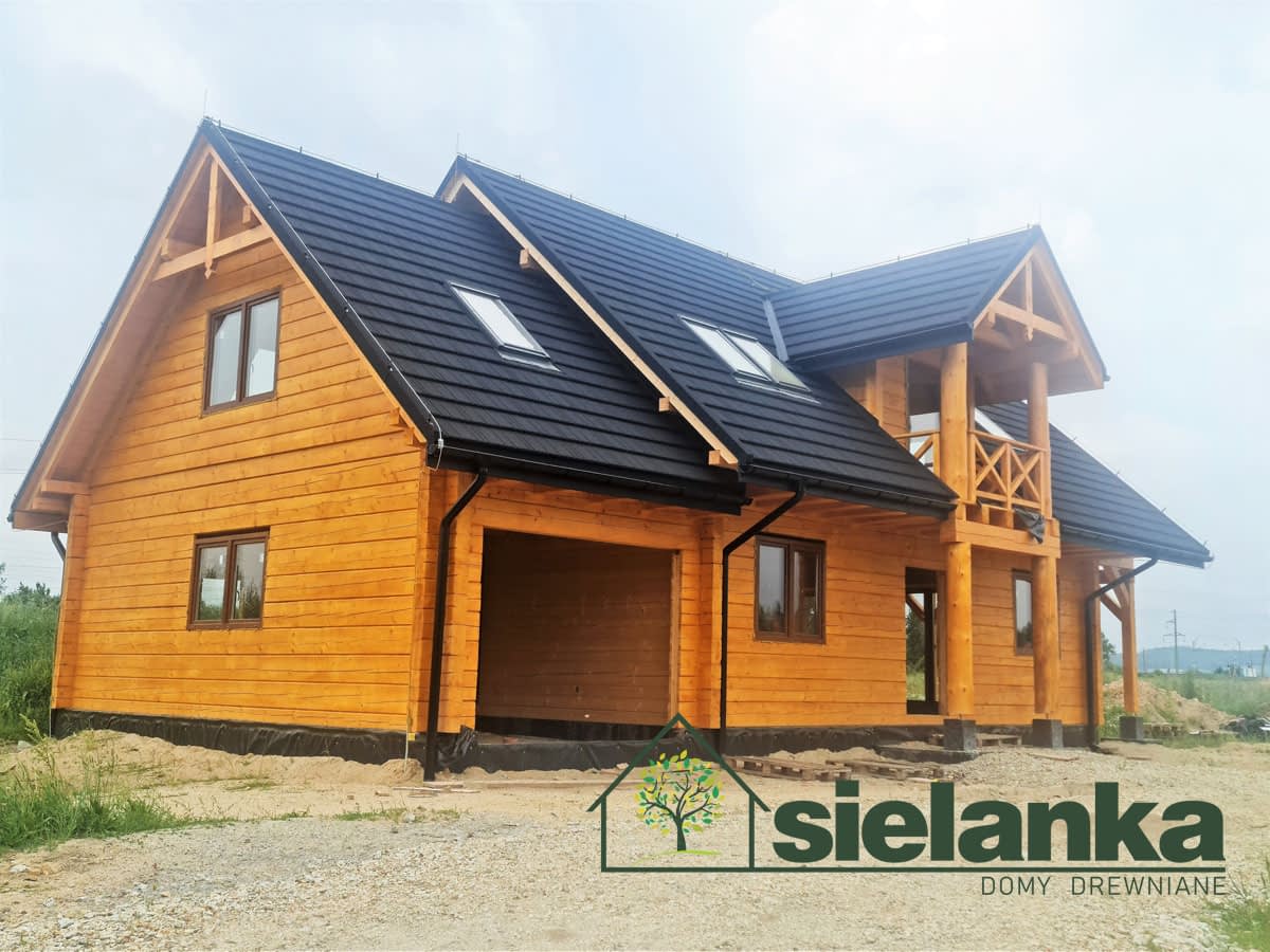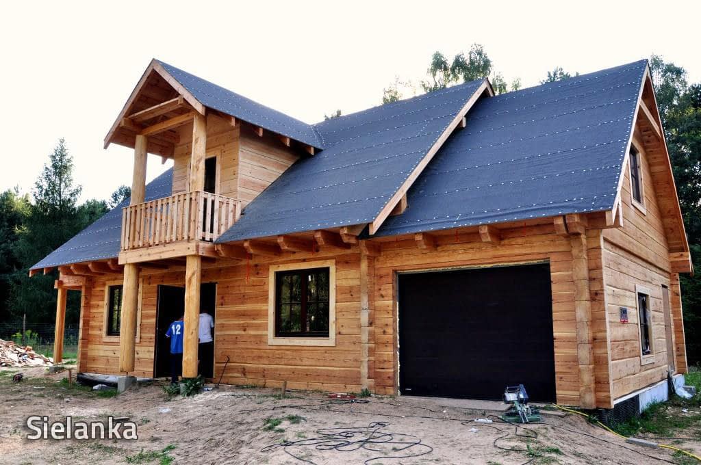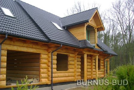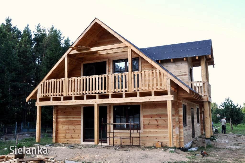 Dom z bali drewnianych. Sześć pokoi, dwie łazienki, aneks kuchenny, wiatrołap, kotłownia, garaż. Duży salon z aneksem kuchennym, kominkiem, schodami na poddasze i wyjściem na taras. Pięć pokoi na poddaszu (w tym trzy z balkonem). Instalacja solarna. Liczne warianty projektu.Rzuty