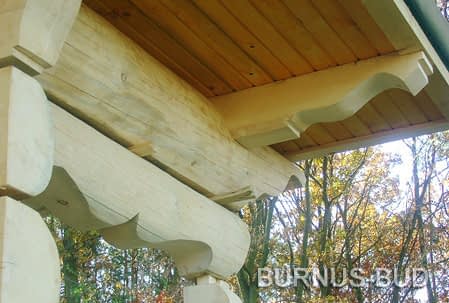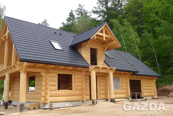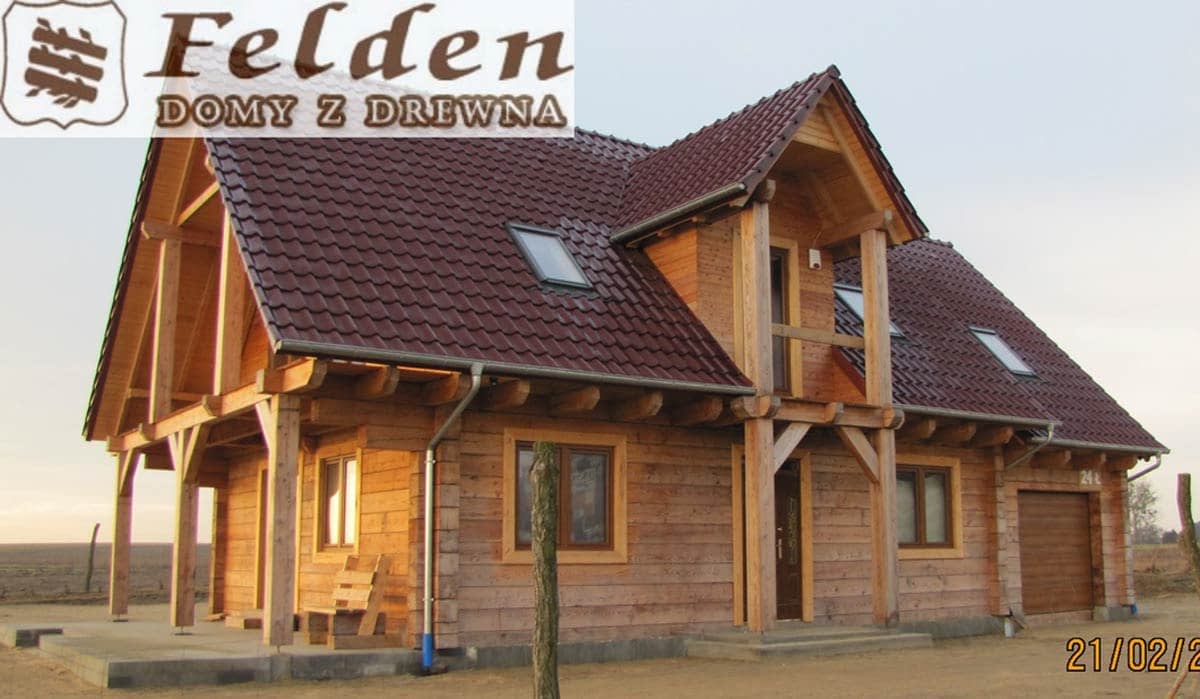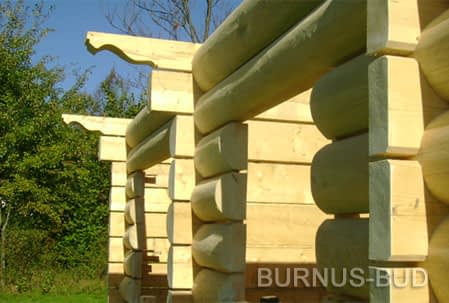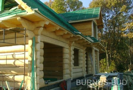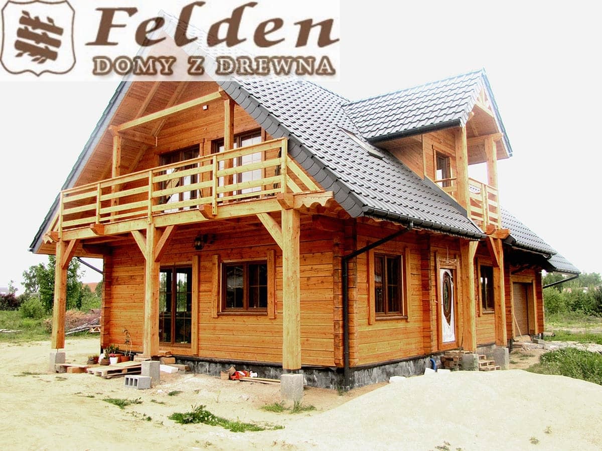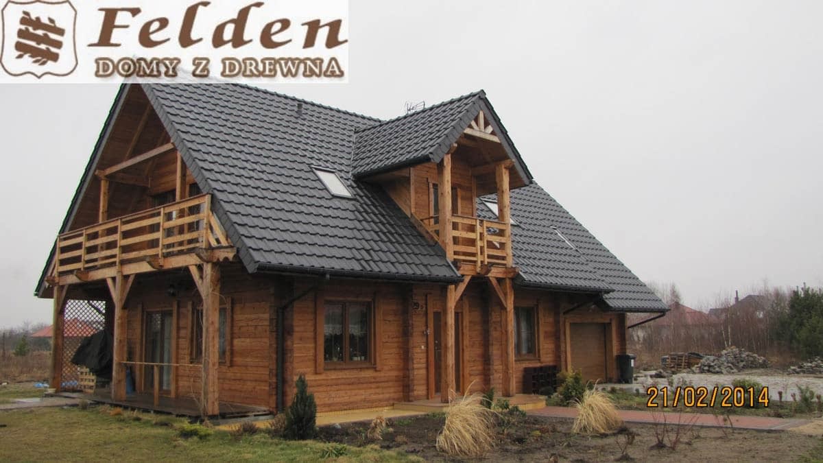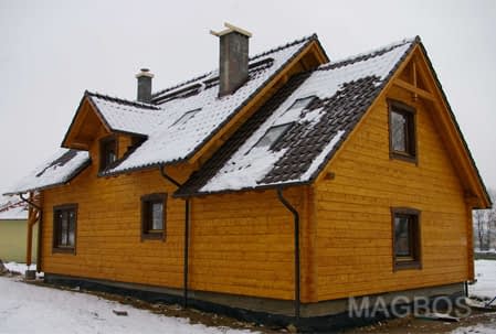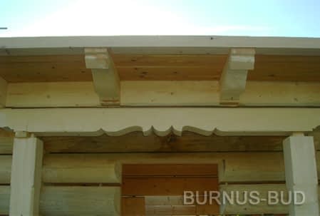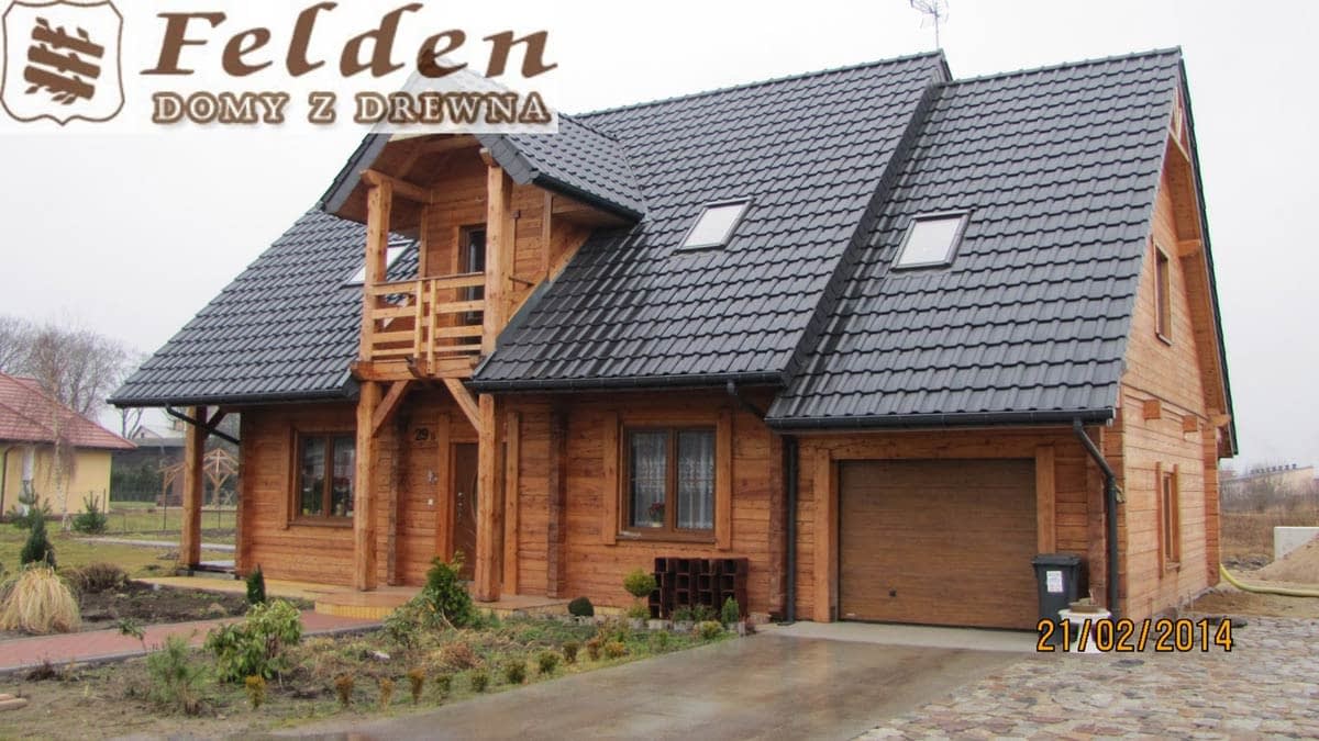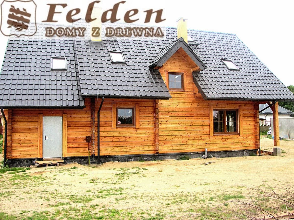 Dom z bali drewnianych. Sześć pokoi, dwie łazienki, aneks kuchenny, wiatrołap, kotłownia, garaż. Duży salon z aneksem kuchennym, kominkiem, schodami na poddasze i wyjściem na taras. Pięć pokoi na poddaszu (w tym trzy z balkonem). Instalacja solarna. Liczne warianty projektu.Rzuty