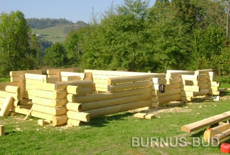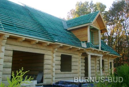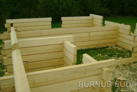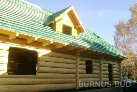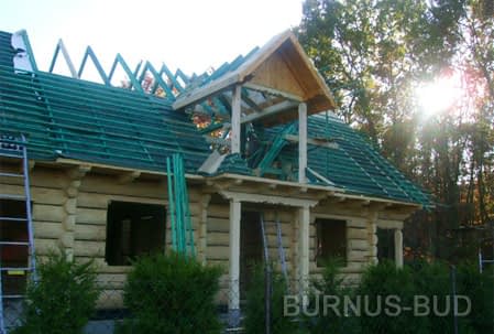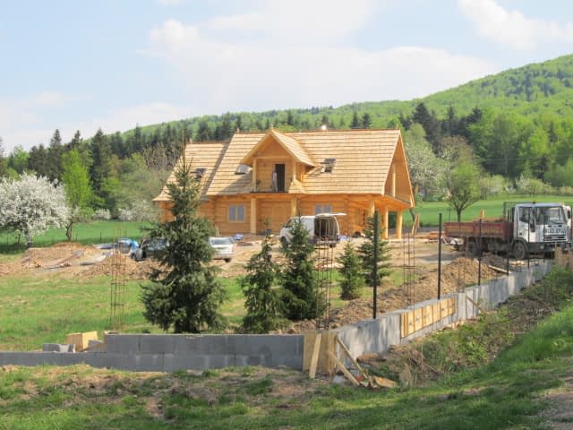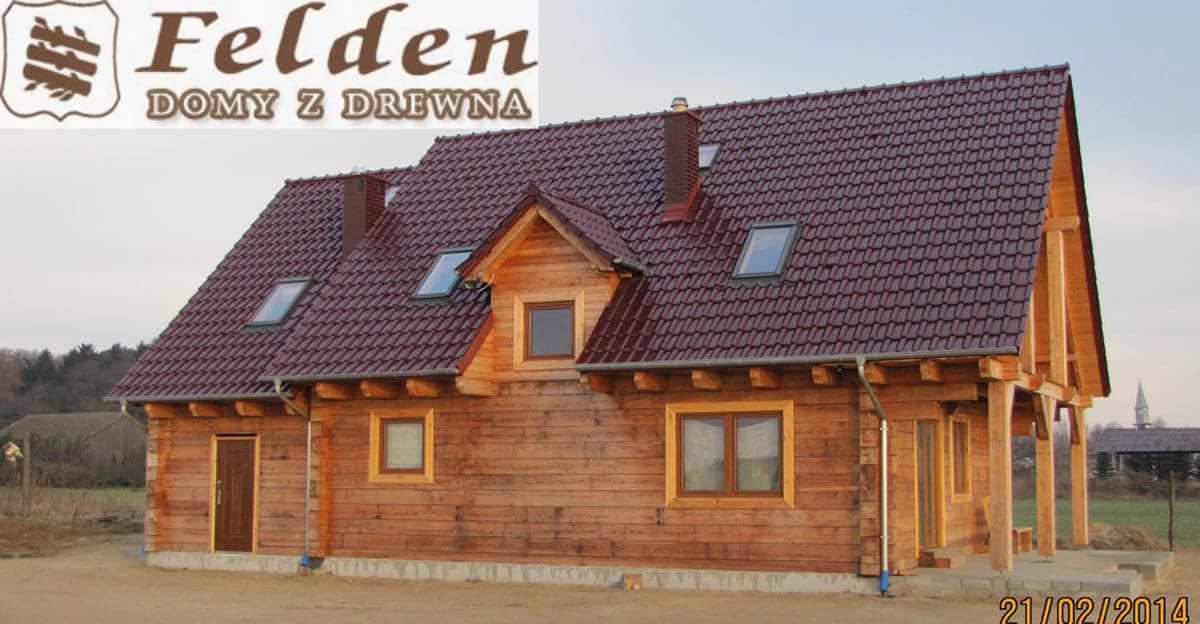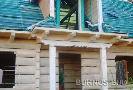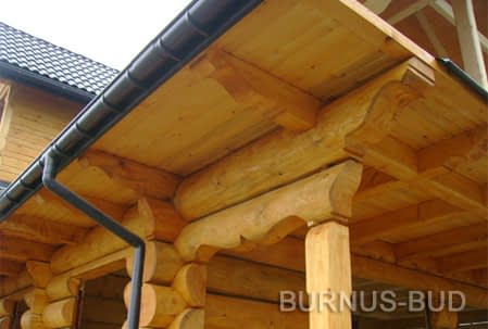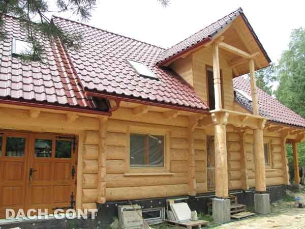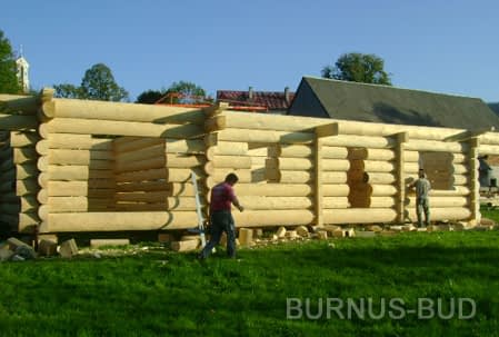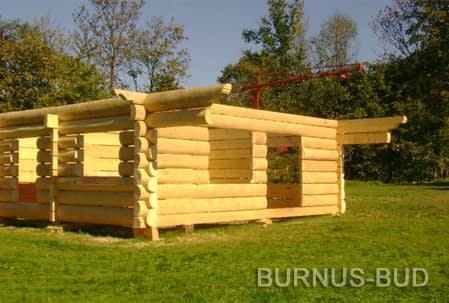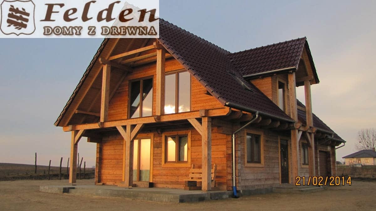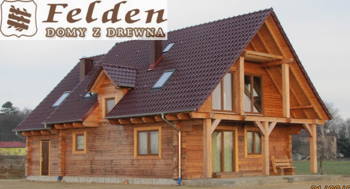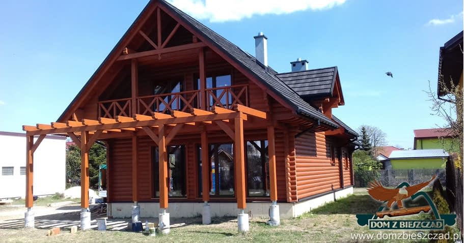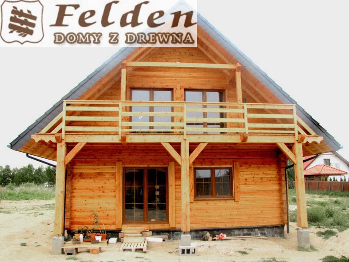 Dom z bali drewnianych. Sześć pokoi, dwie łazienki, aneks kuchenny, wiatrołap, kotłownia, garaż. Duży salon z aneksem kuchennym, kominkiem, schodami na poddasze i wyjściem na taras. Pięć pokoi na poddaszu (w tym trzy z balkonem). Instalacja solarna. Liczne warianty projektu.Rzuty