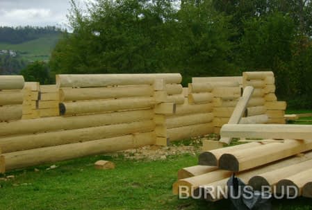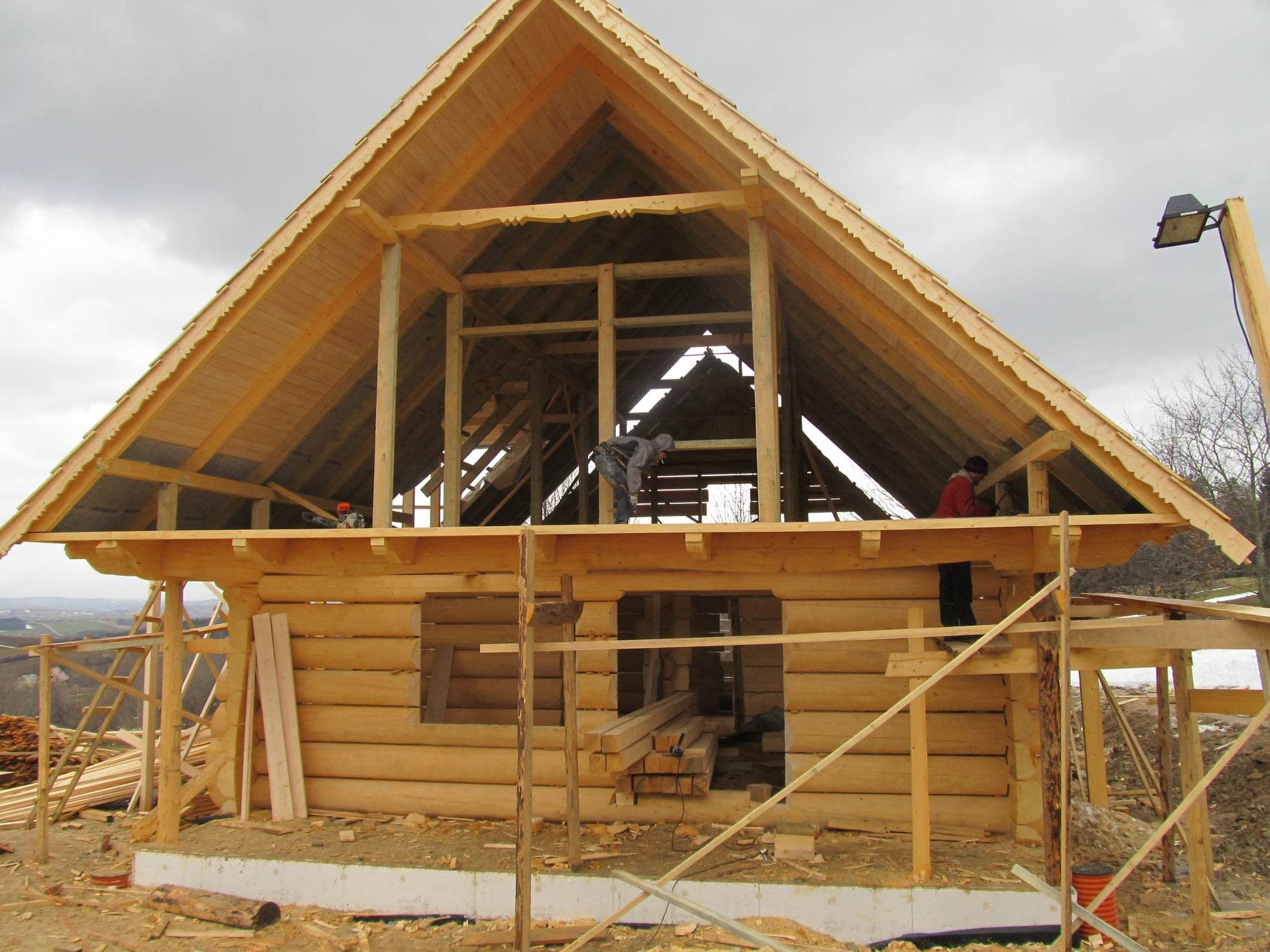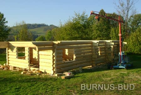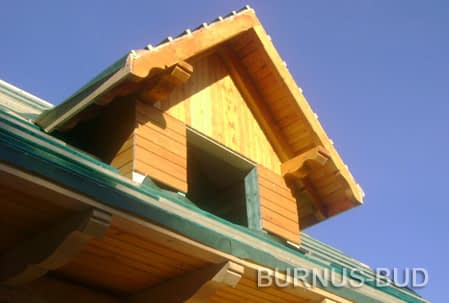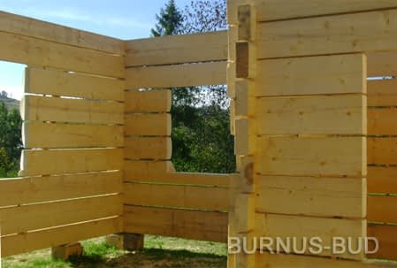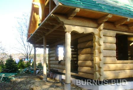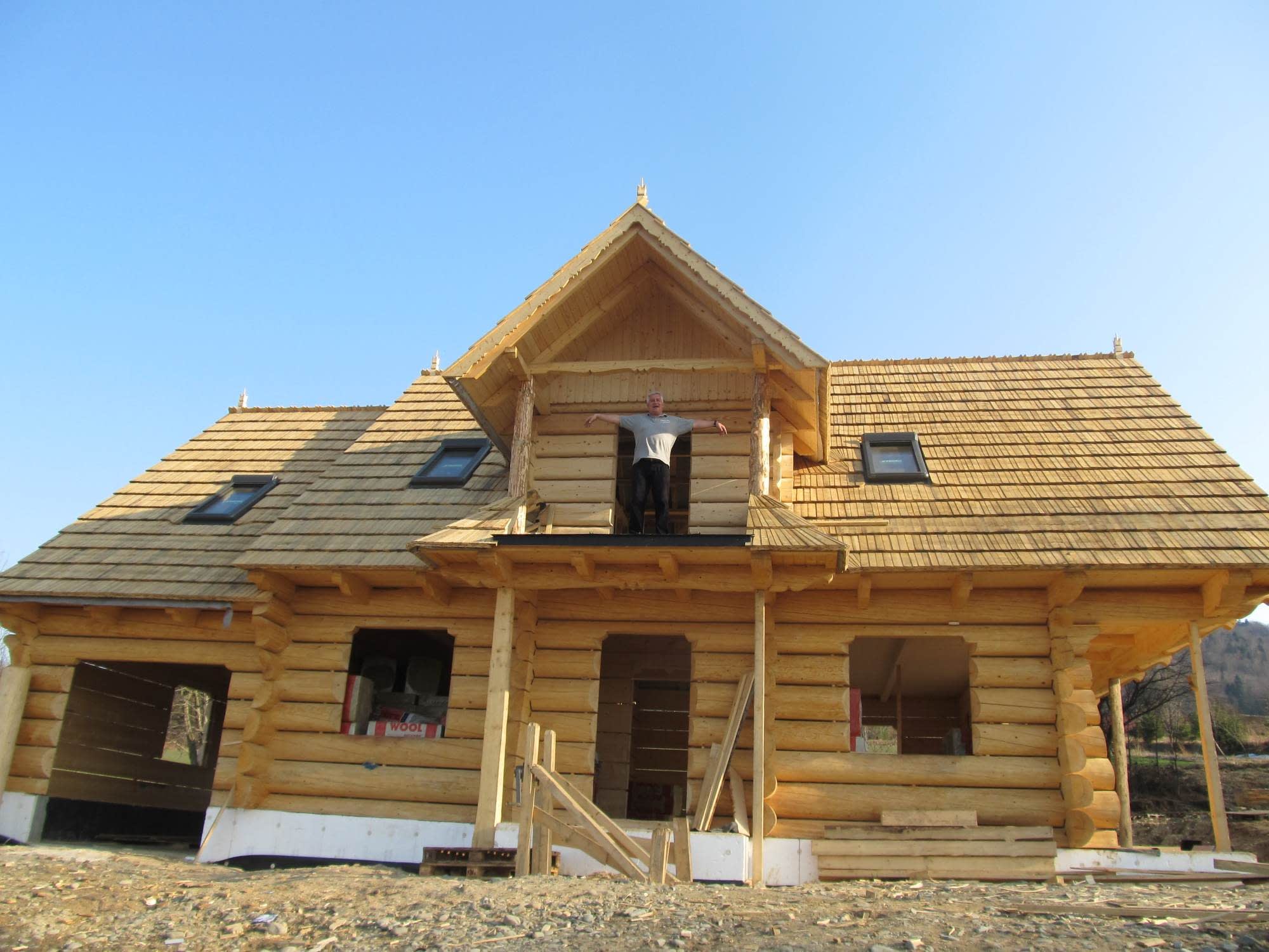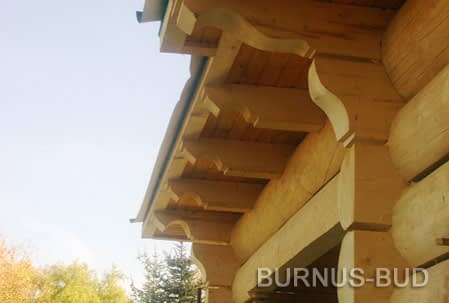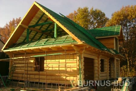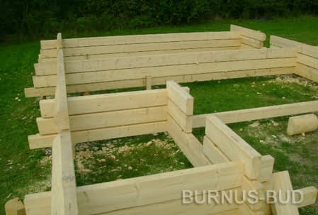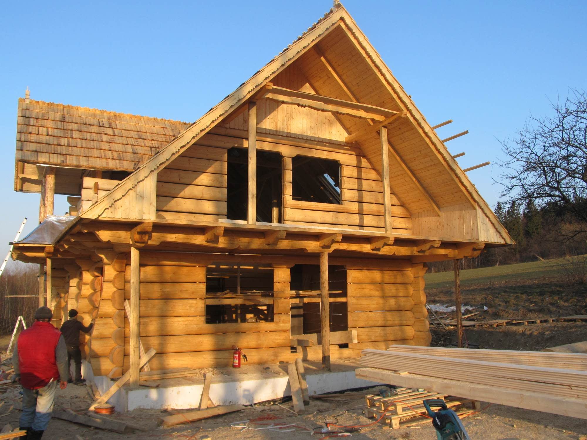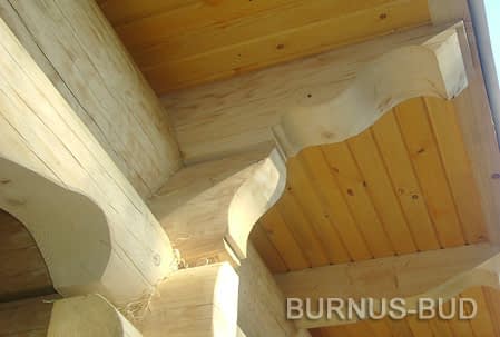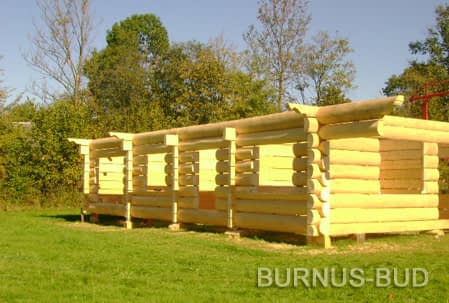 Dom z bali drewnianych. Sześć pokoi, dwie łazienki, aneks kuchenny, wiatrołap, kotłownia, garaż. Duży salon z aneksem kuchennym, kominkiem, schodami na poddasze i wyjściem na taras. Pięć pokoi na poddaszu (w tym trzy z balkonem). Instalacja solarna. Liczne warianty projektu.Rzuty