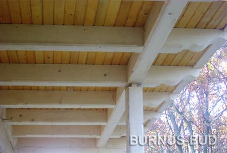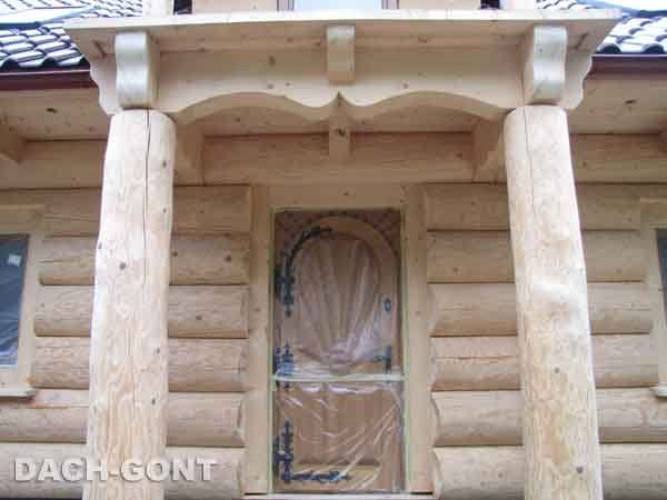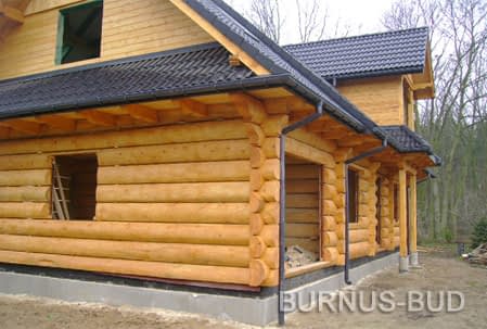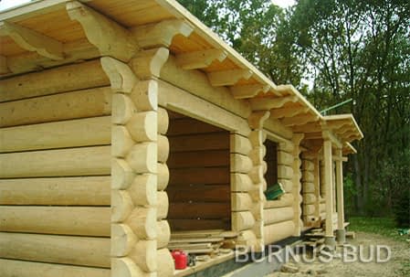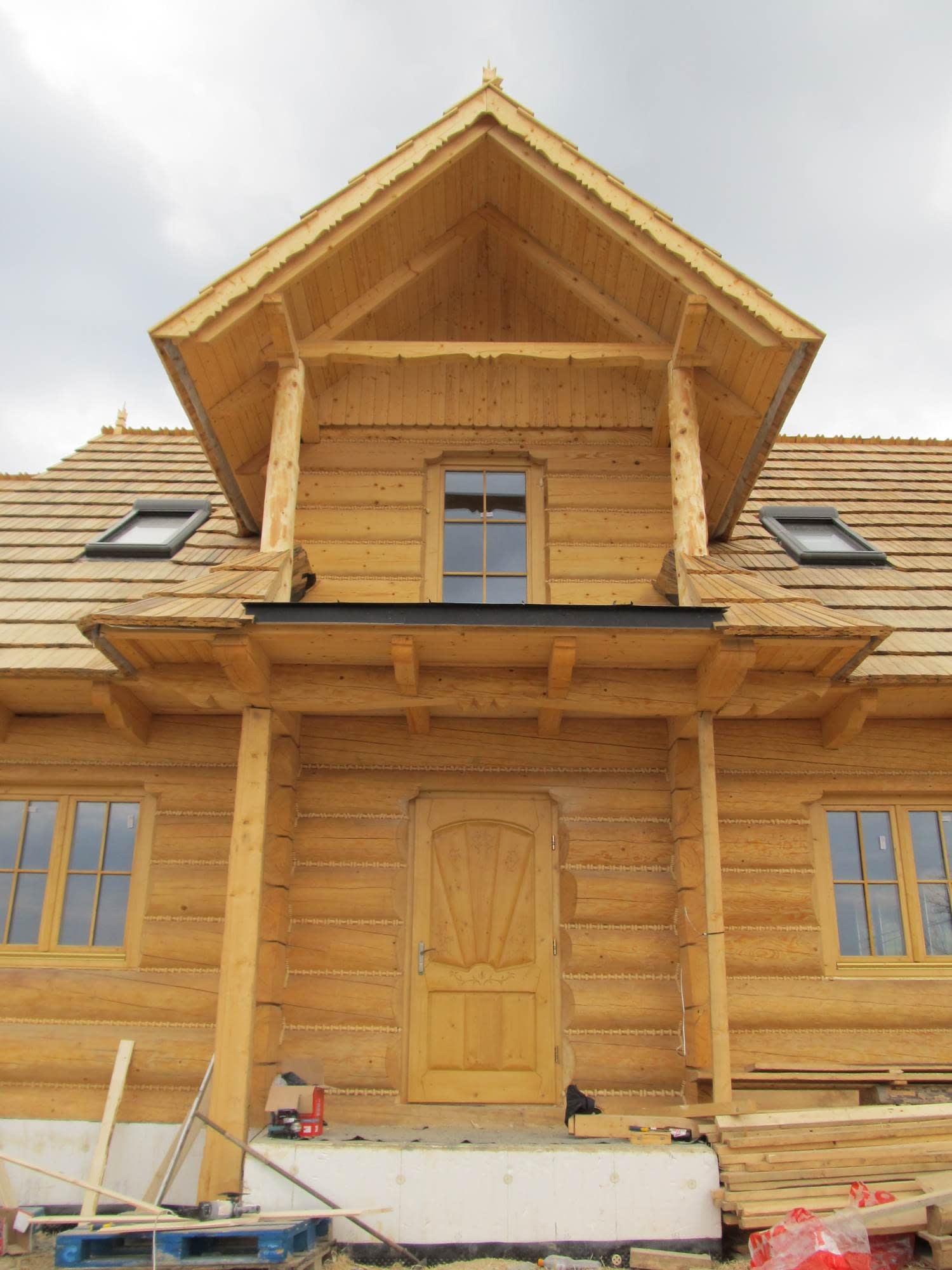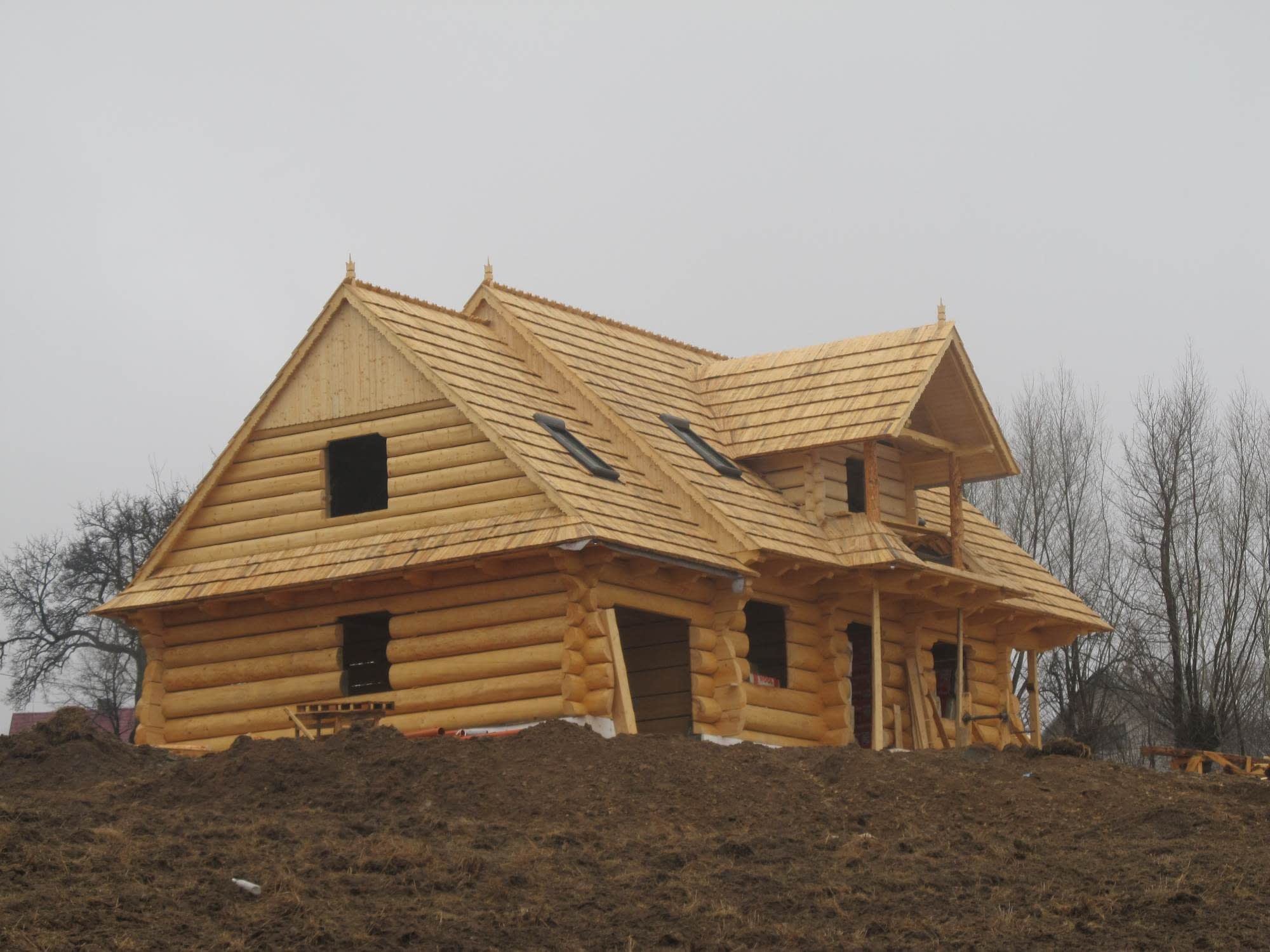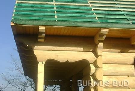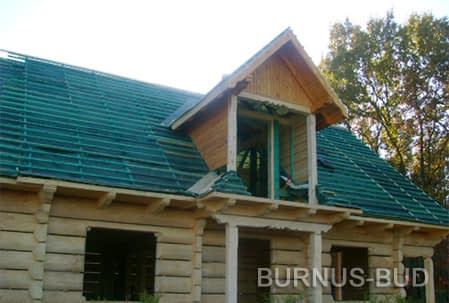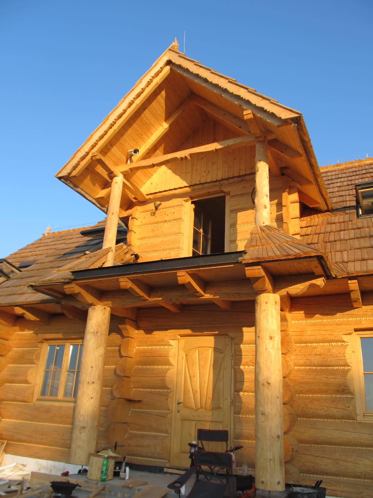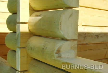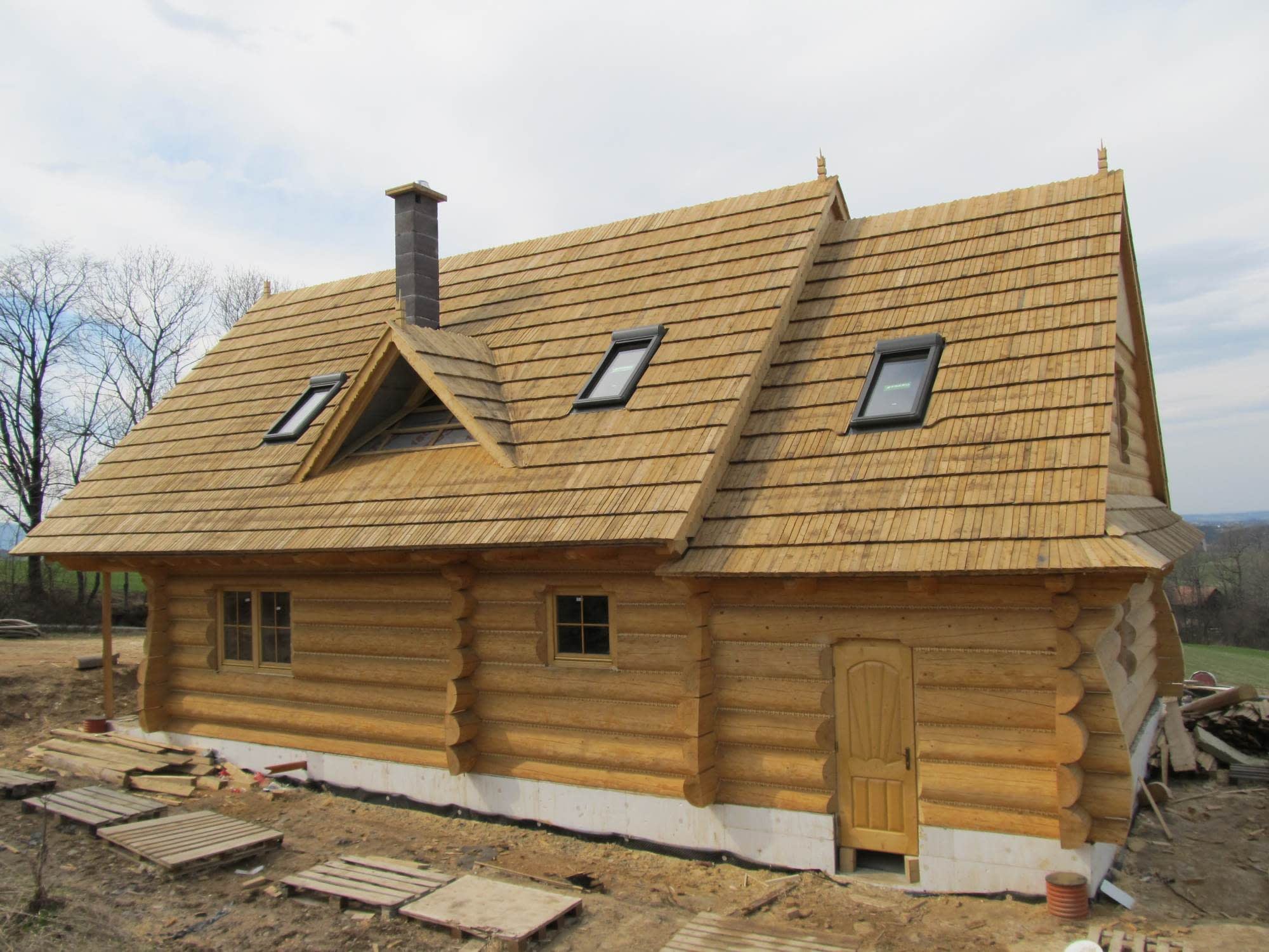 Dom z bali drewnianych. Sześć pokoi, dwie łazienki, aneks kuchenny, wiatrołap, kotłownia, garaż. Duży salon z aneksem kuchennym, kominkiem, schodami na poddasze i wyjściem na taras. Pięć pokoi na poddaszu (w tym trzy z balkonem). Instalacja solarna. Liczne warianty projektu.Rzuty