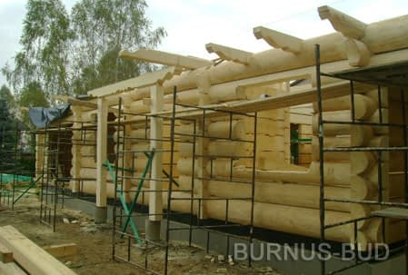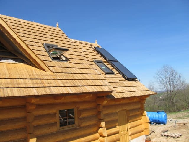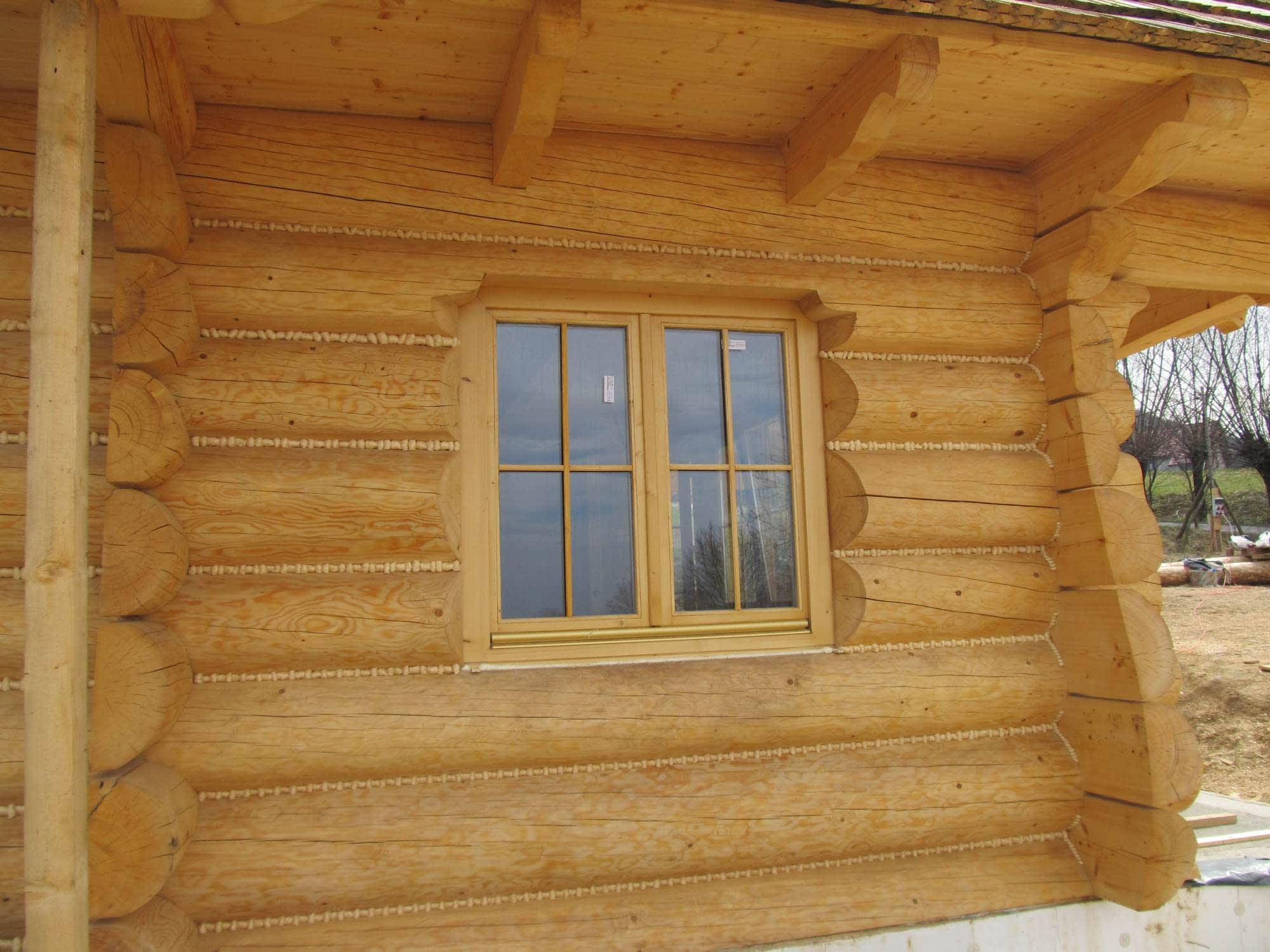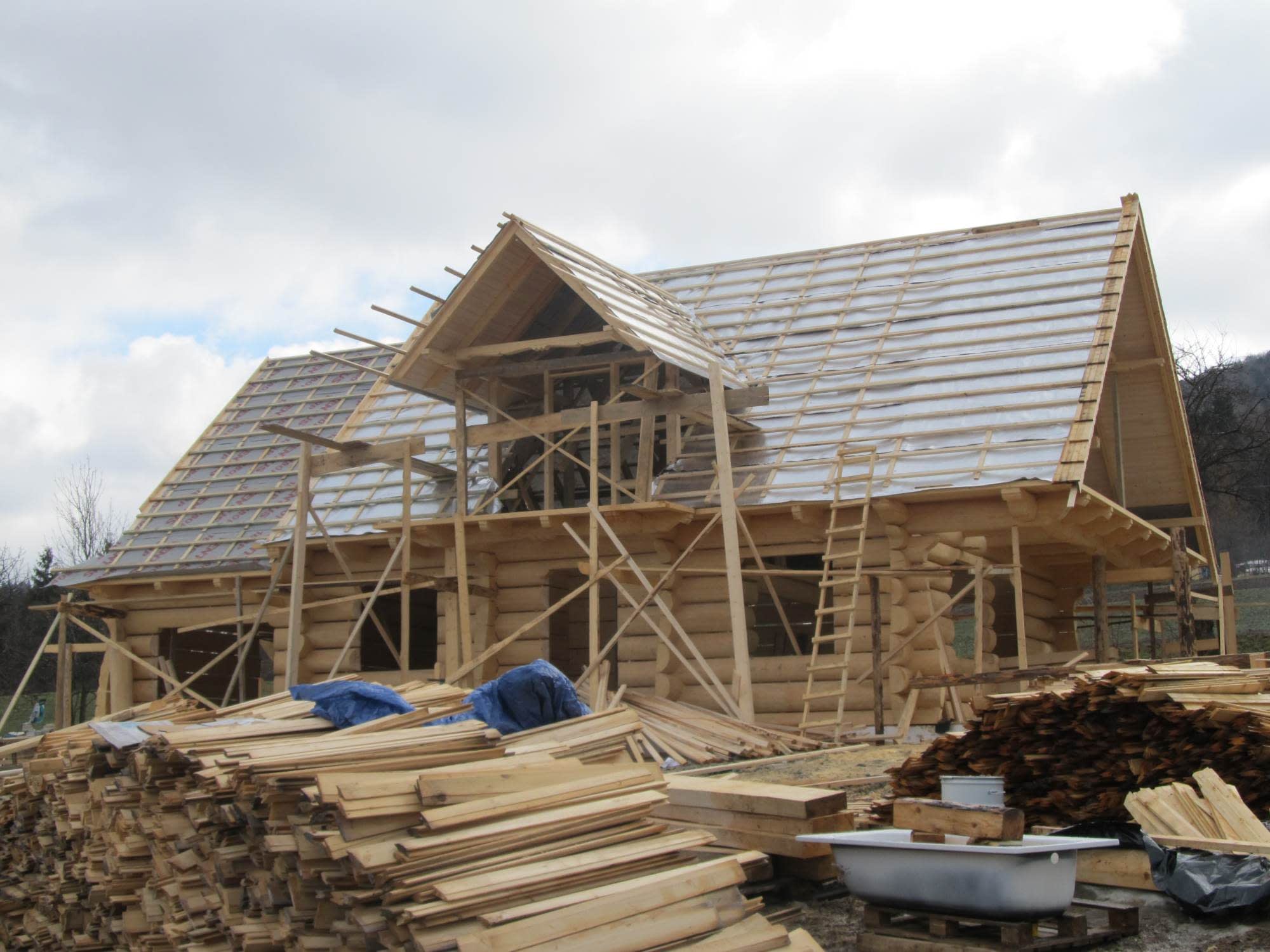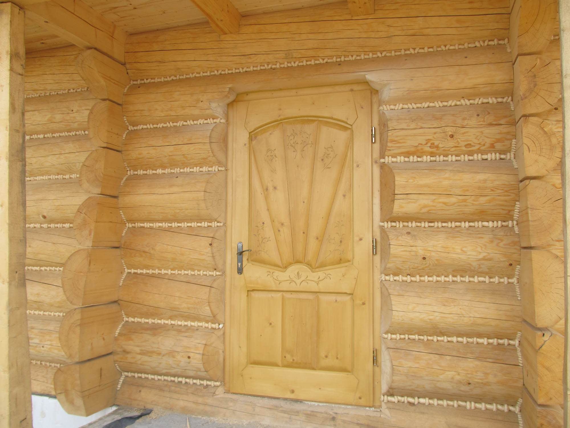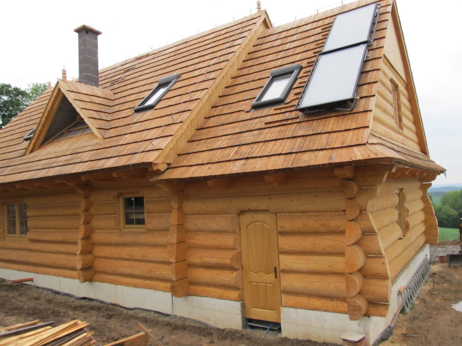 Dom z bali drewnianych. Sześć pokoi, dwie łazienki, aneks kuchenny, wiatrołap, kotłownia, garaż. Duży salon z aneksem kuchennym, kominkiem, schodami na poddasze i wyjściem na taras. Pięć pokoi na poddaszu (w tym trzy z balkonem). Instalacja solarna. Liczne warianty projektu.Rzuty