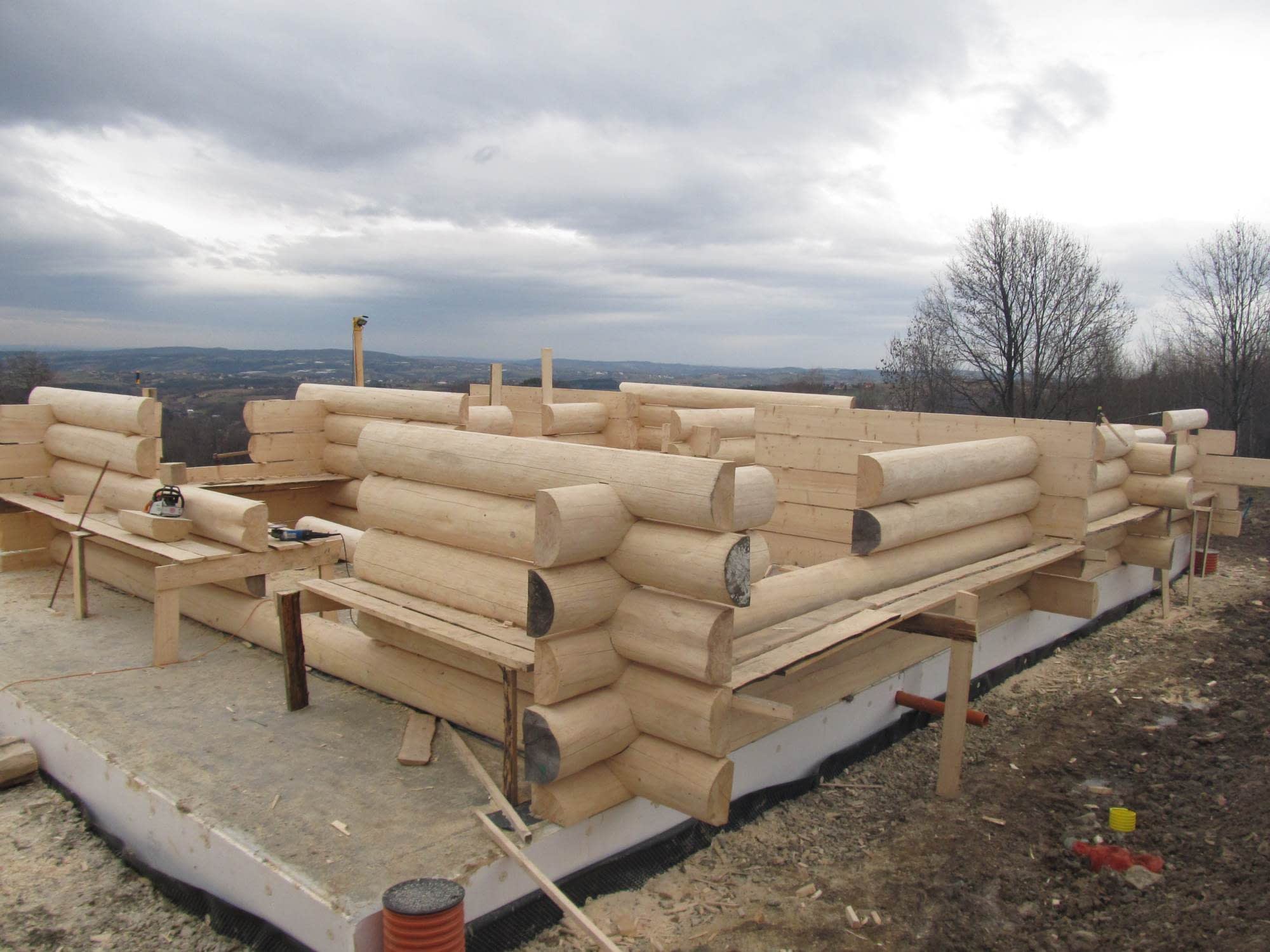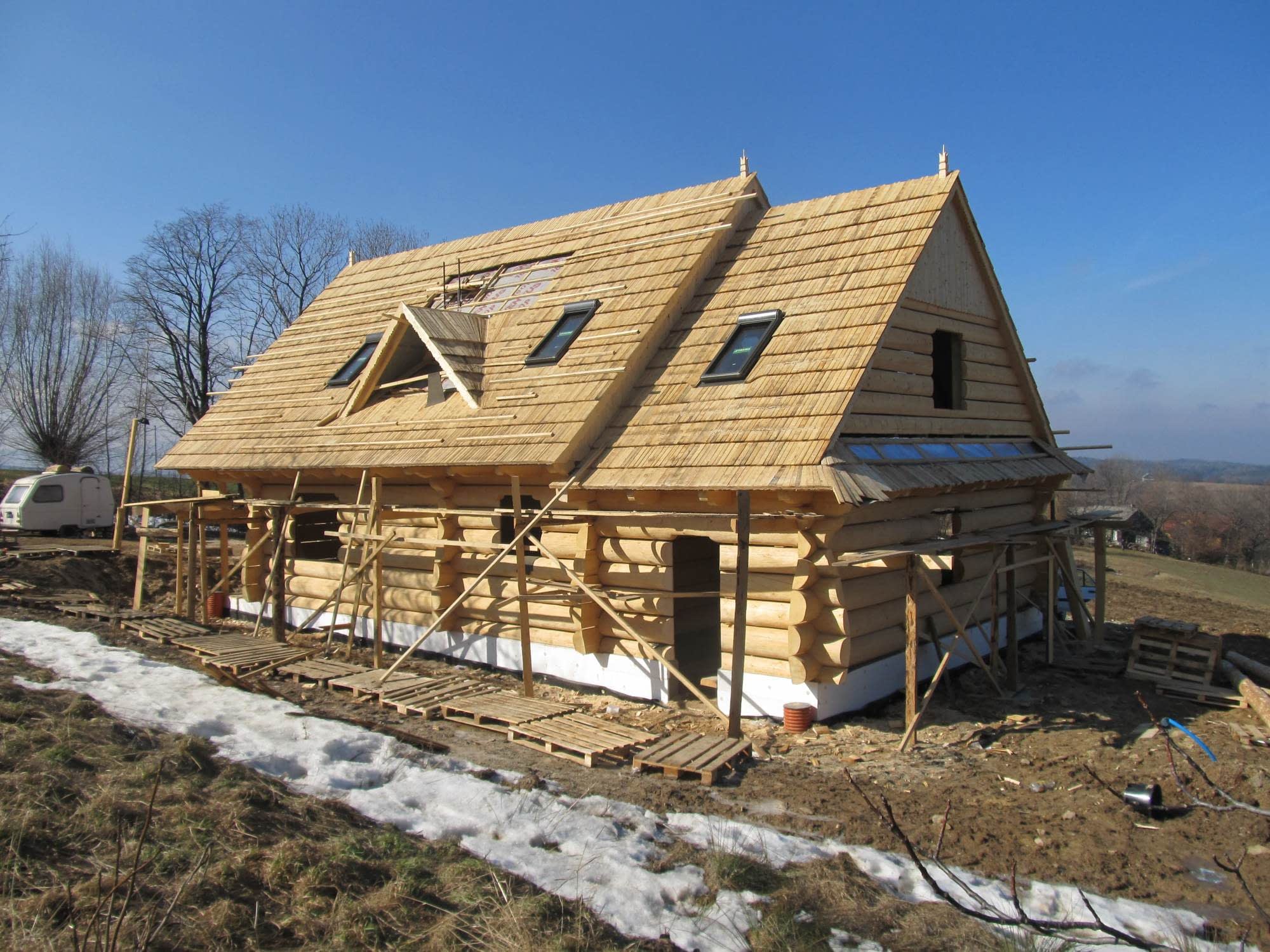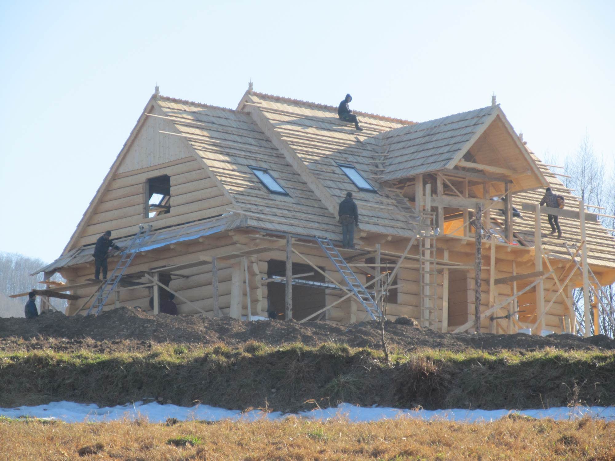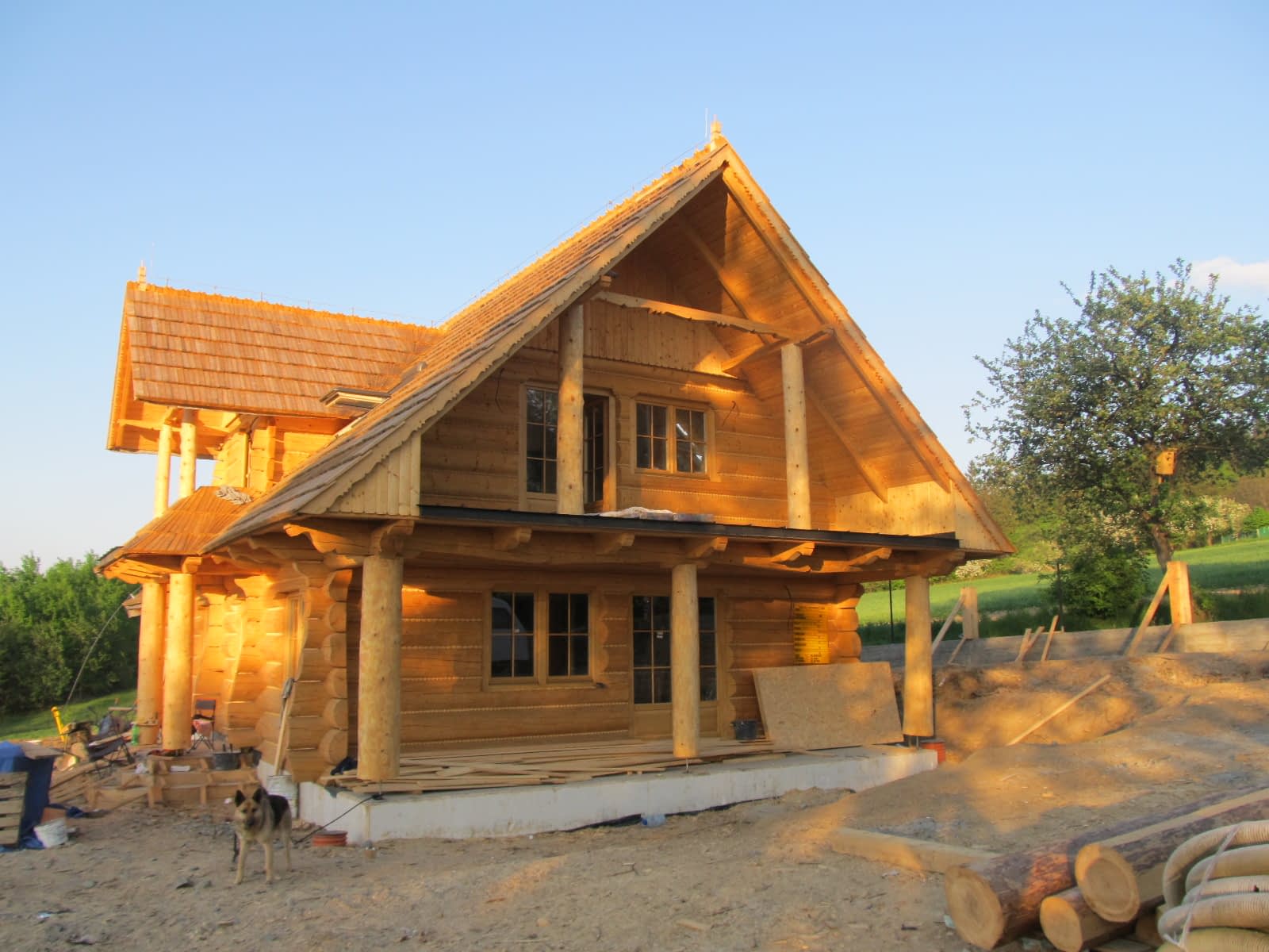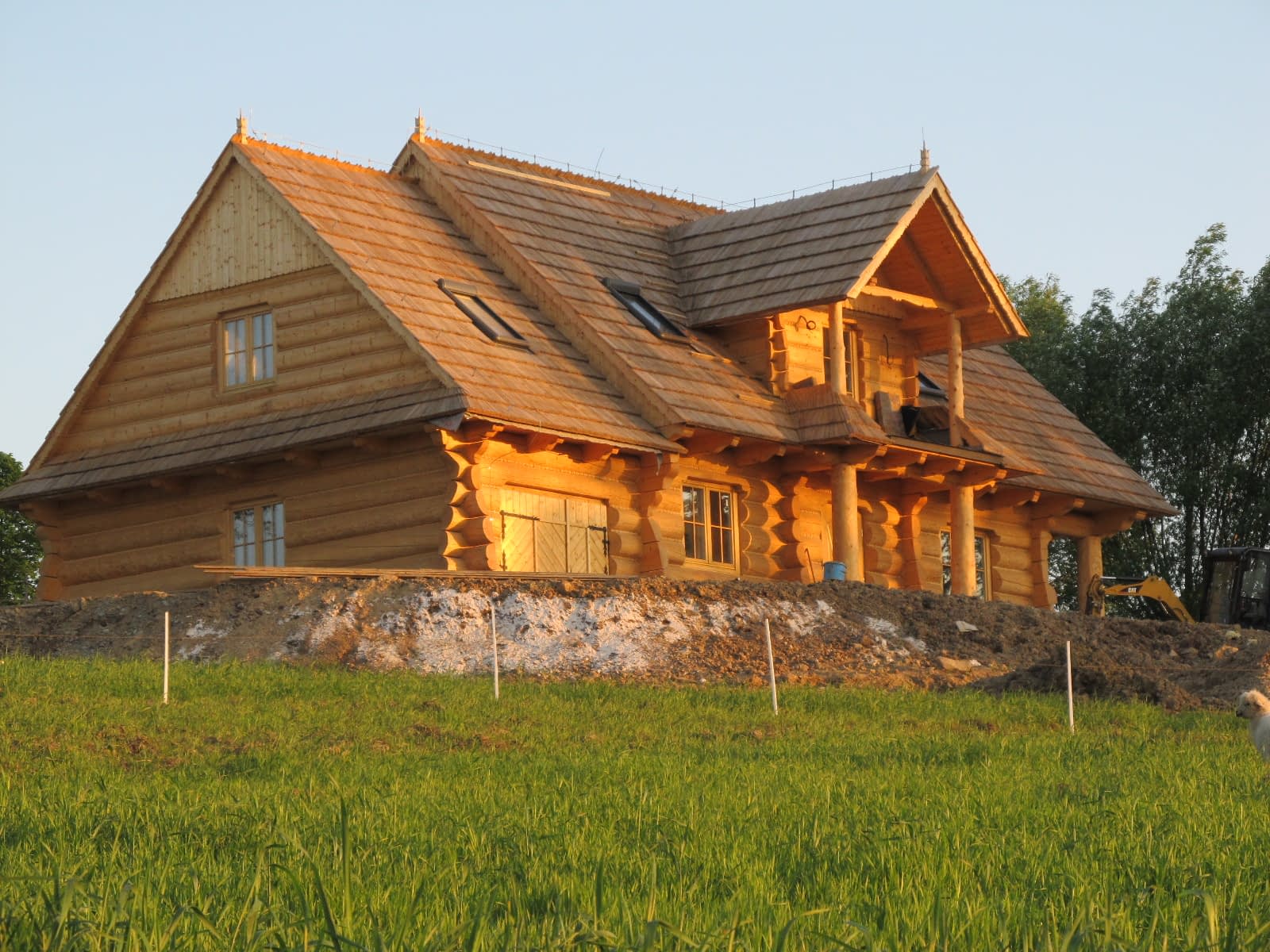 Dom z bali drewnianych. Sześć pokoi, dwie łazienki, aneks kuchenny, wiatrołap, kotłownia, garaż. Duży salon z aneksem kuchennym, kominkiem, schodami na poddasze i wyjściem na taras. Pięć pokoi na poddaszu (w tym trzy z balkonem). Instalacja solarna. Liczne warianty projektu.Rzuty