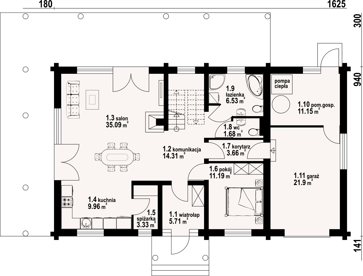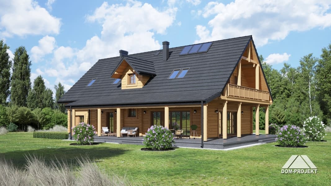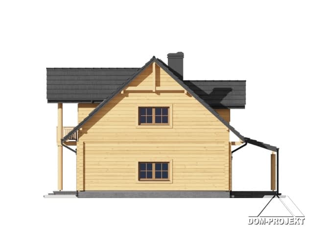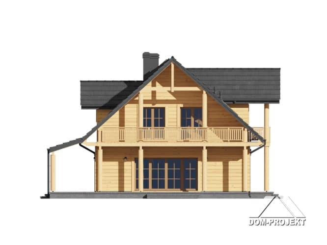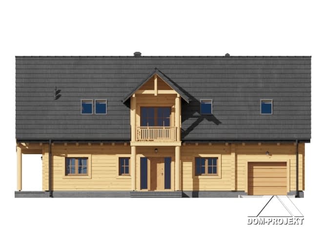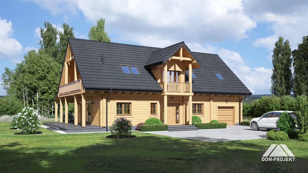 Dom z bali drewnianych. na parterze duży salon z kuchnią, kominkiem i wyjściami na zadaszony taras. Spiżarka, wiatrołap, pokój, korytarz, komunikacja, wc, łazienka, garaż, pomieszczenie gospodarcze. Na poddaszu cztery pokoje, łazienka, komunikacja. Dwa balkony. Zwarta bryła budynku i dach dwuspadowy sprzyjają szybkiej i taniej budowie i niskim kosztom eksploatacji.Rzuty