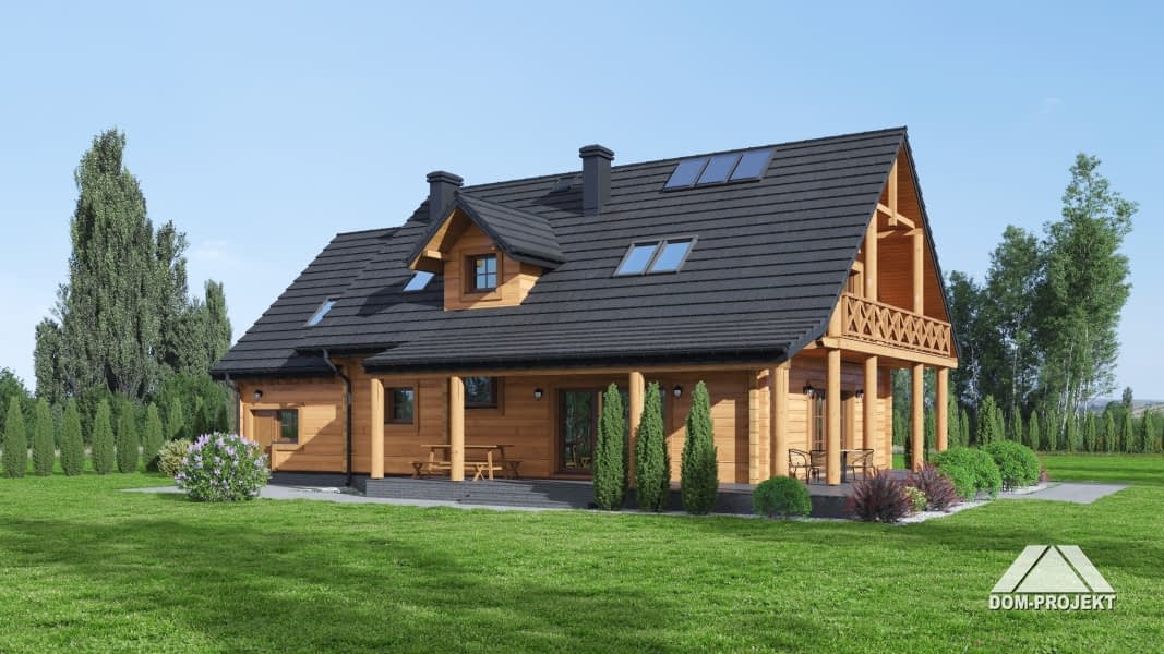 Dom z bali drewnianych. Podpiwniczony. Na parterze duży salon z kuchnią, kominkiem oraz wyjściami na zadaszony taras. Pokój, łazienka, wc, komunikacja, wiatrołap, korytarz, garaż oraz kotłownia. Na poddaszu cztery pokoje, łazienka, komunikacja, dwa balkony. W podpiwniczeniu trzy duże pomieszczenia gospodarcze, łazienka i komunikacja. Zwarta bryła budynku oraz dach dwuspadowy sprzyjają szybkiej i taniej budowie oraz niskim kosztom eksploatacji.Rzuty