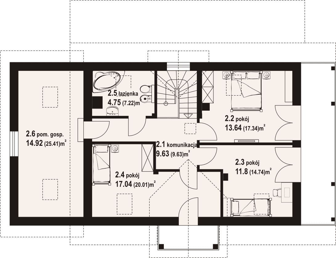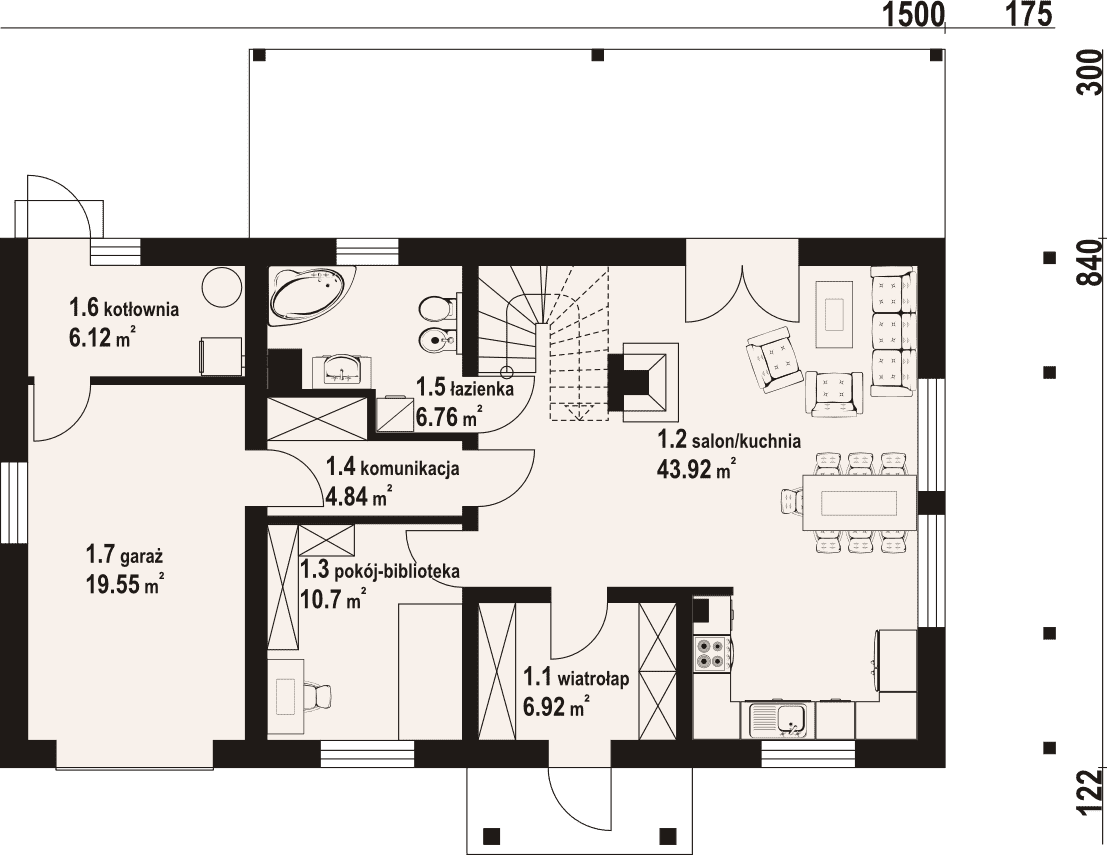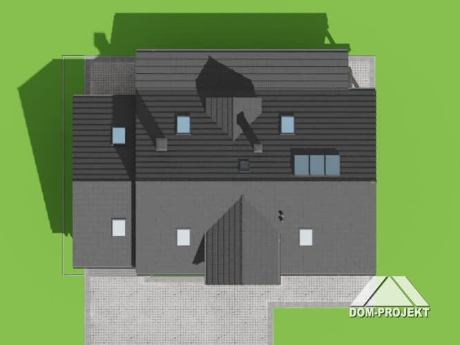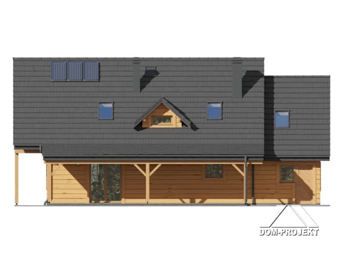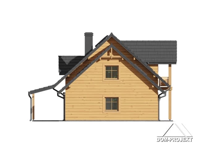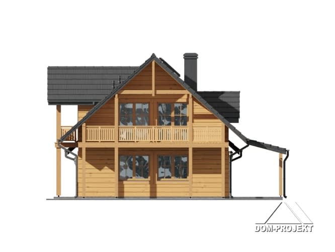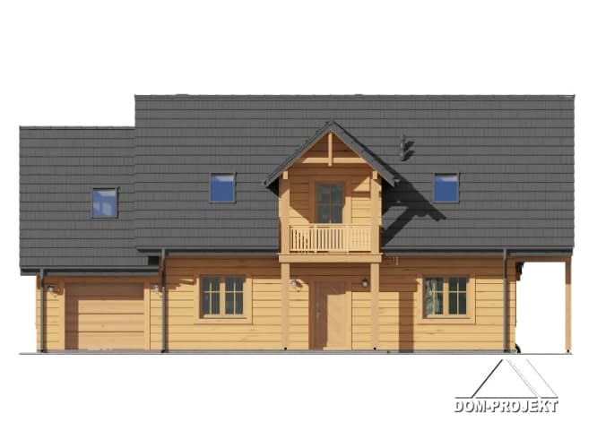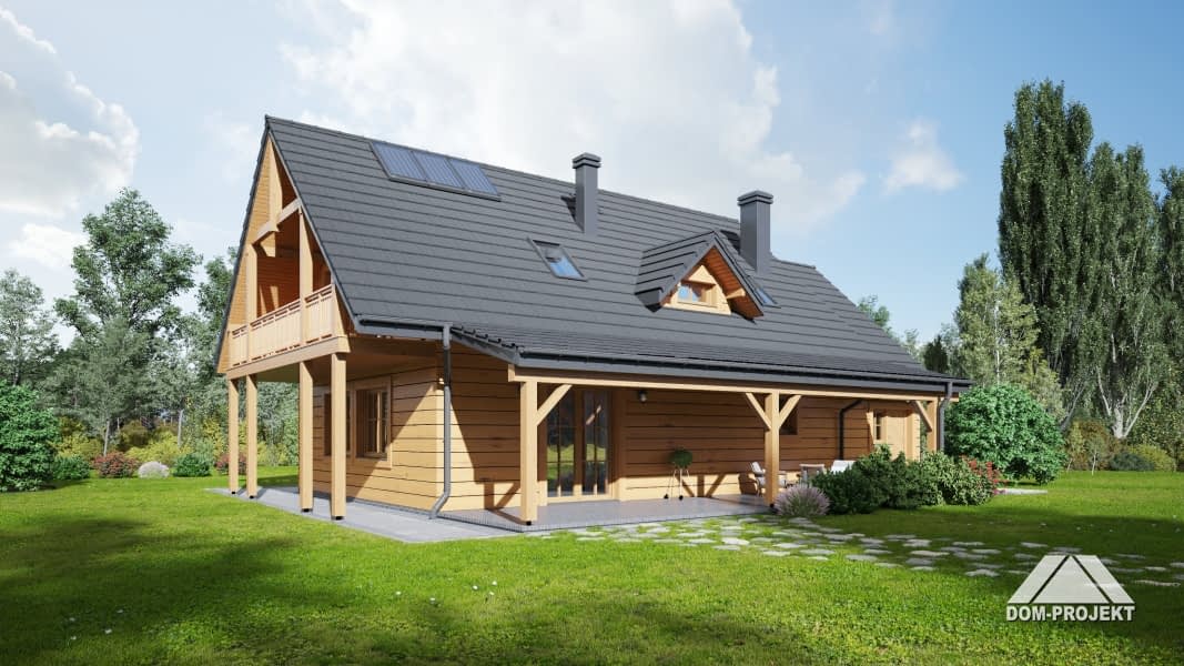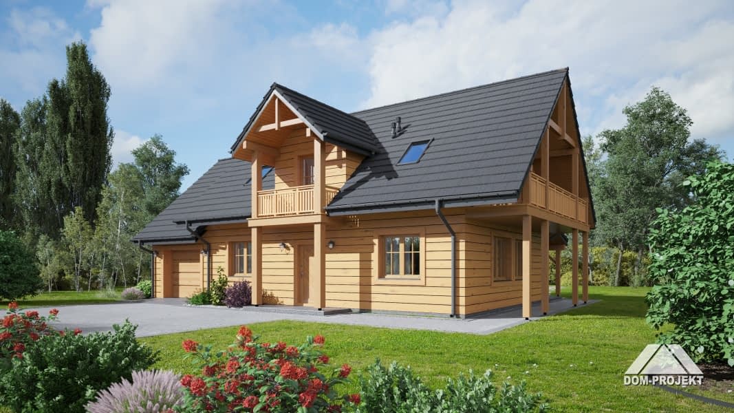 Dom murowany obłożony drewnem. Duży salon z aneksem kuchennym, kominkiem, wyjściem na zadaszony taras i schodami na poddasze. Pokój, łazienka, wiatrołap, komunikacja, garaż i kotłownia. Na poddaszu trzy pokoje, łazienka, pomieszczenie gospodarcze i dwa balkony. Zwarta bryła budynku sprzyja szybkiej i taniej budowie i niskim kosztom eksploatacji.Rzuty