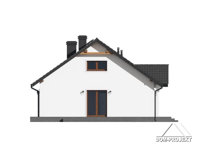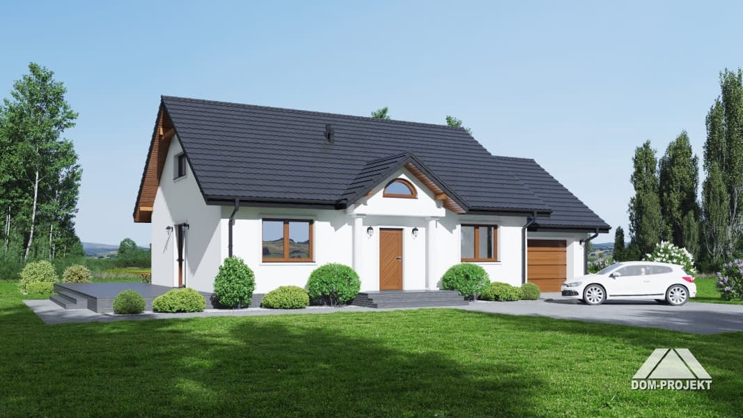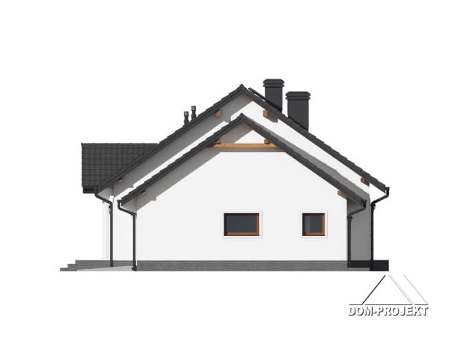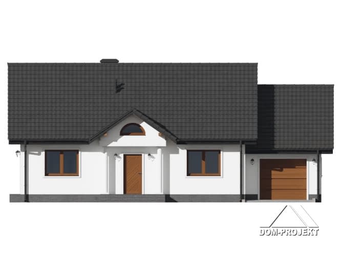 Wygodny dom parterowy. Salon z kominkiem, wyjściem na taras oraz przejściem do częściowo wydzielonej kuchni. Dwa wygodne pokoje, łazienka, korytarz, wiatrołap. Garaż oraz kotłownia. Wyjście na poddasze nieużytkowe schodami strychowymi rozkładanymi. Zwarta bryła budynku oraz dach dwuspadowy sprzyjają szybkiej i taniej budowie oraz niskim kosztom eksploatacji.Rzuty