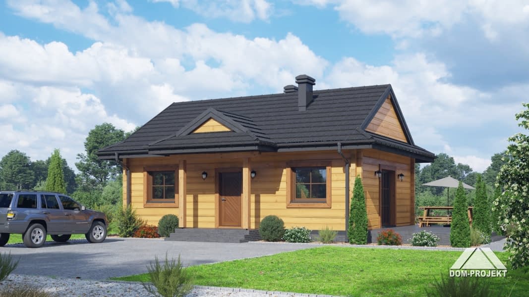 Parterowy dom z bali. Salon z kuchnią, kominkiem oraz wyjściem na taras. Dwa pokoje, łazienka, komunikacja, wiatrołap i kotłownia. Zwarta bryła budynku oraz dach dwuspadowy sprzyjają szybkiej i taniej budowie oraz niskim kosztom eksploatacji.Rzuty