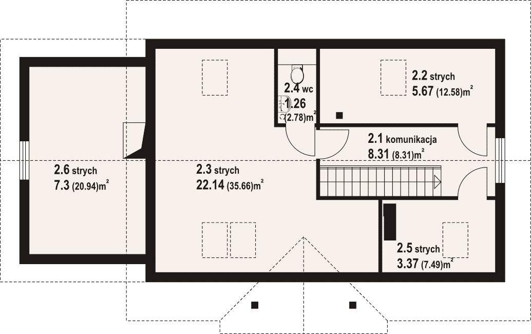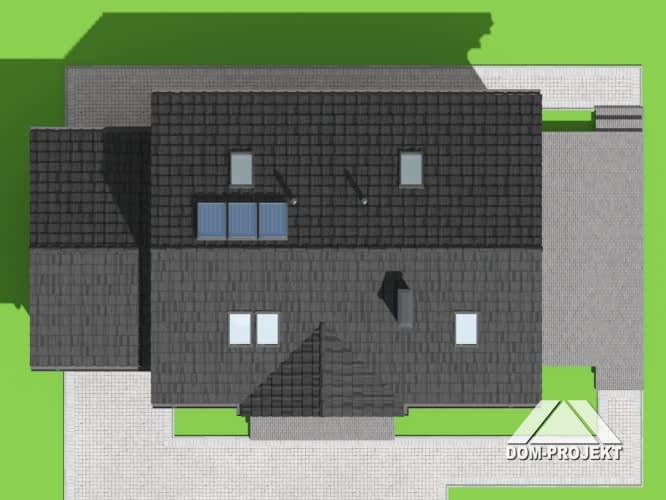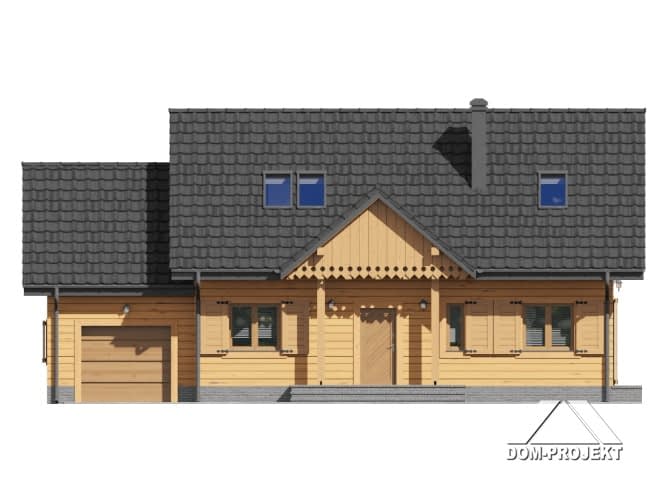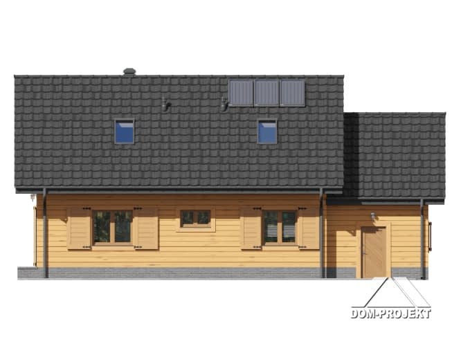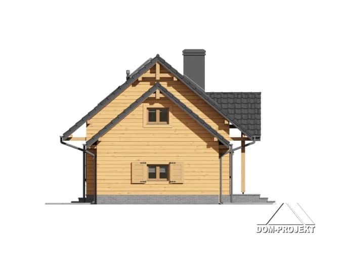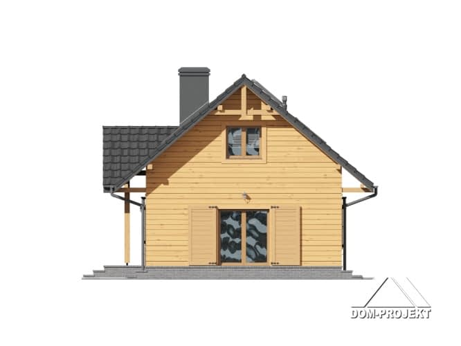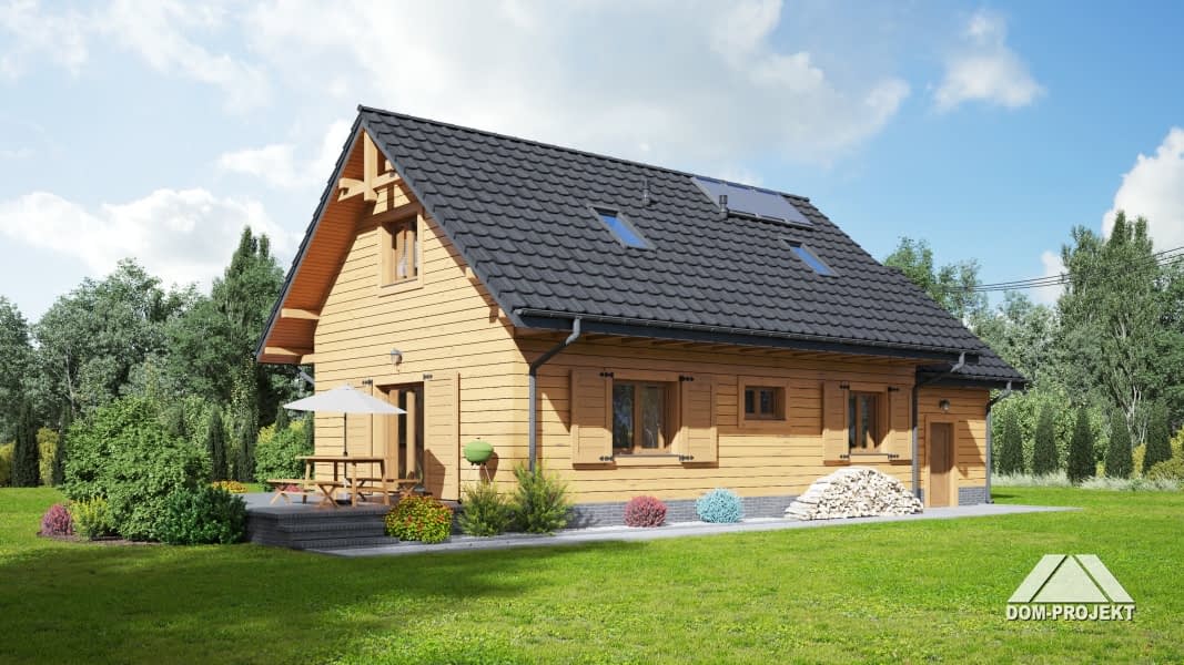 Dom w konstrukcji szkieletu drewnianego. Duży salon z aneksem kuchennym, kominkiem, wyjściem na taras i schodami na poddasze. Dwa pokoje, łazienka, komunikacja, kotłownia i pomieszczenie gospodarcze. Na poddaszu wc, komunikacja i pomieszczenia strychowe. Zwarta bryła budynku i dach dwuspadowy sprzyjają szybkiej i taniej budowie i niskim kosztom eksploatacji.Rzuty