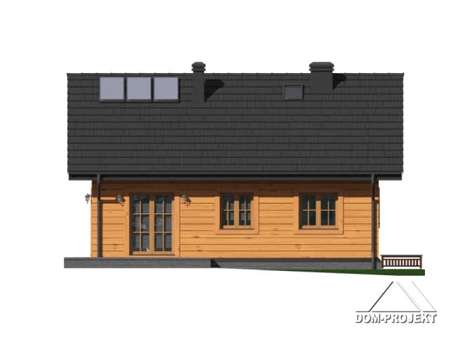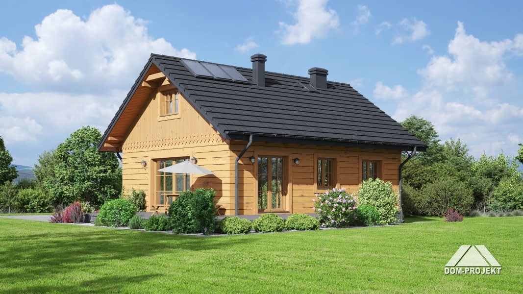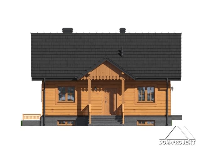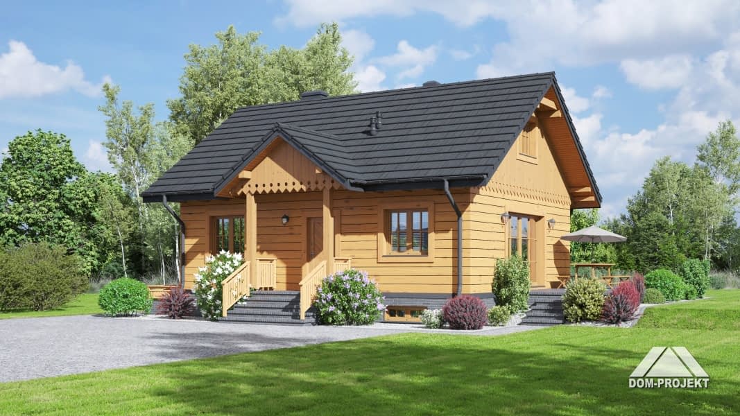 Dom parterowy w konstrukcji szkieletu drewnianego. Podpiwniczony. Na parterze duży salon z aneksem kuchennym, kominkiem i wyjściem na taras. Trzy pokoje, łazienka, wiatrołap i komunikacja. Wyjście na nieużytkowe poddasze schodami strychowymi rozkładanymi. W piwnicach: kotłownia, wc, dwa pomieszczenia gospodarcze i schody na poddasze.Rzuty