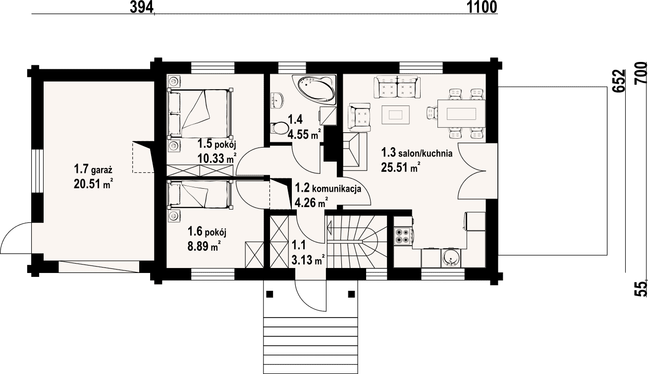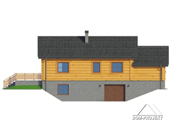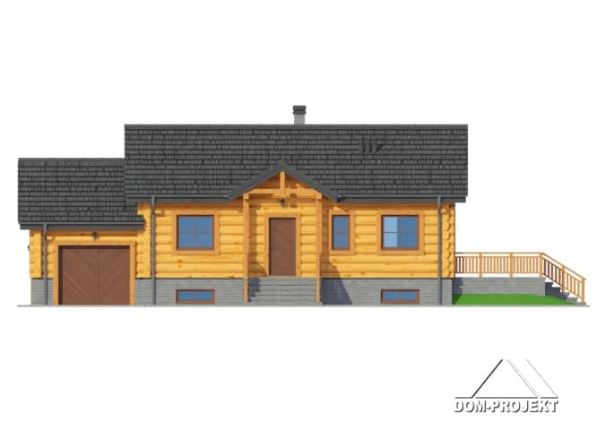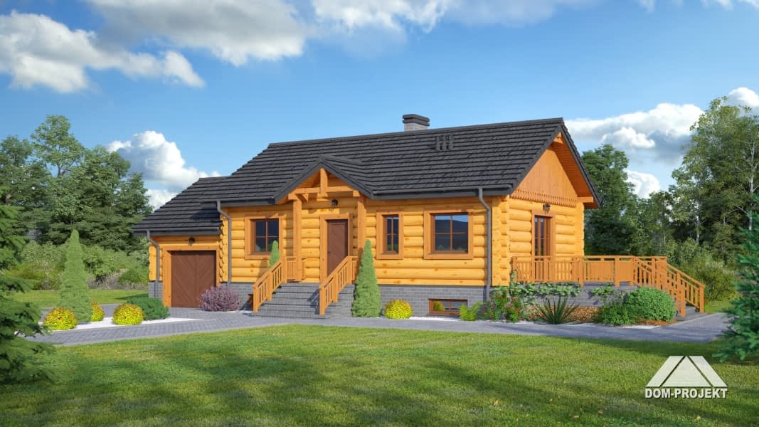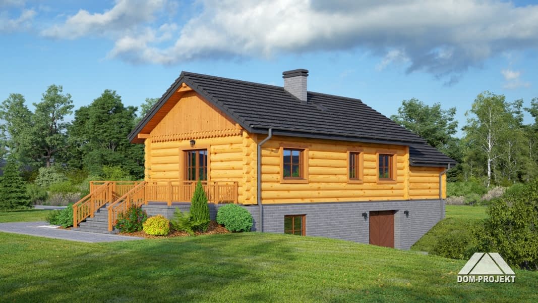 Dom z bali drewnianych. Parterowy, podpiwniczony. Duży salon z aneksem kuchennym, kominkiem i wyjściem na taras. Dwa pokoje, łazienka, komunikacja, wiatrołap i garaż. W piwnicach garaż, kotłownia, pomieszczenie rekreacyjne, łazienka i komunikacja.Zwarta bryła budynku i dach dwuspadowy sprzyjają taniej i szybkiej realizacji i niskim kosztom eksploatacji.Rzuty