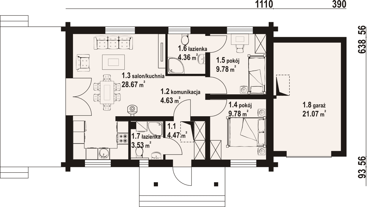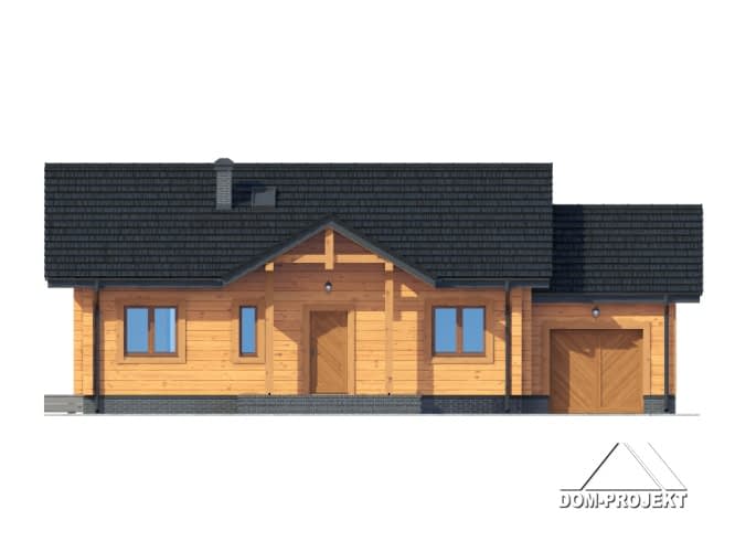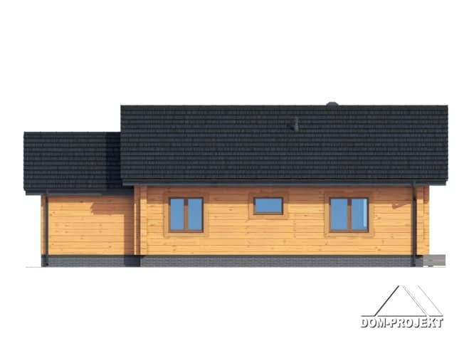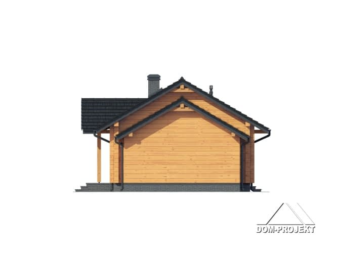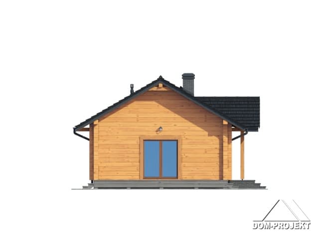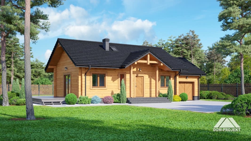 Dom parterowy w konstrukcji bala drewnianego. Duży salon z aneksem kuchennym, kominkiem i wyjściem na taras. Dwa pokoje, dwie łazienki, wiatrołap i komunikacja. Wyjście na poddasze schodami strychowymi rozkładanymi.Rzuty