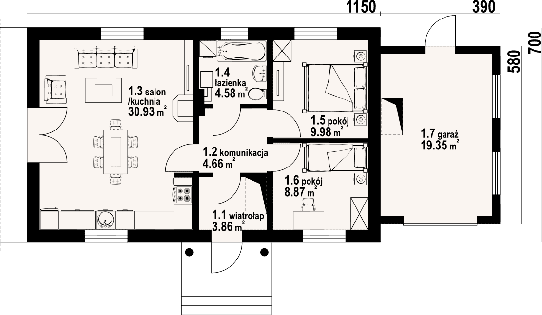 Mały dom parterowy na wąską działkę. Duży salon z aneksem kuchennym, kominkiem i wyjściem na taras. Dwa pokoje, łazienka, komunikacja, wiatrołap i garaż. Wyjścia na poddasze (strych) z garażu i wiatrołapu schodami rozkładanymi. Zwarta bryła budynku i dach dwuspadowy sprzyjają taniej i szybkiej budowie i niskim kosztom eksploatacji.Rzuty
