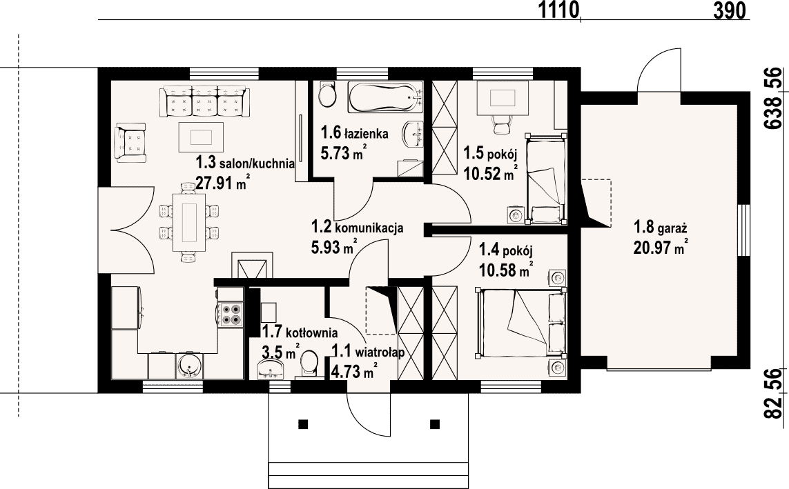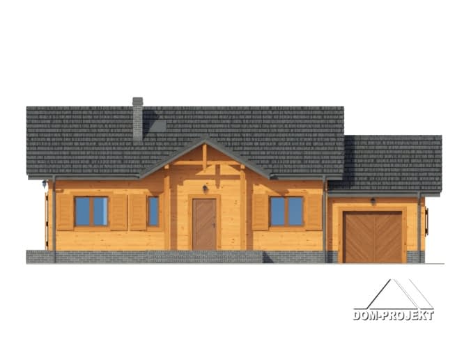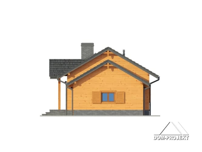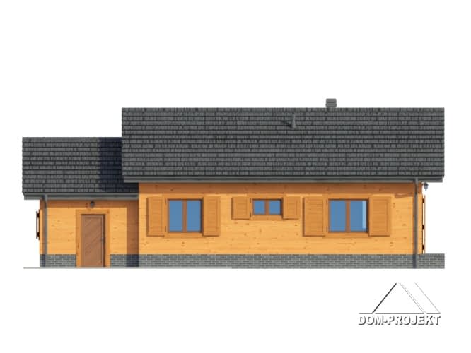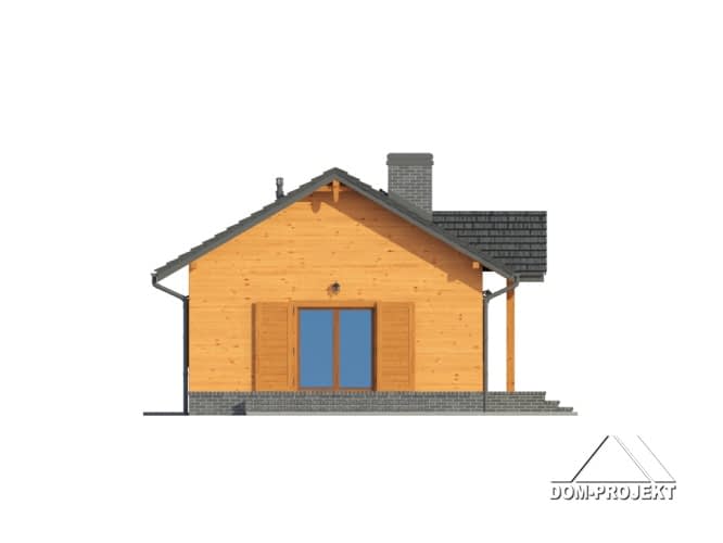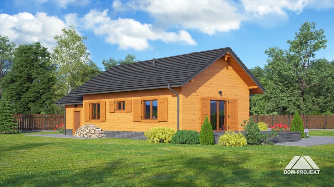 Dom parterowy w konstrukcji szkieletu drewnianego. Duży salon z aneksem kuchennym i wyjściem na taras. Dwa pokoje, łazienka, komunikacja, wiatrołap i kotłownia. Garaż na samochód osobowy. W garażu schody rozkładane na poddasze. Prosta bryła budynku i dach dwuspadowy sprzyjają szybkiej i taniej budowie i niskim kosztom eksploatacji.Rzuty