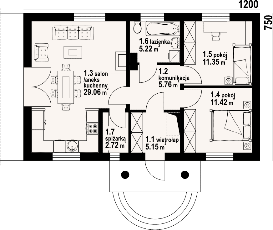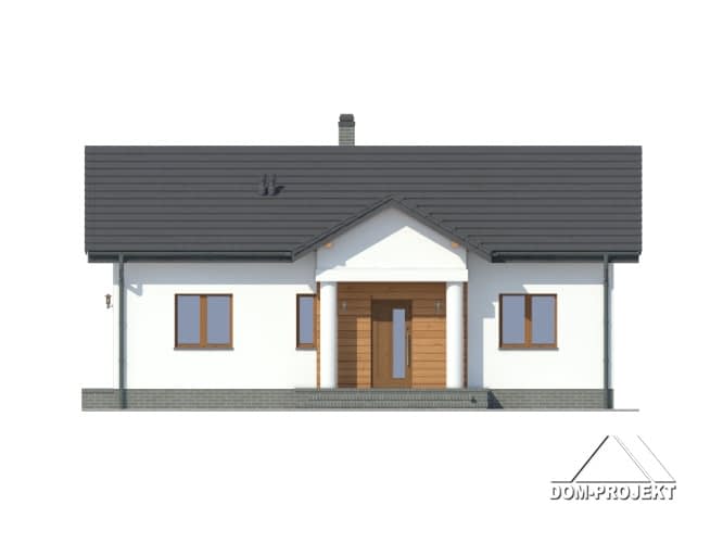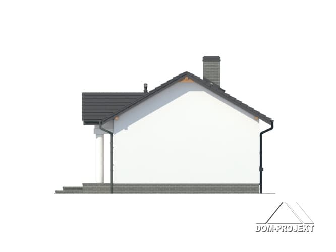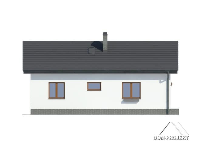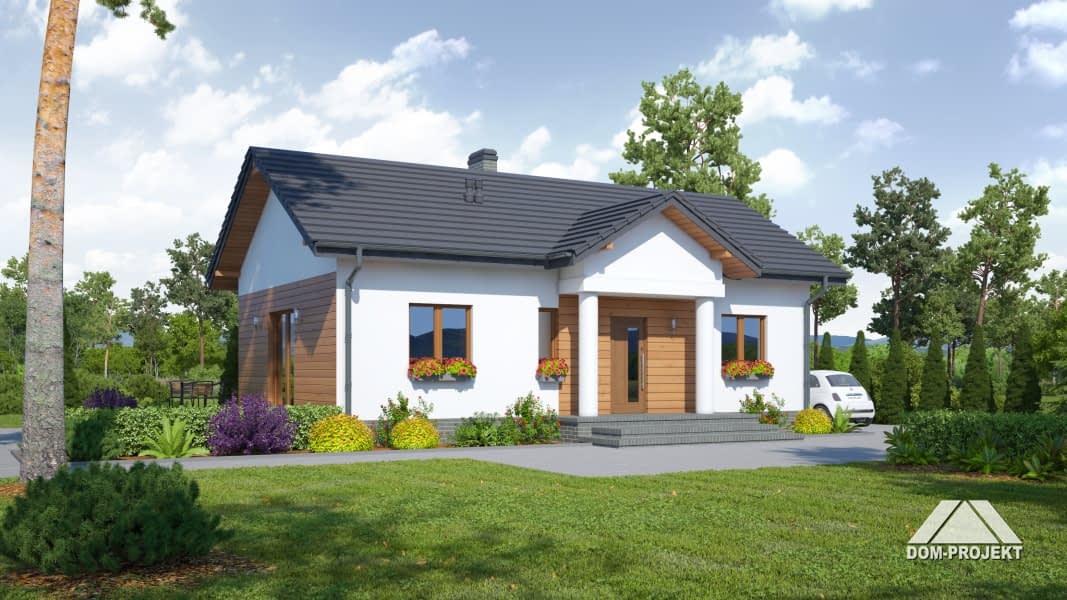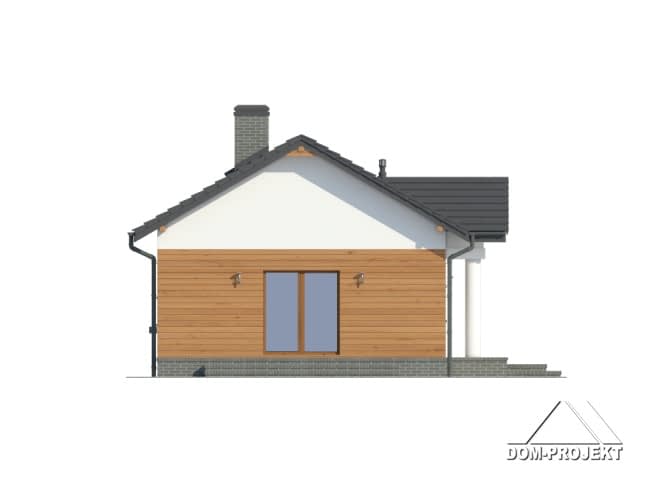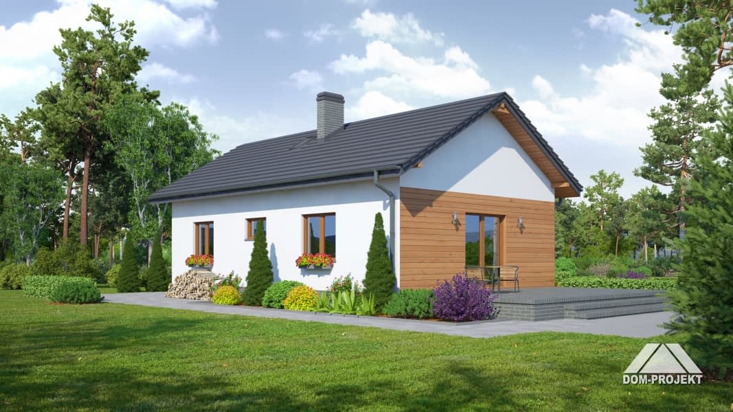 Dom parterowy. Duży salon z aneksem kuchennym, kominkiem i wyjściem na taras. Spiżarka. Dwa pokoje, łazienka, wiatrołap i komunikacja. Na poddasze wyjście schodami strychowymi rozkładanymi. Strop nad parterem umożliwia wykorzystanie poddasza jako strychu z możliwością adaptacji na cele mieszkalne. Dach dwuspadowy i zwarta bryła budynku to szybka budowa i niski koszt eksploatacji.Rzuty