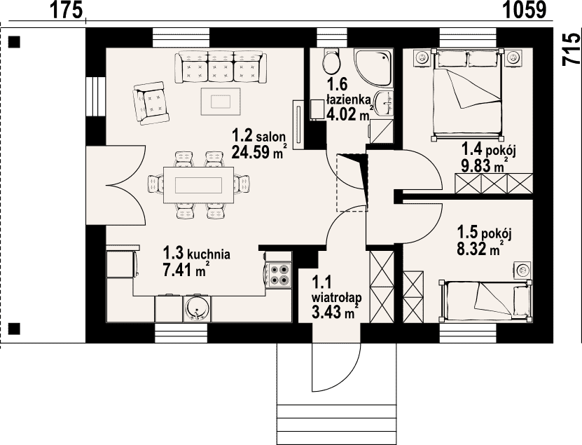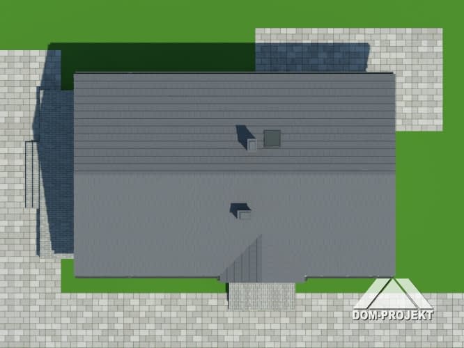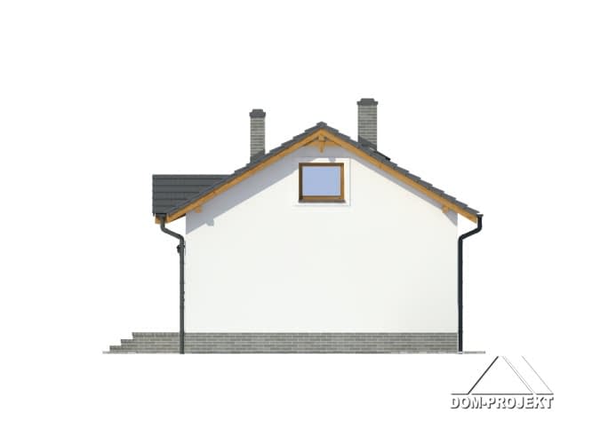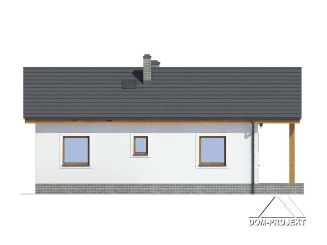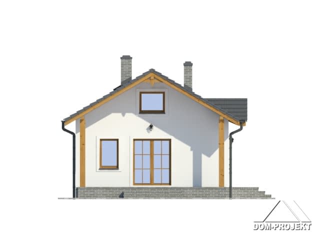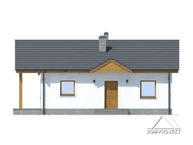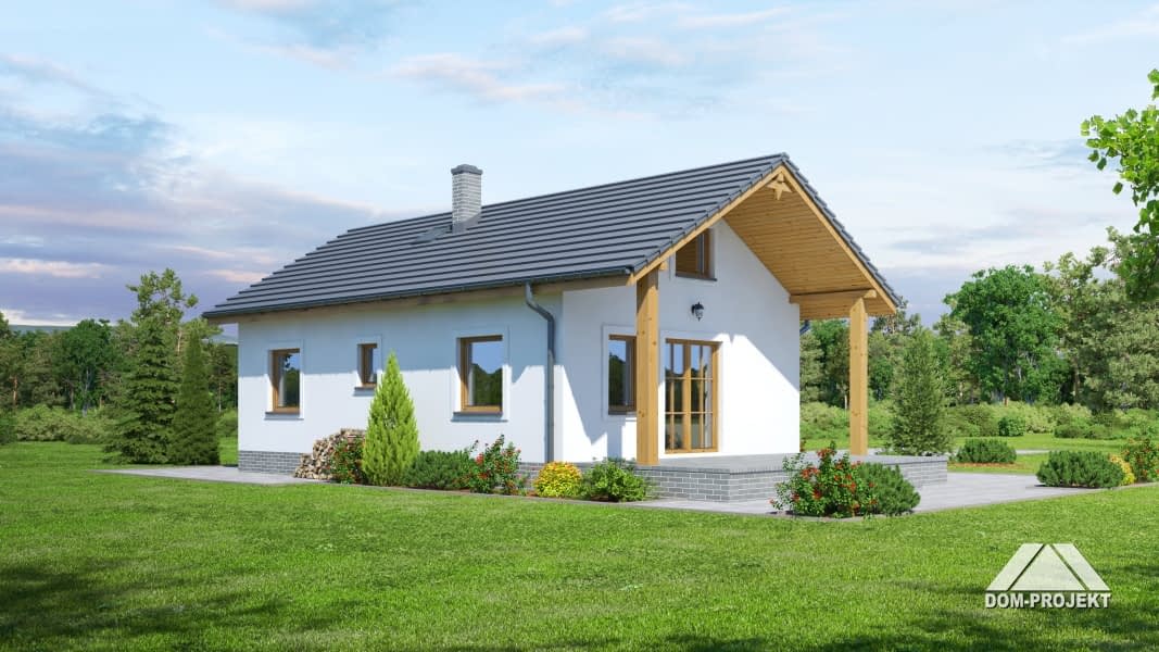 Parterowy dom jednorodzinny lub letniskowy. Salon z aneksem kuchennym, wyjściem na zadaszony taras i kominkiem. Dwa pokoje, łazienka, wiatrołap. Wejście na strych schodami rozkładanymi. Zwarta bryła budynku i dach dwuspadowy sprzyjają szybkiej i taniej budowie i niskim kosztom eksploatacji.Rzuty