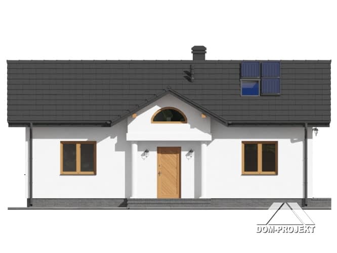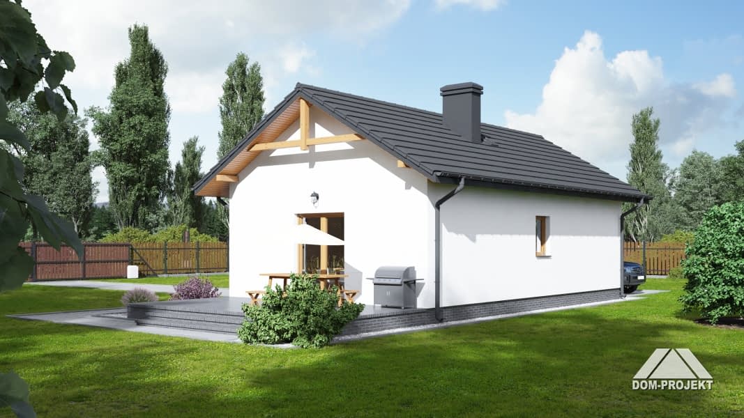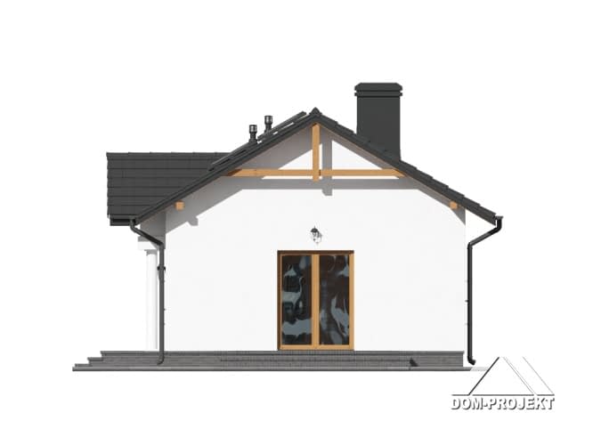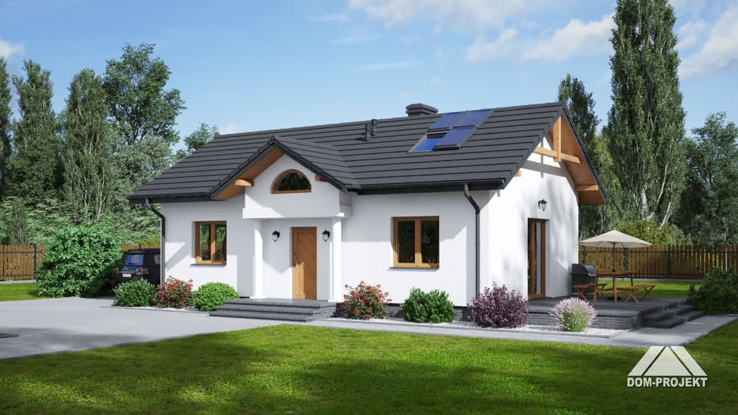 Mały dom parterowy o bardzo prostej bryle budynku. Kuchnia połączona z salonem. Kominek z możliwością rozprowadzenia ciepła. Ponadto dwie sypialnie. Instalacja solarna. Dom tani w budowie i eksploatacji.Rzuty