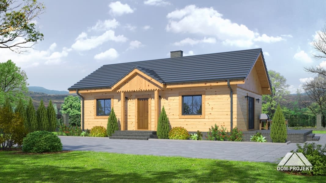 Nieduży i niedrogi w realizacji (technologia szkieletu drewnianego) dom parterowy. Prosty, funkcjonalny program użytkowy, na który składają się następujące pomieszczenia: salon z aneksem kuchennym, dwie sypialnie i łazienka. W salonie kominek.Rzuty