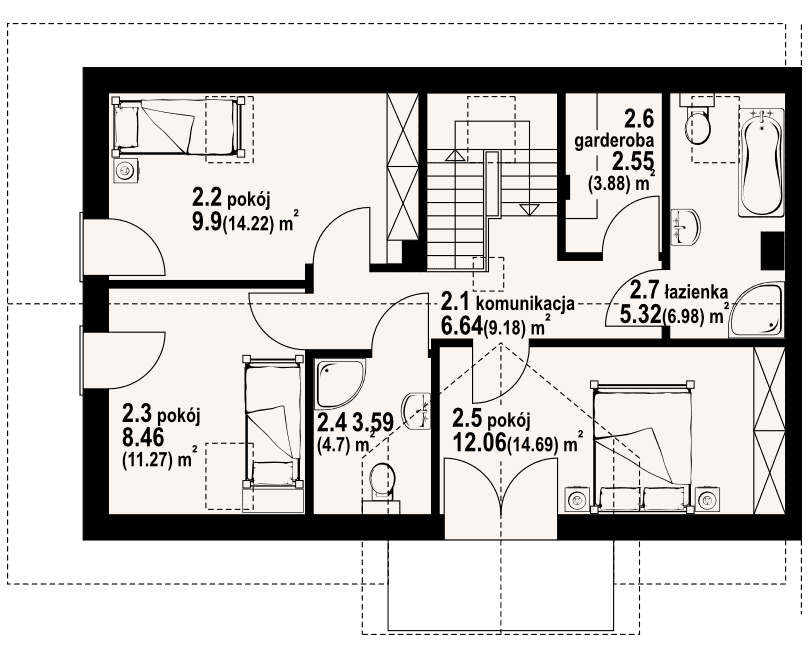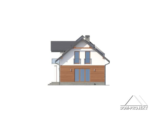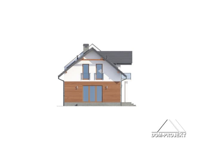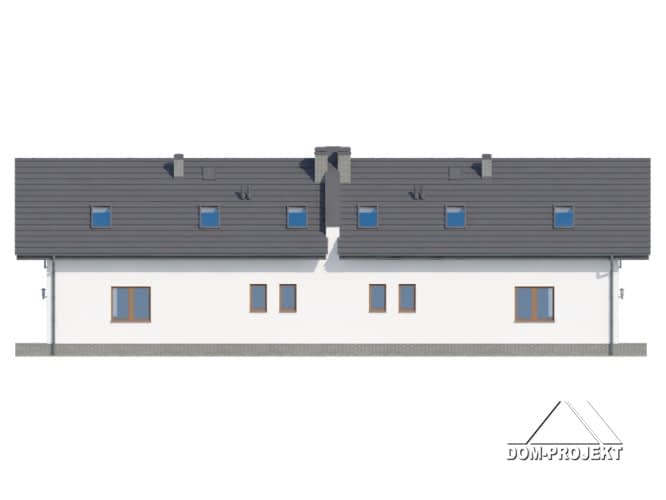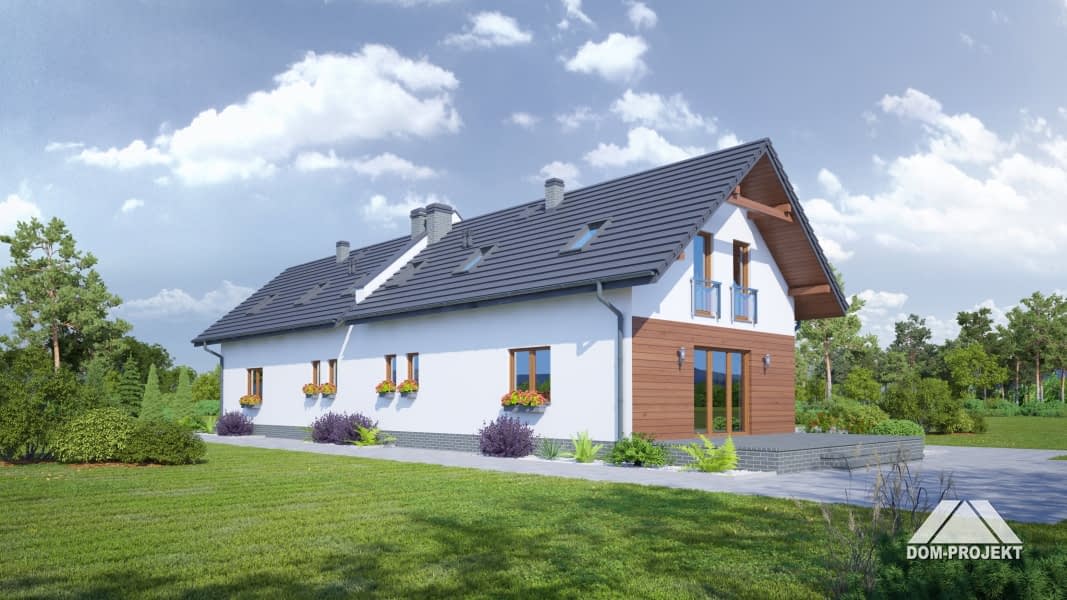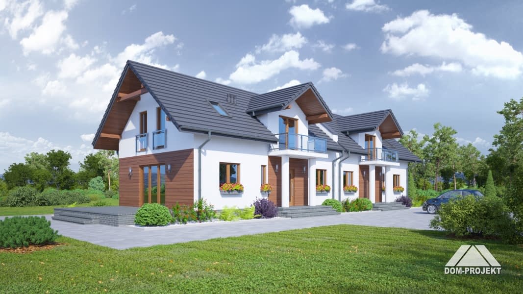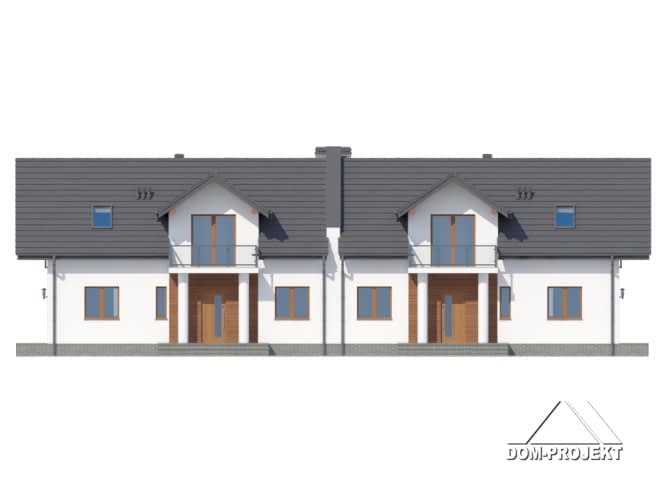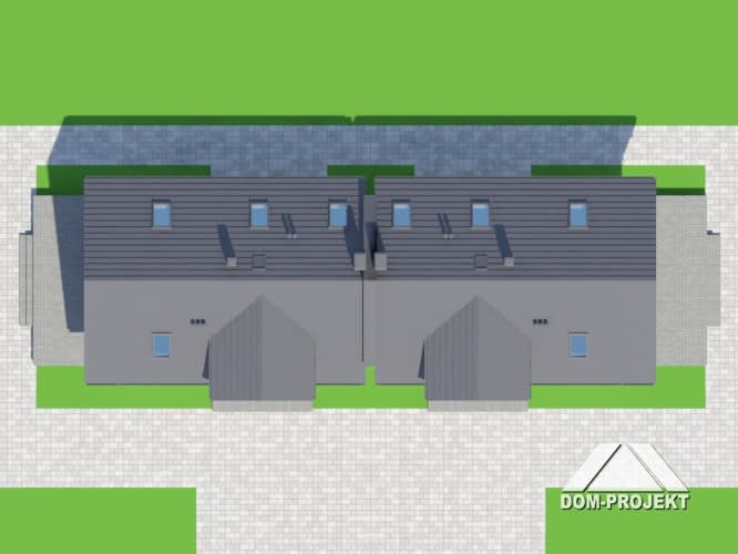 Dom- bliżniak. Każdy segment składa się z: dużego salonu z aneksem kuchennym, kominkiem i wyjściem na taras. Pokój z łazienką, wc, komunikacja, wiatrołap i spiżarka. Na poddaszu trzy pokoje, dwie łazienki, balkon, garderoba i komunikacja. Zwarta bryła budynku i dach dwuspadowy sprzyjają szybkiej i taniej budowie i niskim kosztom eksploatacji.Rzuty