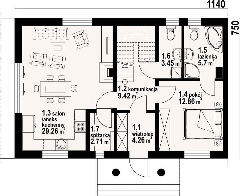 - 1.3 - salon z aneksem kuchennym29.26 m²