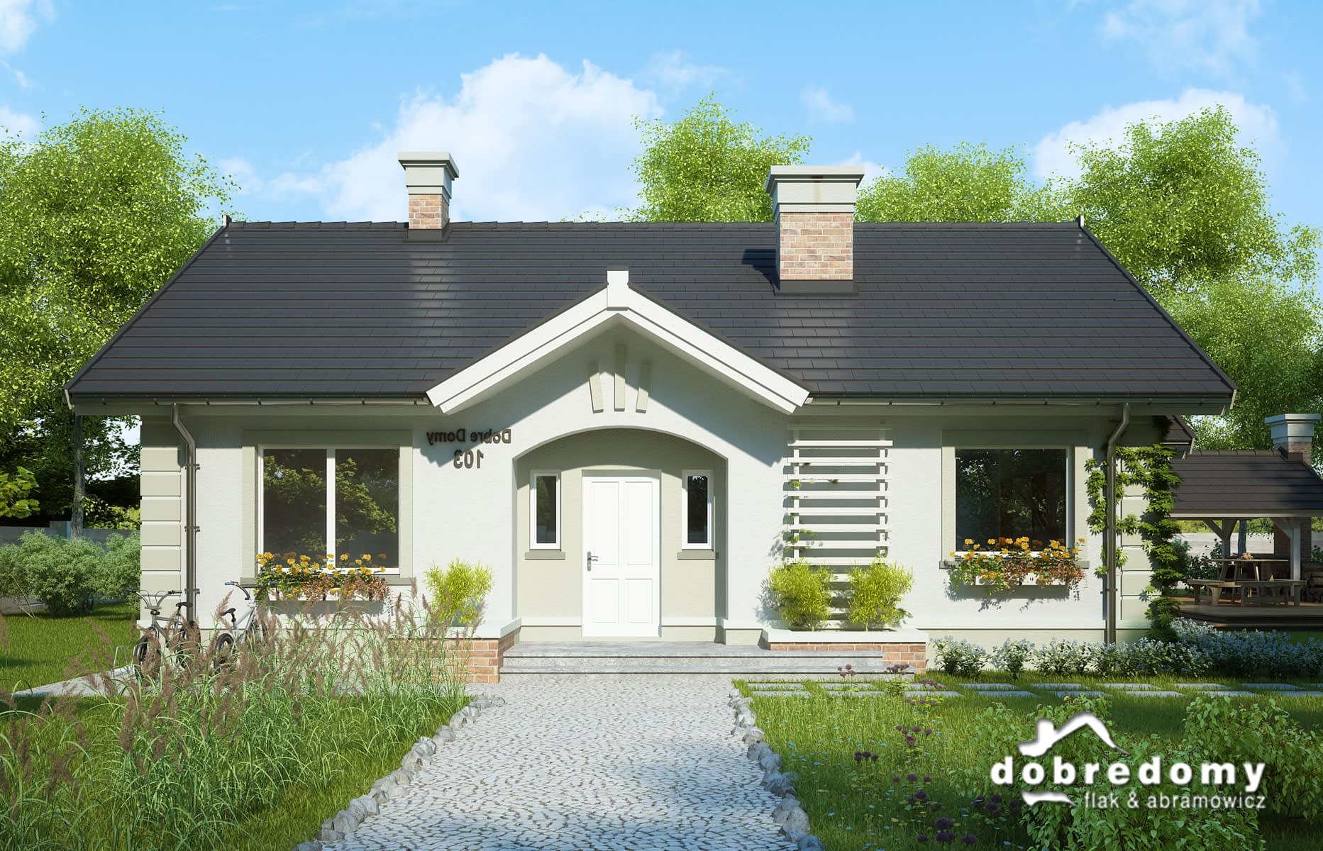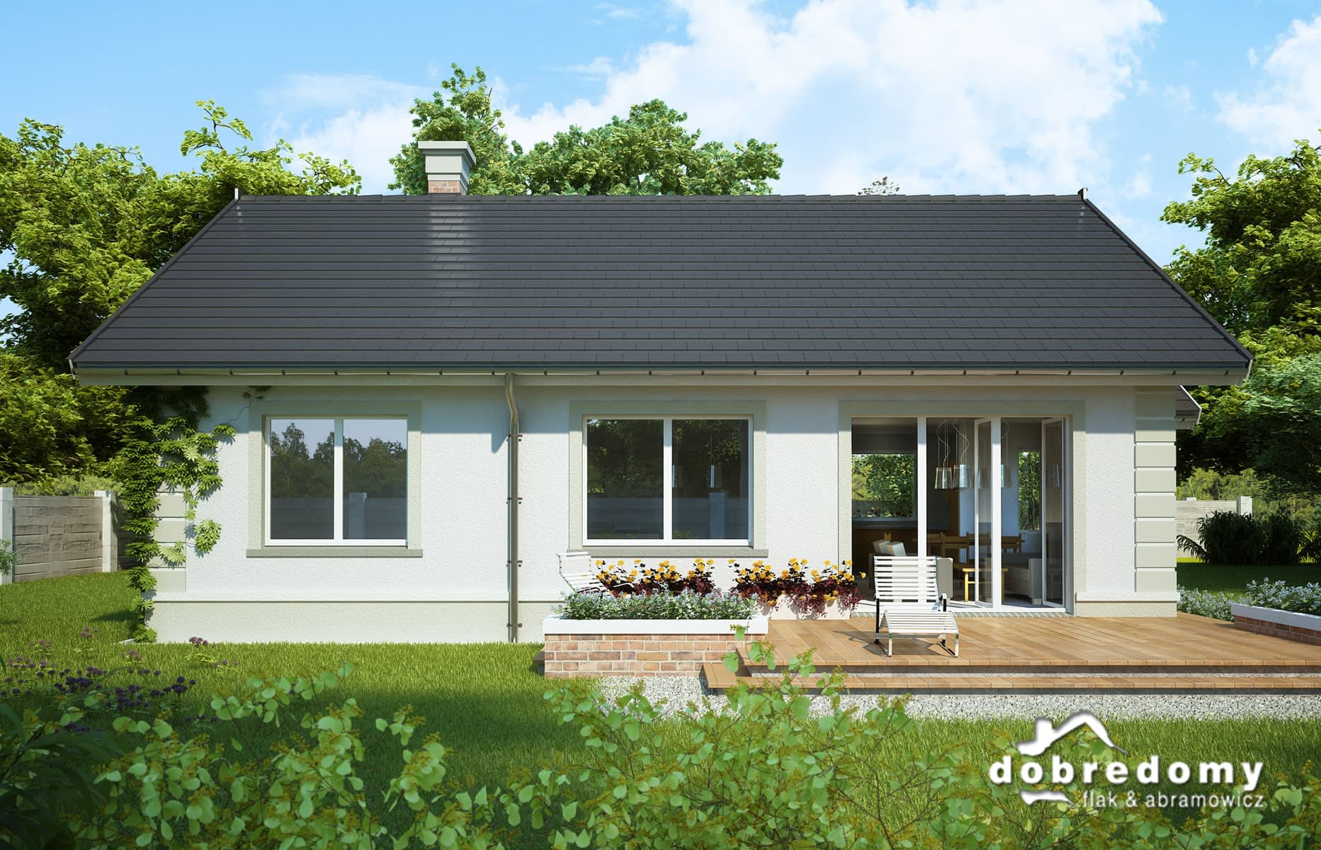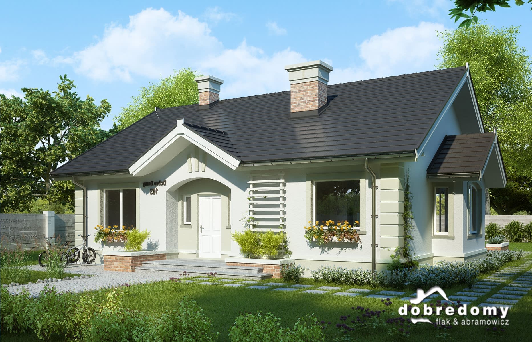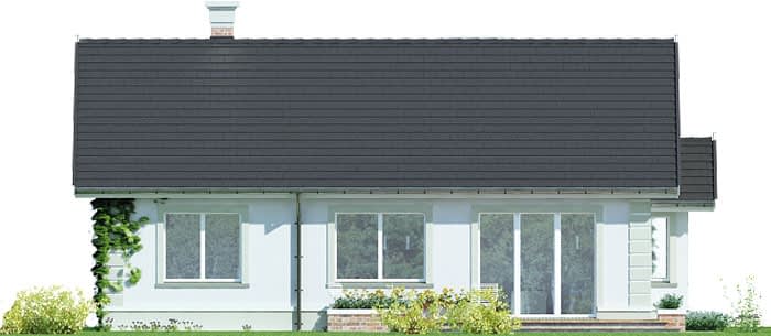 Dom parterowy, przeznaczony dla 4-5-osobowej rodziny. W części ogólnodostępnej zlokalizowano pokój dzienny połączony z jadalnią i kuchnią. Część prywatną tworzą trzy sypialnie oraz łazienka i wc. Pomieszczenie gospodarcze umieszczone tuż przy wejściu dostępne jest również z kuchni.