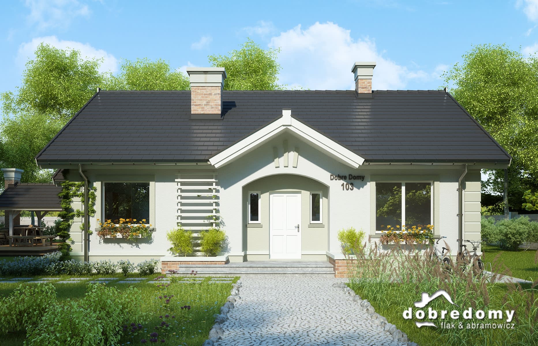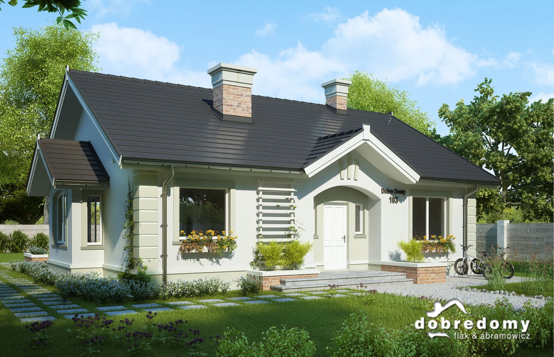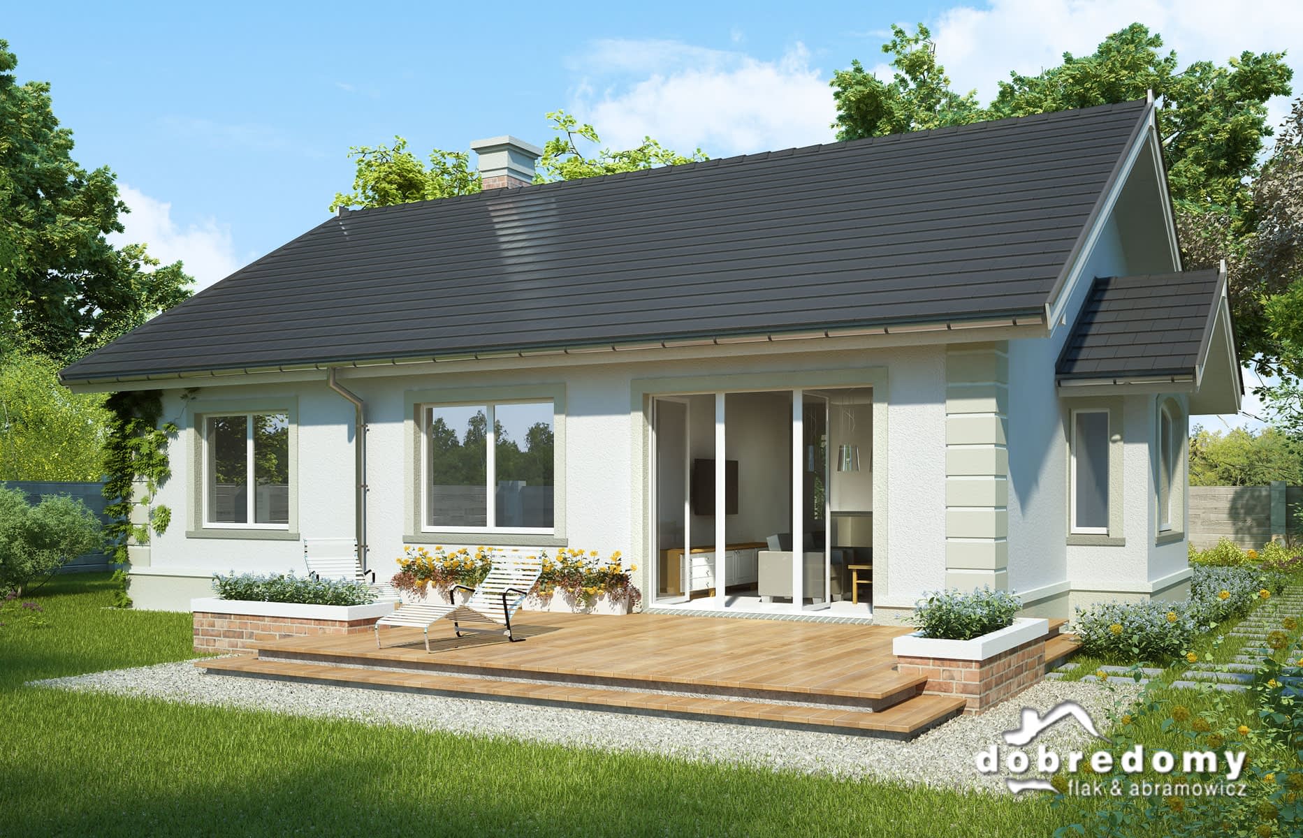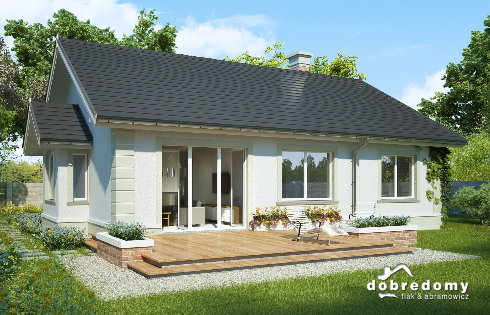 Dom parterowy, przeznaczony dla 4-5-osobowej rodziny. W części ogólnodostępnej zlokalizowano pokój dzienny połączony z jadalnią i kuchnią. Część prywatną tworzą trzy sypialnie oraz łazienka i wc. Pomieszczenie gospodarcze umieszczone tuż przy wejściu dostępne jest również z kuchni.