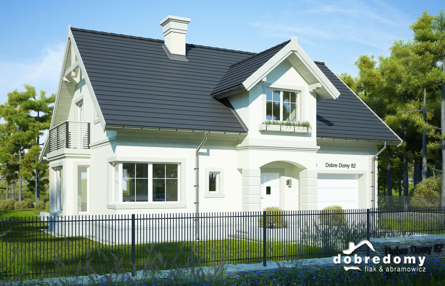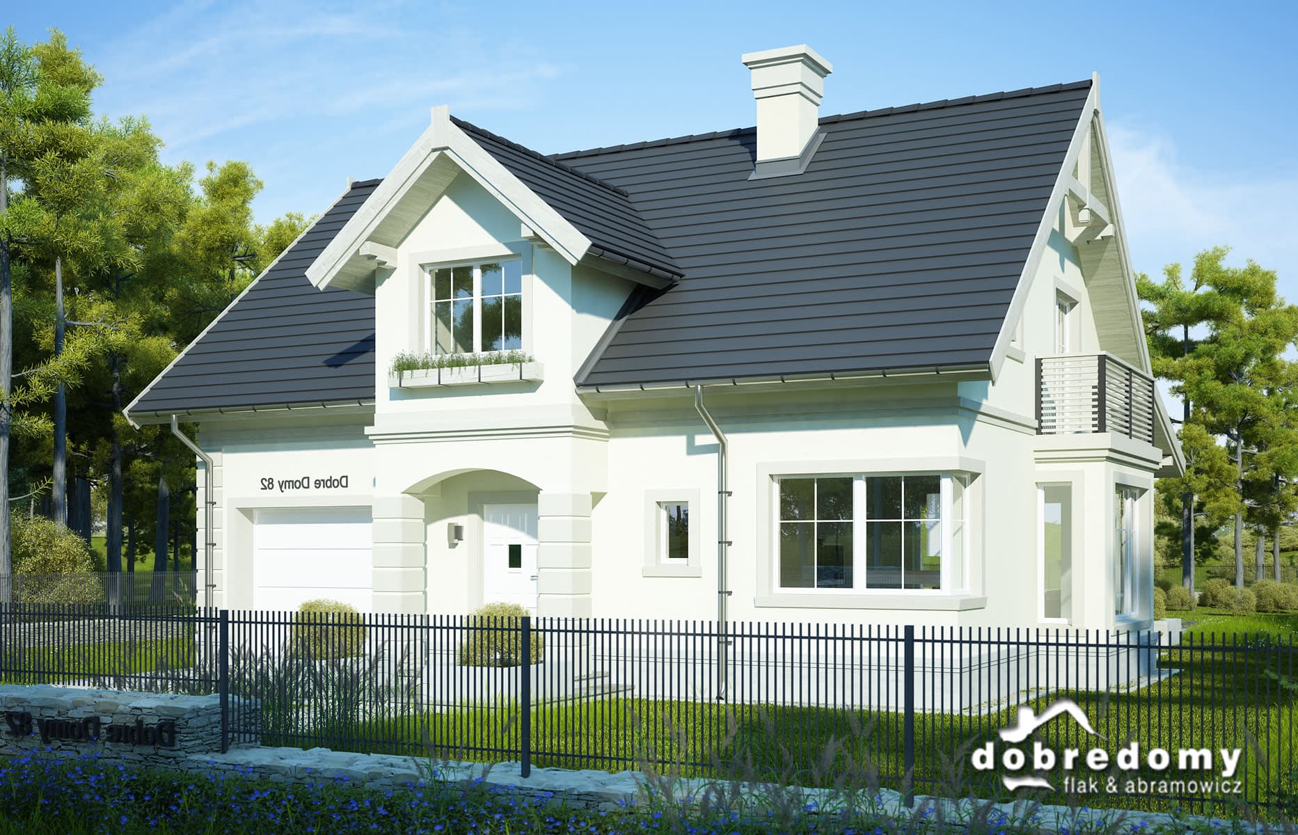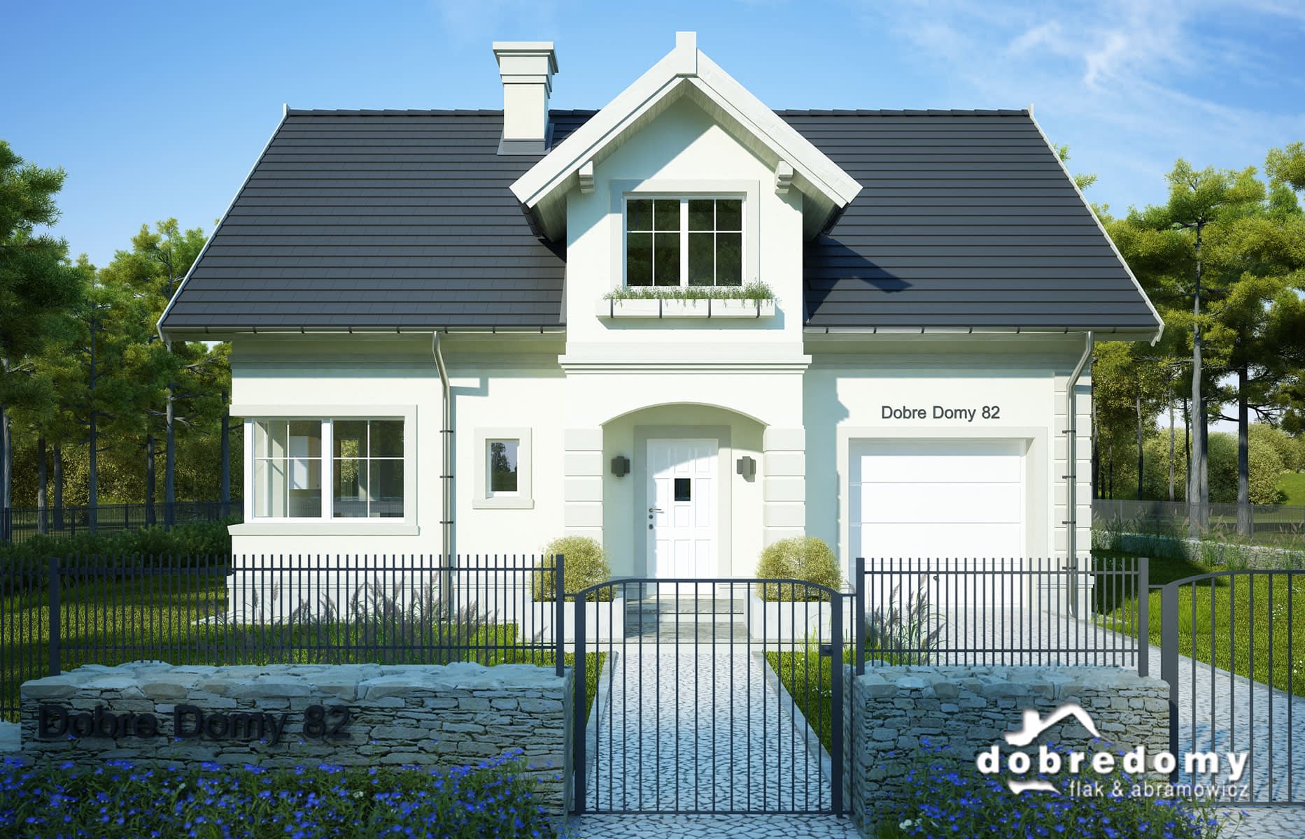 Nieduży, funkcjonlany dom z prostym, dwuspadowym dachem i garażem jednostanowiskowym. Na parterze zlokalizowano otwartą strefę dzienną - pokój dzienny połączony z jadalnią i kuchnią. Tuż przy kuchni znajduje się poręczna spiżarnia, a pod schodami łazienka. Bezpośrednio z wiatrołapu można przejść do jednostanowiskowego garażu, a dalej do pomieszczenia gospodarczego. Poddasze to strefa nocna - dwa symteryczne pokoje, duża sypialnia z garderobą oraz ogólnodostępna, przestronna łazienka z pralnią.