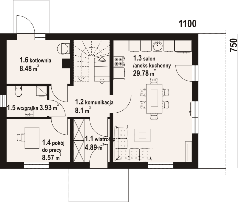 - 1.3 - salon z aneksem kuchennym29.78 m²