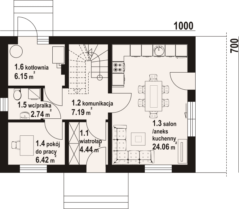 - 1.3 - salon z aneksem kuchennym24.06 m²