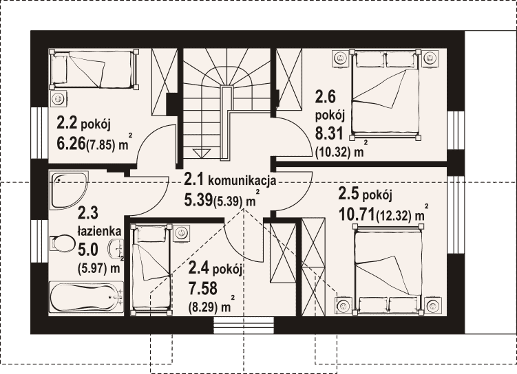 Dom z poddaszem użytkowym. Na parterze salon z aneksem kuchennym oraz wyjściem na taras. Komunikacja, wiatrołap, pokój do pracy, wc, kotłownia. Na poddaszu cztery pokoje, łazienka, komunikacja. Zwarta bryła budynku oraz dach dwuspadowy sprzyjają szybkiej i taniej budowie oraz niskim kosztom eksploatacji.Rzuty