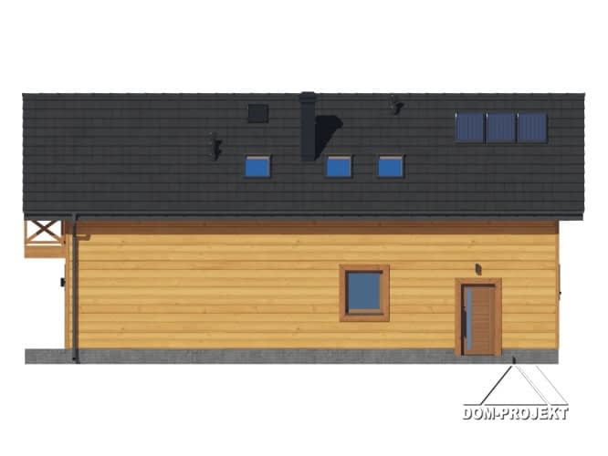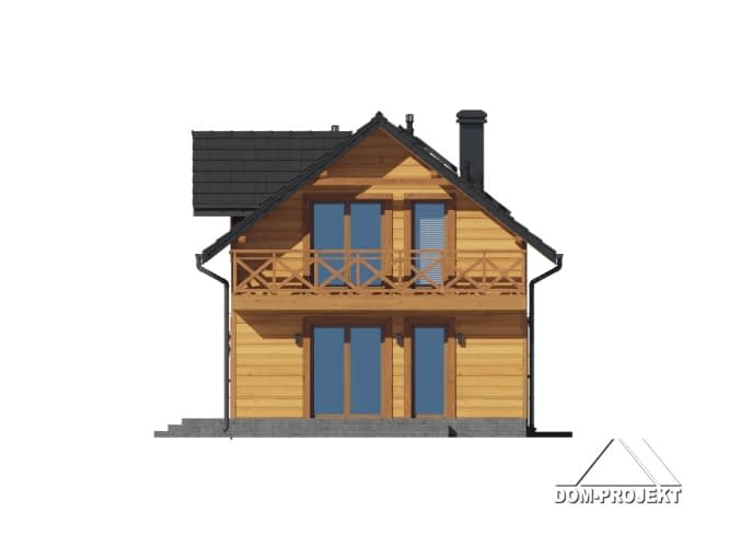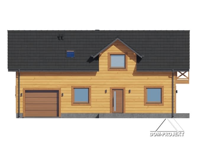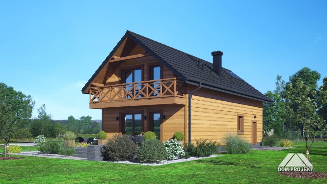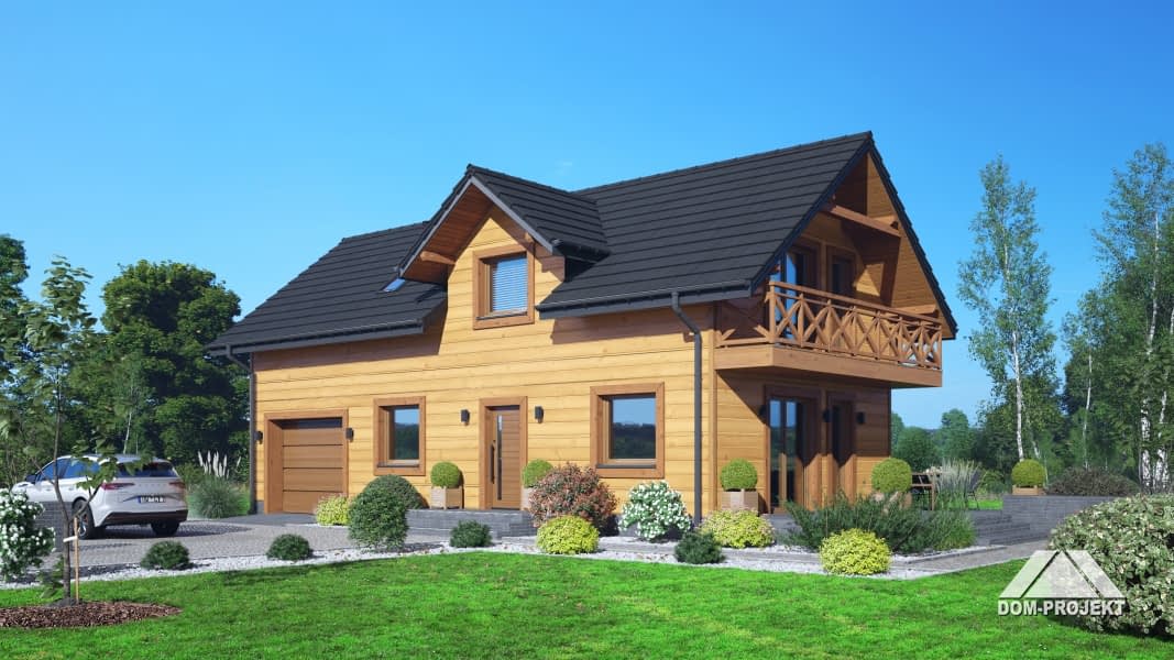 Dom w konstrukcji szkieletu drewnianego. Na parterze salon z aneksem kuchennym oraz wyjściem na taras. Pokój do pracy, łazienka, kotłownia, komunikacja, wiatrołap, garaż. Na poddaszu pięć pokoi, łazienka, komunikacja. Balkon dostępny z dwóch pokoi. Zwarta bryła budynku oraz dach dwuspadowy sprzyjają szybkiej i taniej budowie oraz niskim kosztom eksploatacji.Rzuty