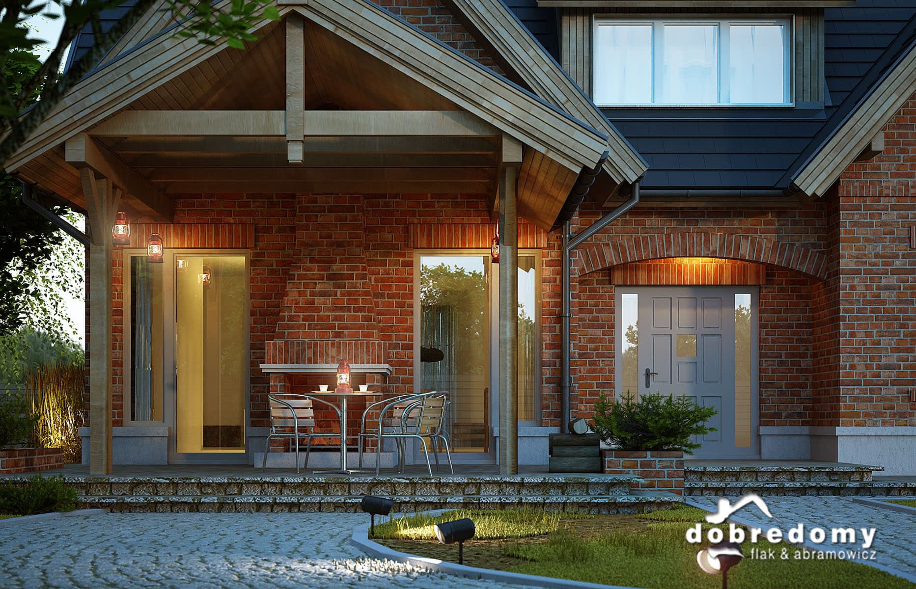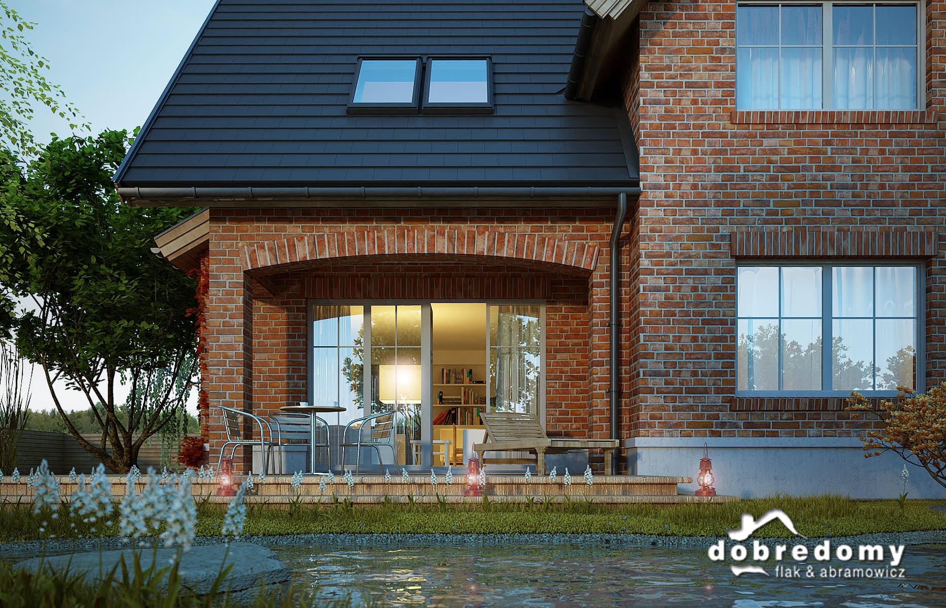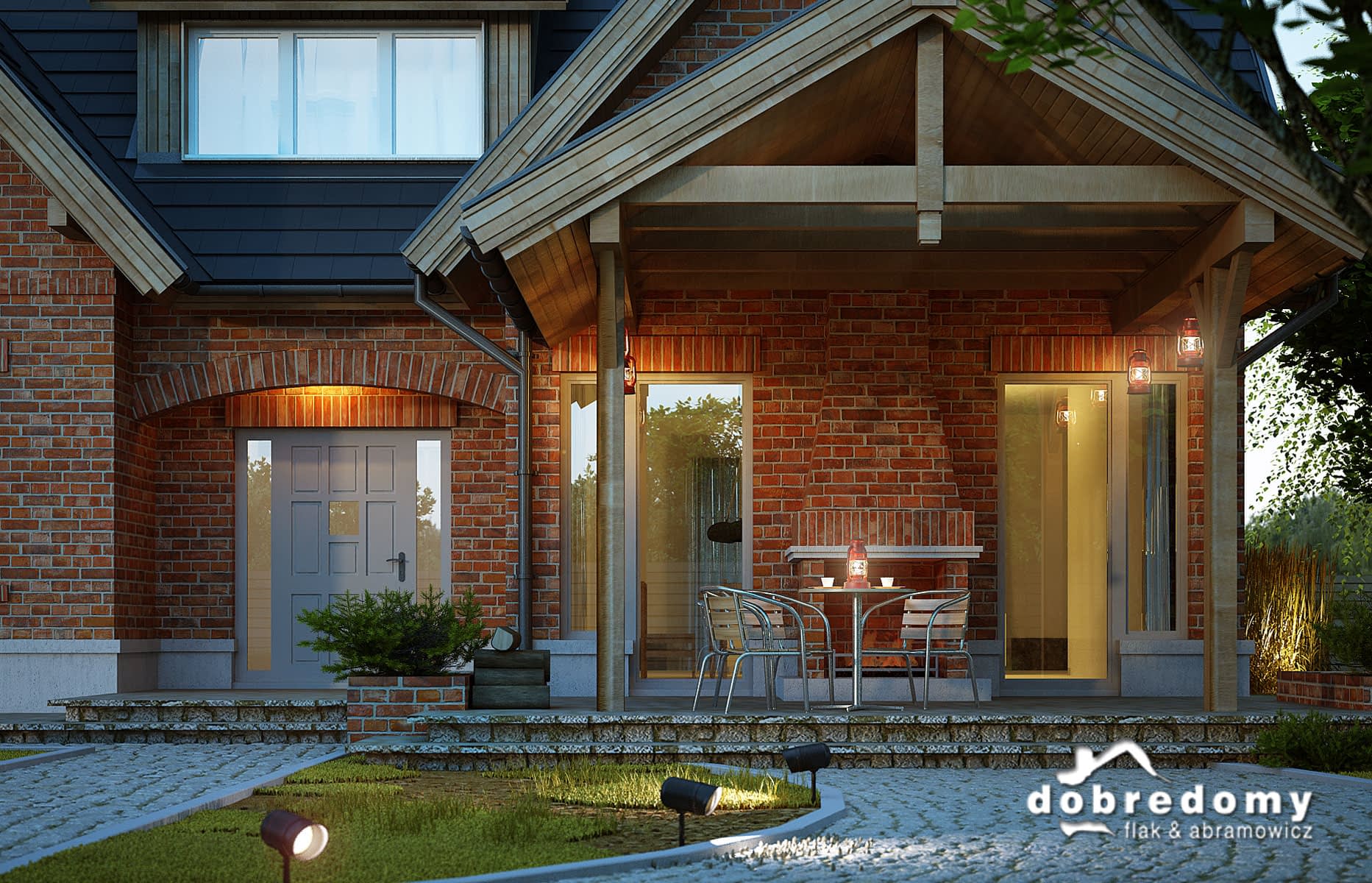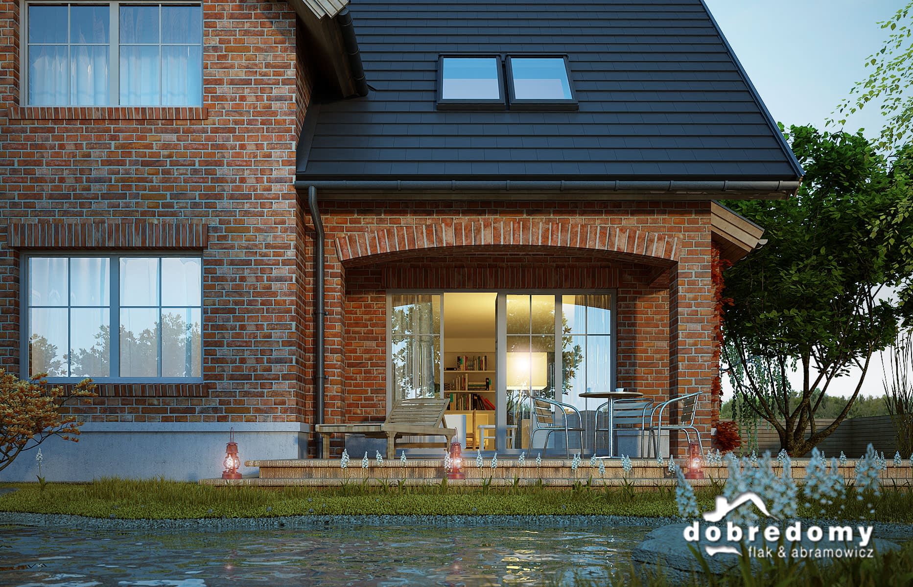 Dom z użytkowym poddaszem, dla 4-6-osobowej rodziny. Na parterze znajdują się: przestronny hall z odsłoniętą klatką schodową, pokój dzienny z jadalnią i wyjściem na zadaszony taras z kominkiem, kuchnia z dostępem, poprzez pom. gospodarcze, do garażu, łazienka oraz pokój gościnny/gabinet. Na poddaszu są trzy pokoje, w tym jeden z własną garderobą, ogólnodostępna łazienka, garderoba oraz strych. Projekt dostępny w wersji z garażem dwustanowiskowym - Miły II. Projekt może być wykorzystany do zabudowy bliźniaczej.