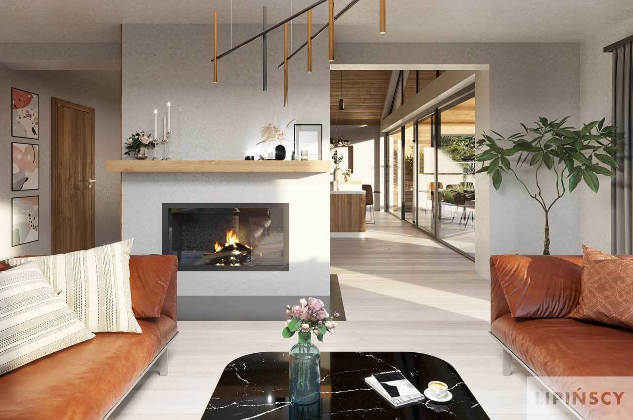 Mindelo II to propozycja dla wszystkich mniej licznych rodzin, które zachwycił nasz projekt Mindelo, ale uważają, że jest nieco za duży jak na ich potrzeby. Zachowaliśmy w nim to, co w Mindelo najlepsze, czyli efektowną, przestronną i wygodną część dzienną z dużą przestrzenią wypoczynkową po jednej stronie z kominkiem, po drugiej - z telewizorem, a także kuchnią połączoną z jadalnią i uzupełnioną o spiżarnię oraz pomieszczenie wc. Miejsce to zaprasza do wspólnego spędzania czasu. W wydzielonej części nocnej znajduje się duża sypialnia rodziców z własną garderobą oraz mniejszy pokój dla dziecka. Od strony południowej przez całą długość domu ciągnie się wygodny taras, an który są wejścia z wszystkich przylegających do niego pomieszczeń mieszkalnych. Do dyspozycji mieszkańców jest tu też przestronna łazienka i przydatna pralnia. Całości projektu dopełnia garaż dwustanowiskowy i pomieszczenie gospodarcze dostępne z wiatrołapu.