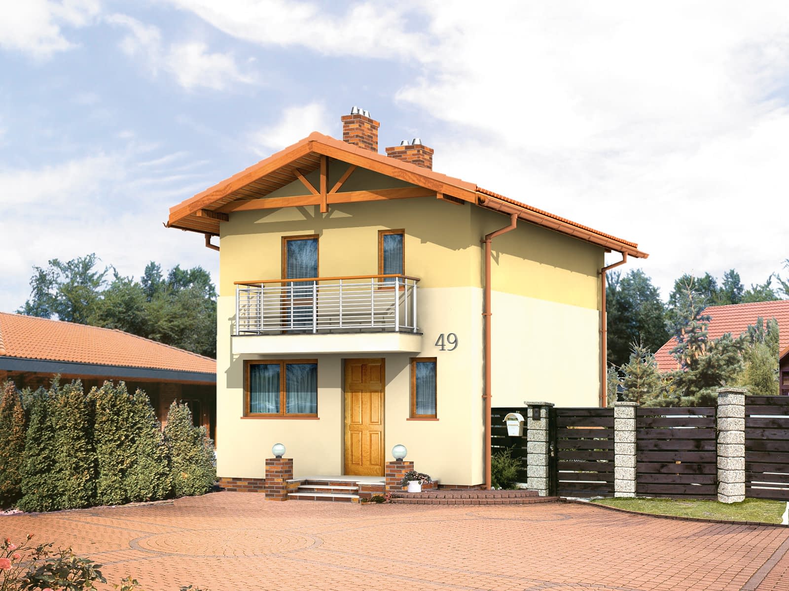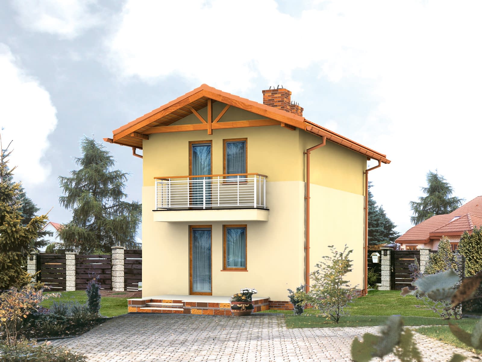 Mały, funkcjonalny domek jednorodzinny dla 2 – 3-osobowej rodziny. Dwie pełne kondygnacje. Idealny na wąską działkę.Konstrukcja