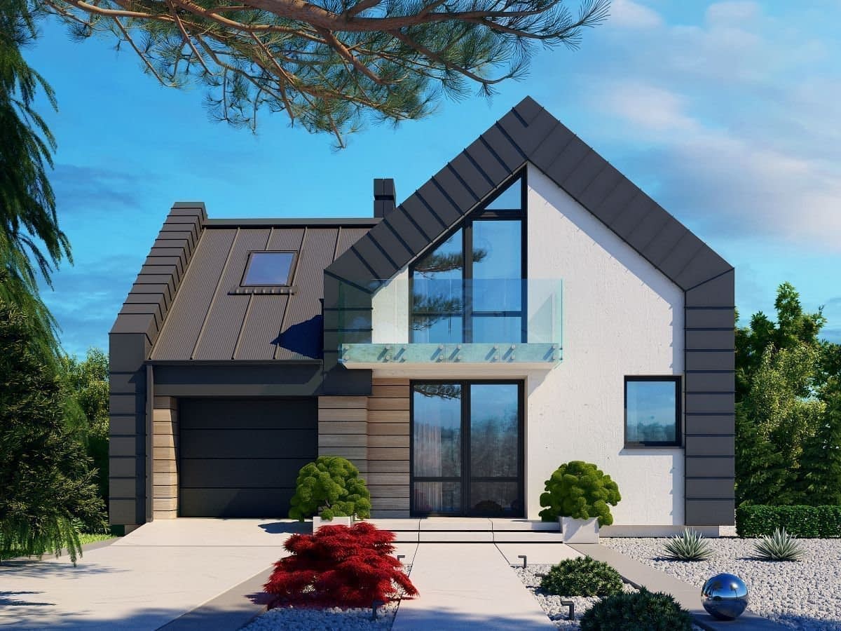 Mniejsza powierzchnia użytkowa sprawia, że dom jest znacznie tańszy w budowie oraz późniejszej eksploatacji. Przemyślane rozwiązania pozwalają na wygodne życie 4-5 osobowej rodziny. Jest to dom idealny dla osób ceniących dobrze wykorzystaną przestrzeń użytkową i wygodę. Dom został zaprojektowany zgodnie z najnowszymi trendami w architekturze. Strefa dzienna domu to przede wszystkim duży salon z jadalnią oraz kuchnią. Na parterze znajduje się także wiatrołap, łazienkę oraz pokój, który można zaaranżować według swoich potrzeb, np. na sypialnię. Ponadto dom ma przestronny garaż i pomieszczenie gospodarcze. Na poddaszu znajdują się dwie sypialnie (każda z nich posiada balkon), gabinet, hol oraz łazienkę. Ciągi komunikacyjne domu ograniczyliśmy do niezbędnego minimum. Dom standardowo wyposażony jest w rekuperację z odzyskiem ciepła.
