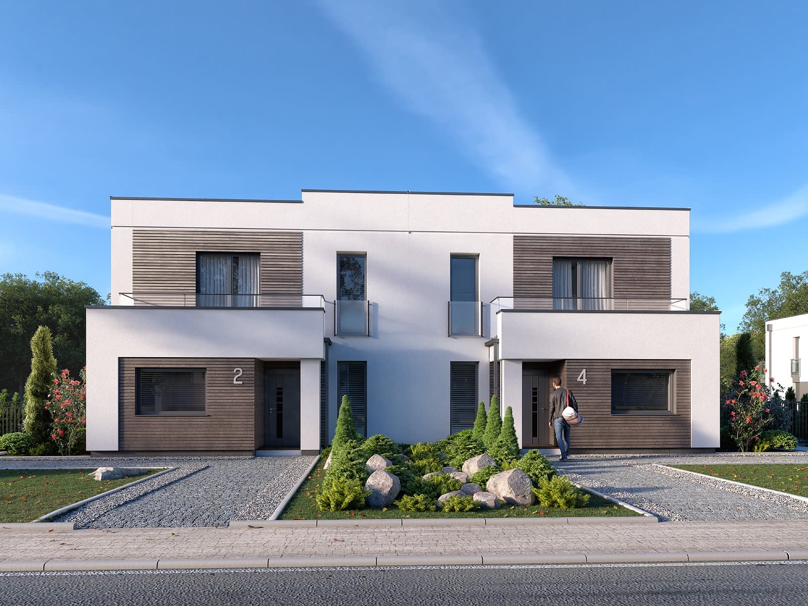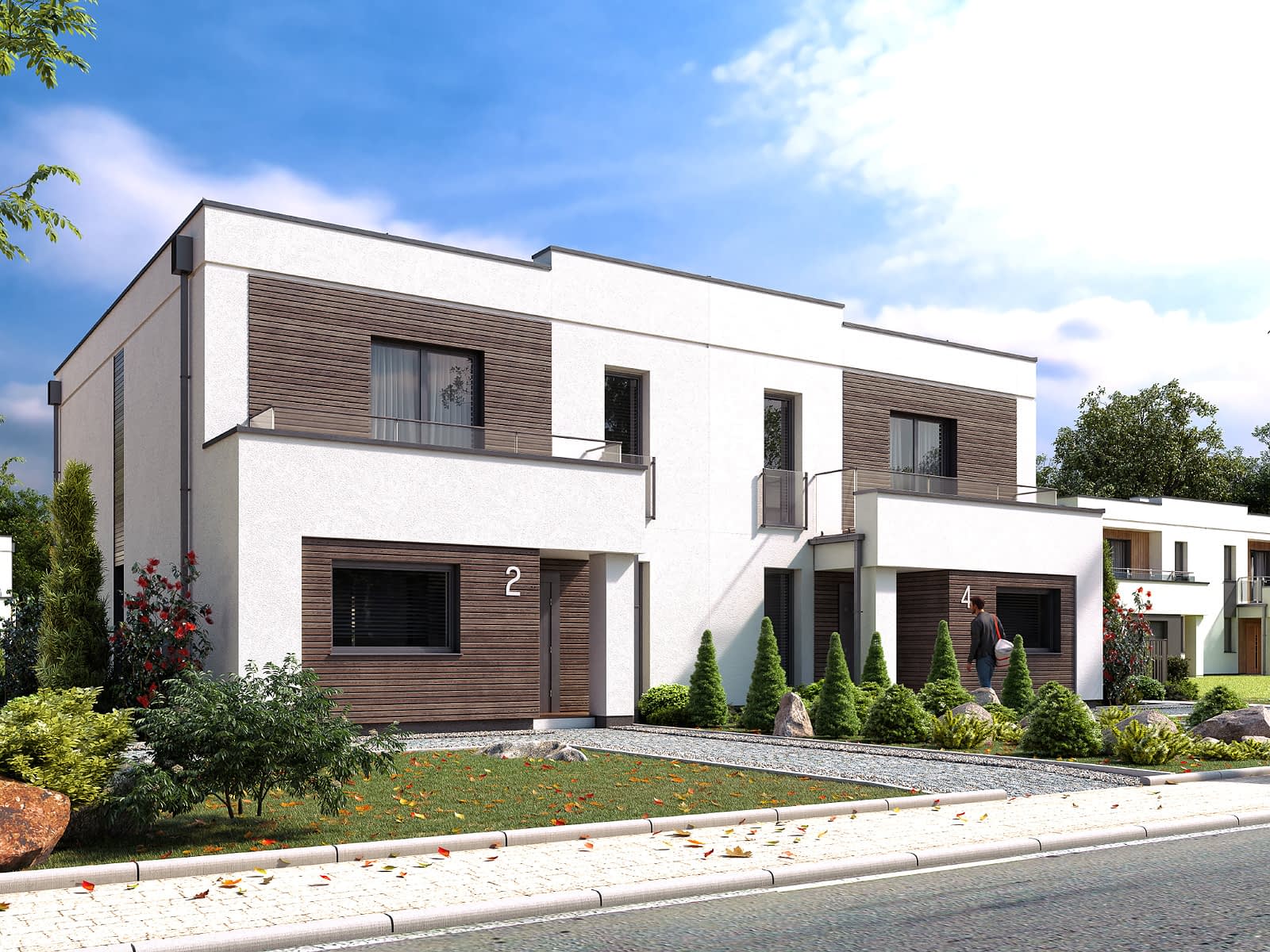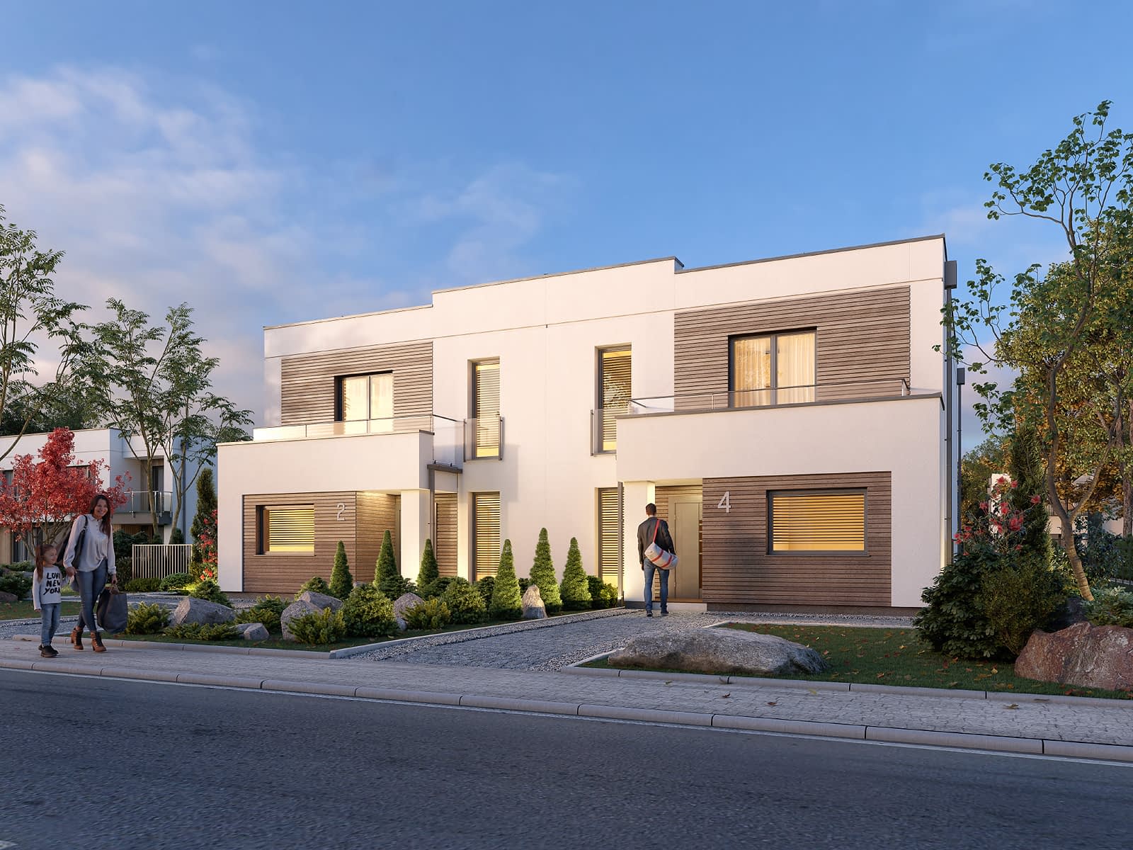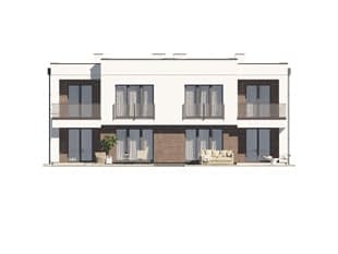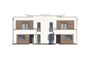 MIODOWY 2 to projekt domu w zabudowie bliźniaczej posiadający dwa pełne piętra. Minimalistyczna bryła utrzymana została w nowoczesnym stylu. Na elewacji pojawił się biały tynk i szalówka w kolorze naturalnego drewna. Całość zdobią szklane balustrady, które na tle modernistycznej bryły wyglądają naprawdę pięknie. Na parterze zaprojektowano salon, jadalnię oraz zamknięta kuchnię. Układ funkcjonalny parteru dopełnia dodatkowy pokój oraz łazienka. Na piętrze zaprojektowano trzy wygodne sypialnie i ogólnodostępną łazienkę. Projekt domu w zabudowie bliźniaczej to świetna propozycja dla osób, które chciałby mieszkać wspólnie z rodziną, ale posiadać własne podwórko i przestrzeń dla siebie.Konstrukcja