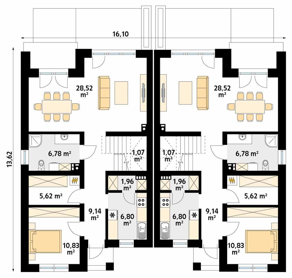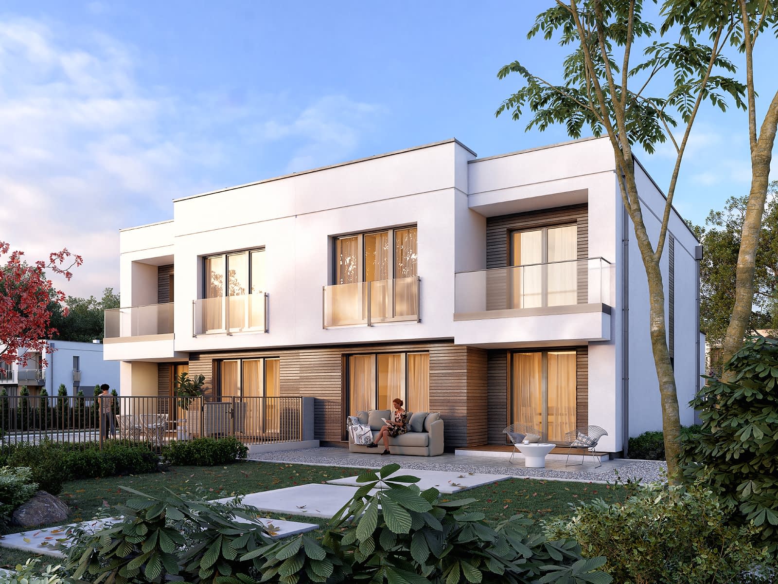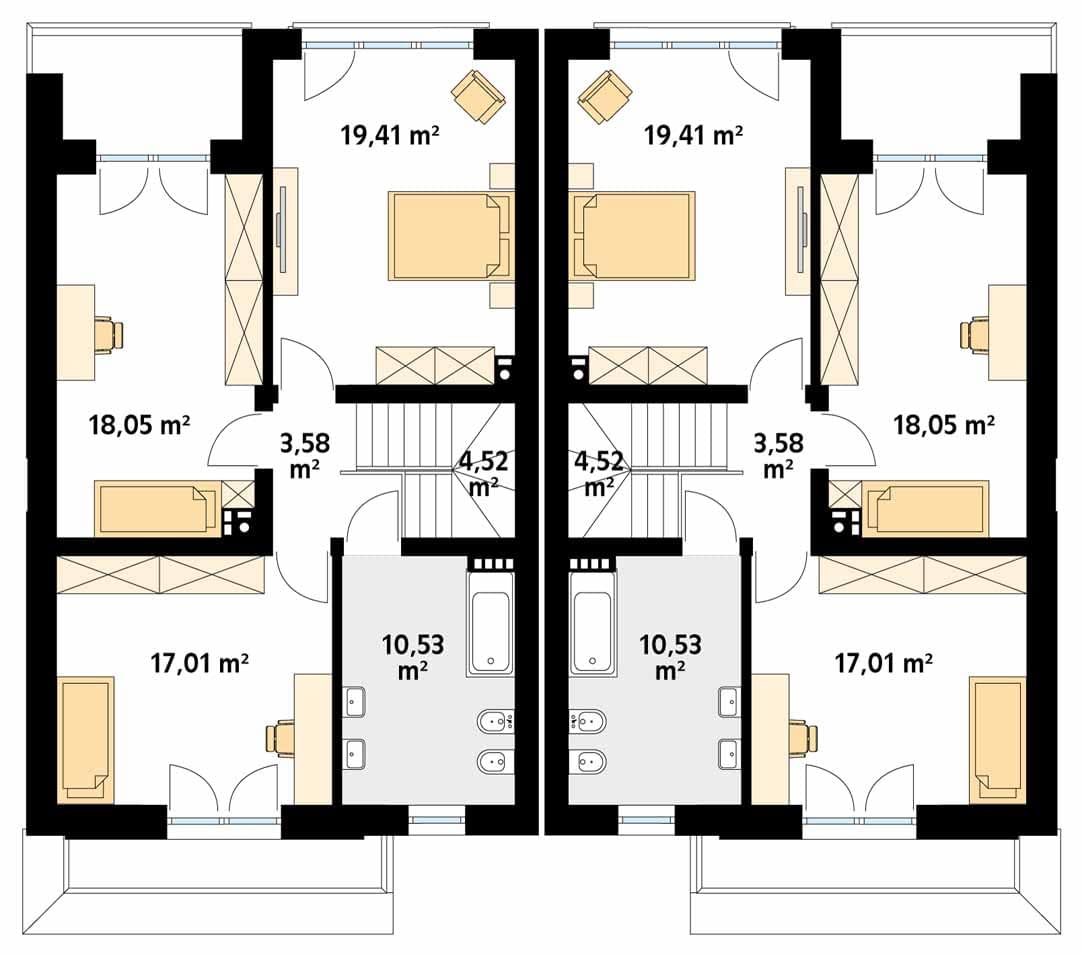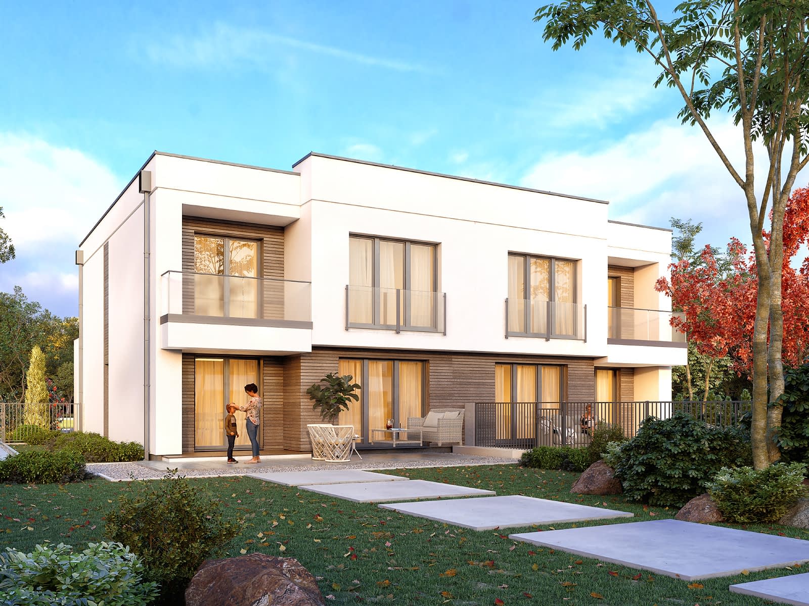 MIODOWY 2 to projekt domu w zabudowie bliźniaczej posiadający dwa pełne piętra. Minimalistyczna bryła utrzymana została w nowoczesnym stylu. Na elewacji pojawił się biały tynk i szalówka w kolorze naturalnego drewna. Całość zdobią szklane balustrady, które na tle modernistycznej bryły wyglądają naprawdę pięknie. Na parterze zaprojektowano salon, jadalnię oraz zamknięta kuchnię. Układ funkcjonalny parteru dopełnia dodatkowy pokój oraz łazienka. Na piętrze zaprojektowano trzy wygodne sypialnie i ogólnodostępną łazienkę. Projekt domu w zabudowie bliźniaczej to świetna propozycja dla osób, które chciałby mieszkać wspólnie z rodziną, ale posiadać własne podwórko i przestrzeń dla siebie.Konstrukcja